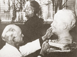 Скульптор Георг Фуг ваяет бюст поэтессы Агнесс Мигель в 1960 году. |