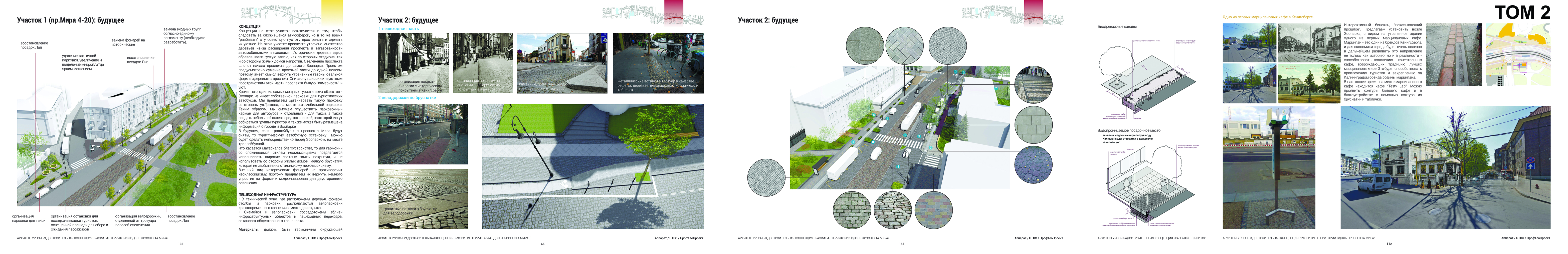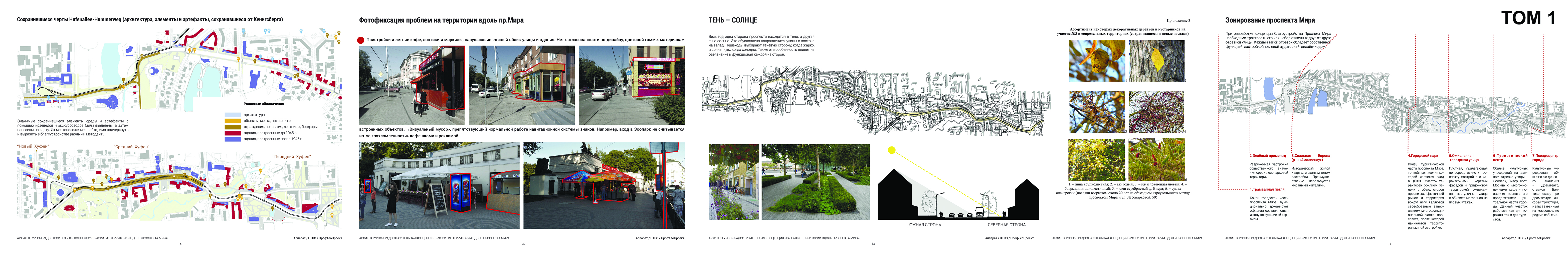 С целью подготовки решений благоустройства городской среды, учитывающих особенности проектной территории, авторами проведён комплексный анализ проспекта Мира (социологическое исследование, анализ изменения структуры и облика улицы, зданий в довоенный и послевоенный период, анализ типов профилей улицы, анализ транспортной нагрузки, анализ сложившихся архитектурных стилей застройки, колористика районов, анализ состояния озеленения). ОМ 1 – Методология проекта.