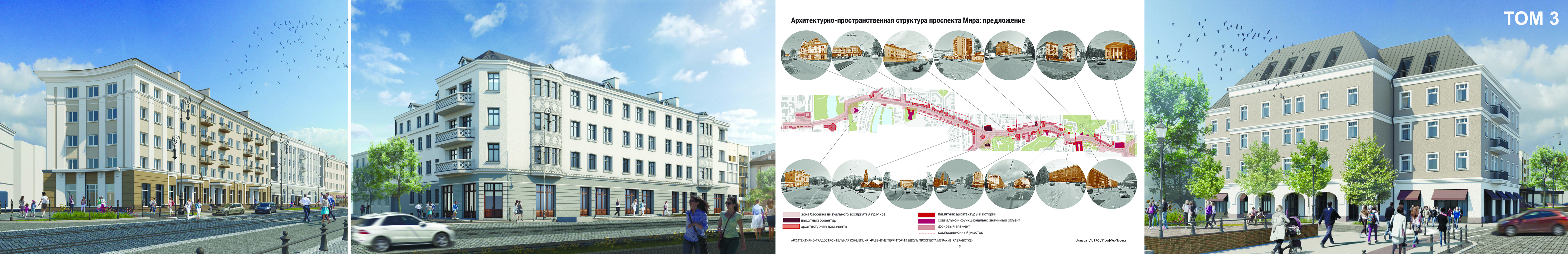 Решения по колористике фасадов зданий приняты на основании предпроектного анализа планировочной структуры проспекта Мира, выявившего архитектурно-градостроительную иерархию зданий (от общего к частному), высотные ориентиры проспекта, доминанты и фоновые элементы, цветовые композиции элементов с учетом исторической значимости, а так же социального и функционального значения, учтённые при проектировании. При принятии решений по разработке облика фасадов зданий архитекторы опирались на архивные материалы, при необходимости фрагментарно восстанавливая исторический архитектурный облик, сохраняя существующие архитектурно-декоративные элементы фасадов: карнизы, пилястры, колонны, лепнину и т.п.ОМ 3 – Фасады(Перечень зданий Том 3).
