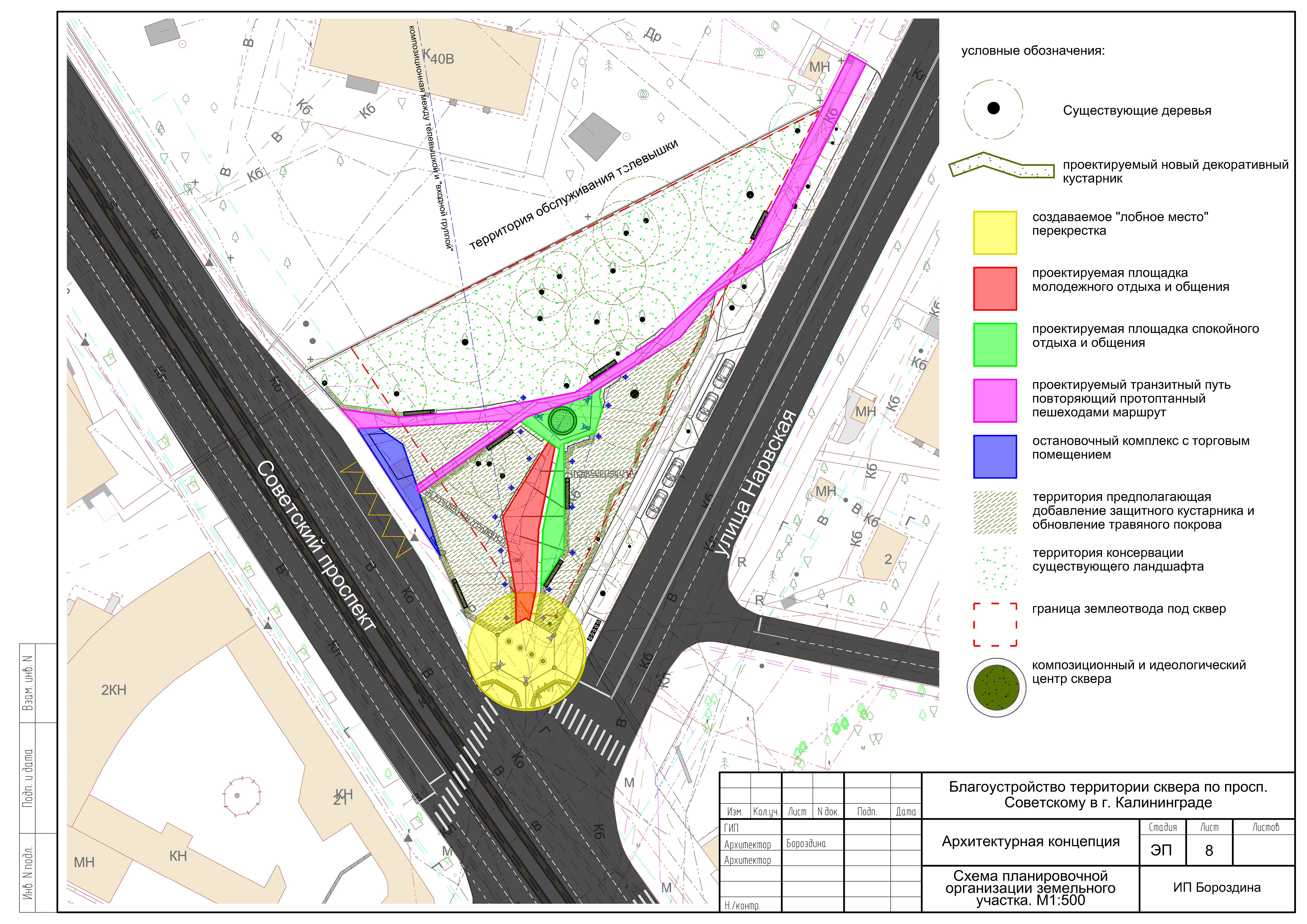 Итогом работы по благоустройству, по мнению авторов проекта, должен стать уютный уголок для отдыха и прогулок, минимально затрагивающий ландшафт и в то же время ограждающий посетителей сквера от интенсивного транспортного потока просп. Советского и ул. Нарвской.