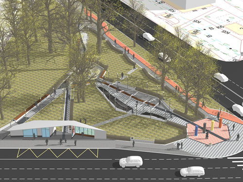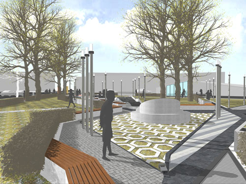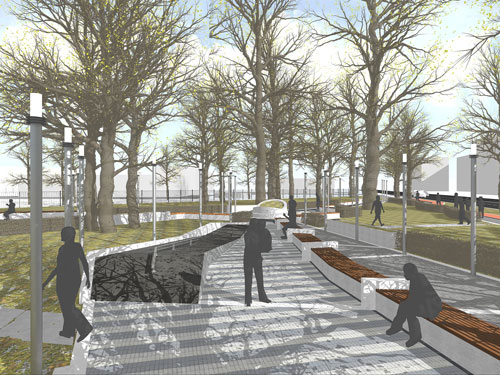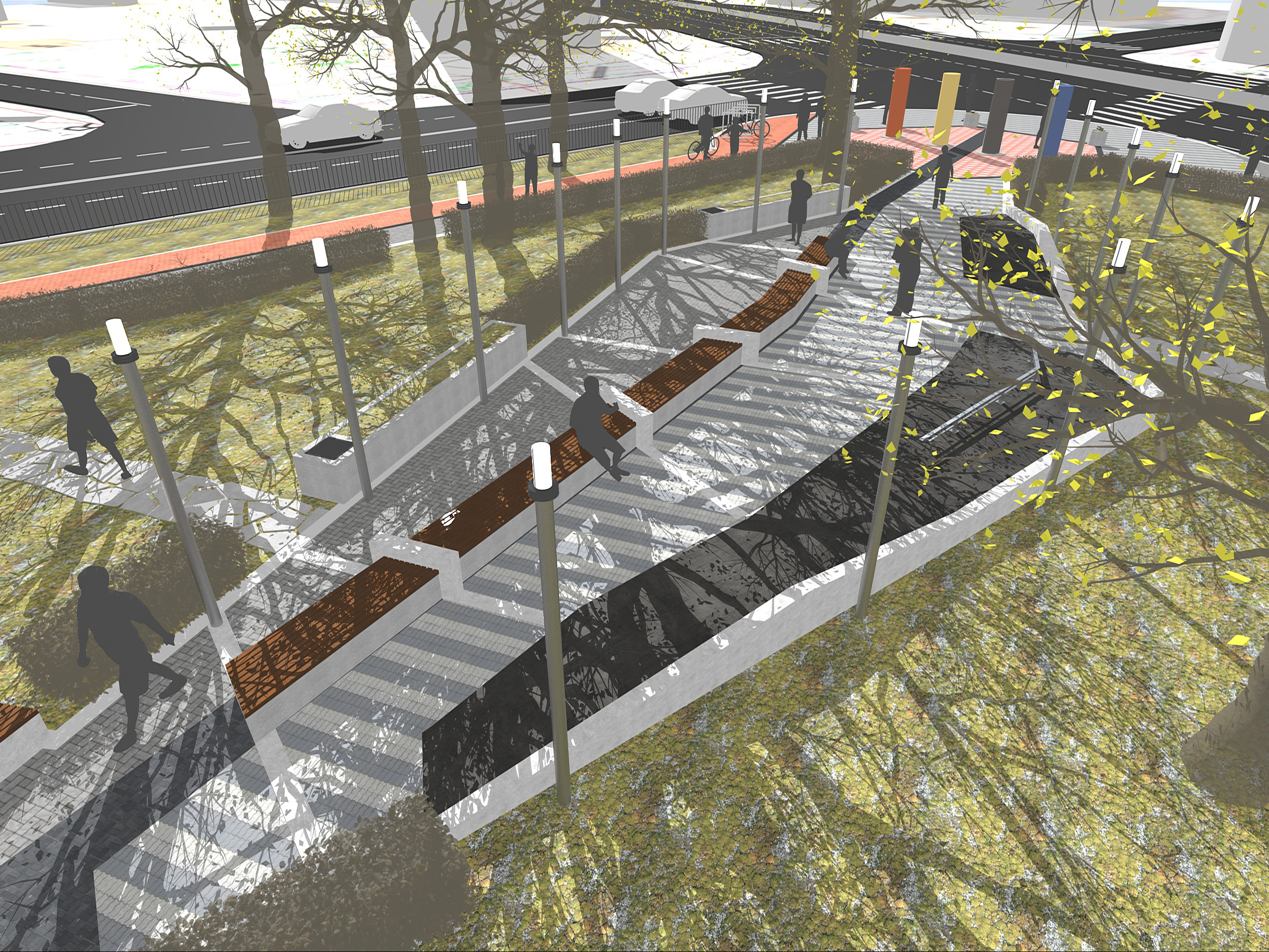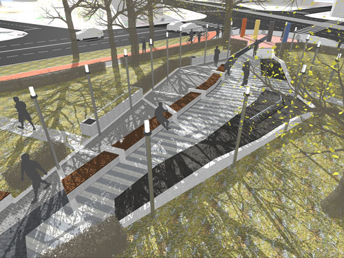 - зона отдыха, с установкой скамеек, интегрированных в ландшафт, фонарей, малых архитектурных форм. Предусмотрено так же устройство не большой рампы для катания на скейте и роликах;