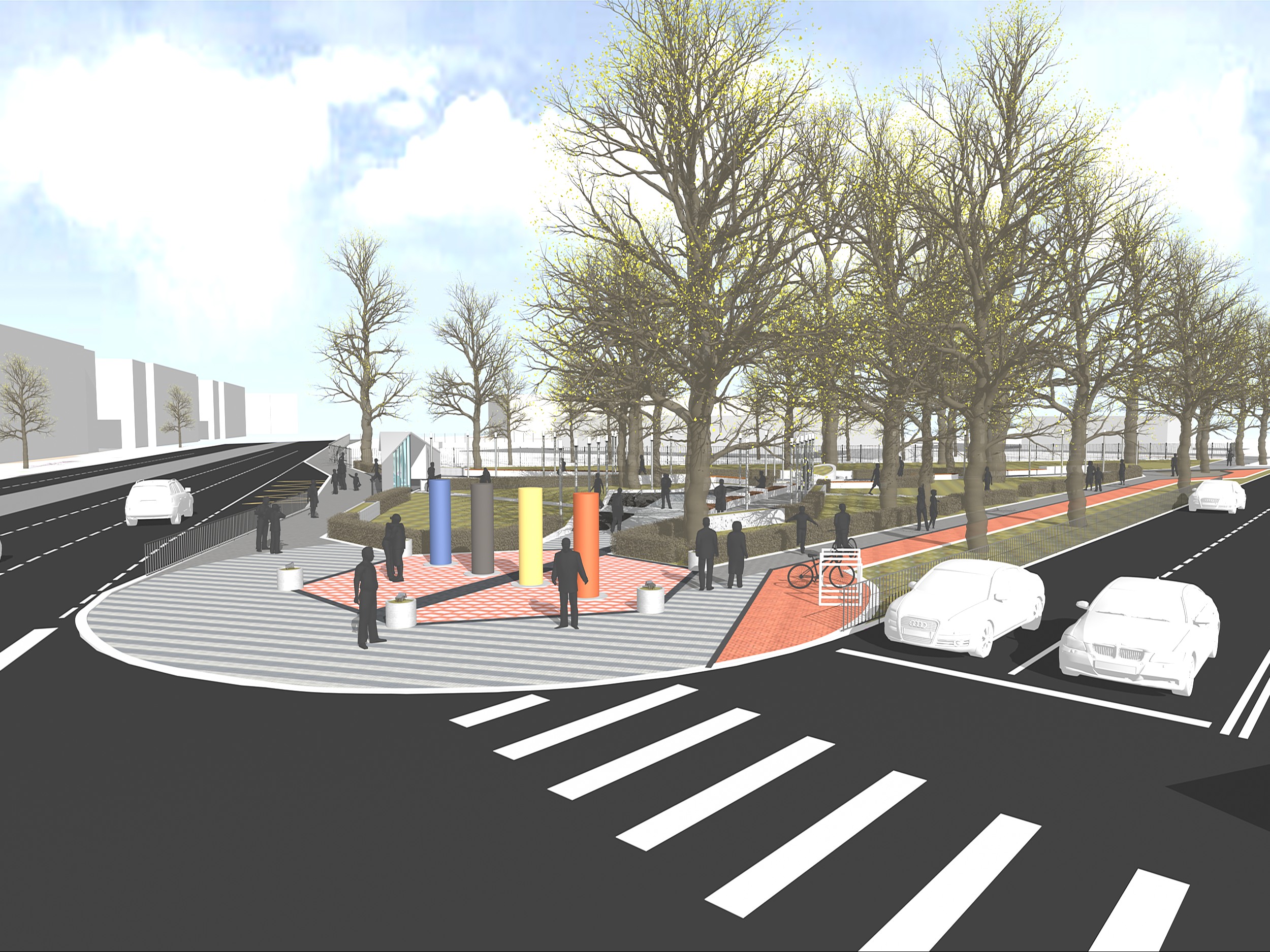 - зона перекрёстка, с установкой малых архитектурных форм в виде декоративных колонн, выступающих в роли входного портала в сквер и символизирующих четыре времени года и подчеркивающих главную ценность этого сквера - растительный ландшафт;