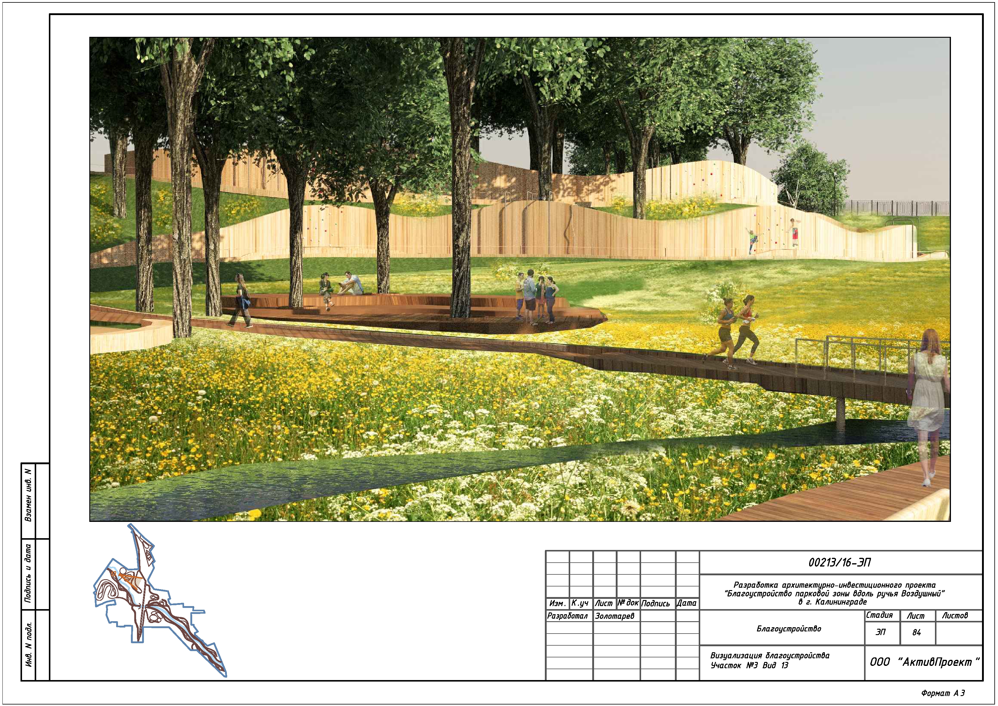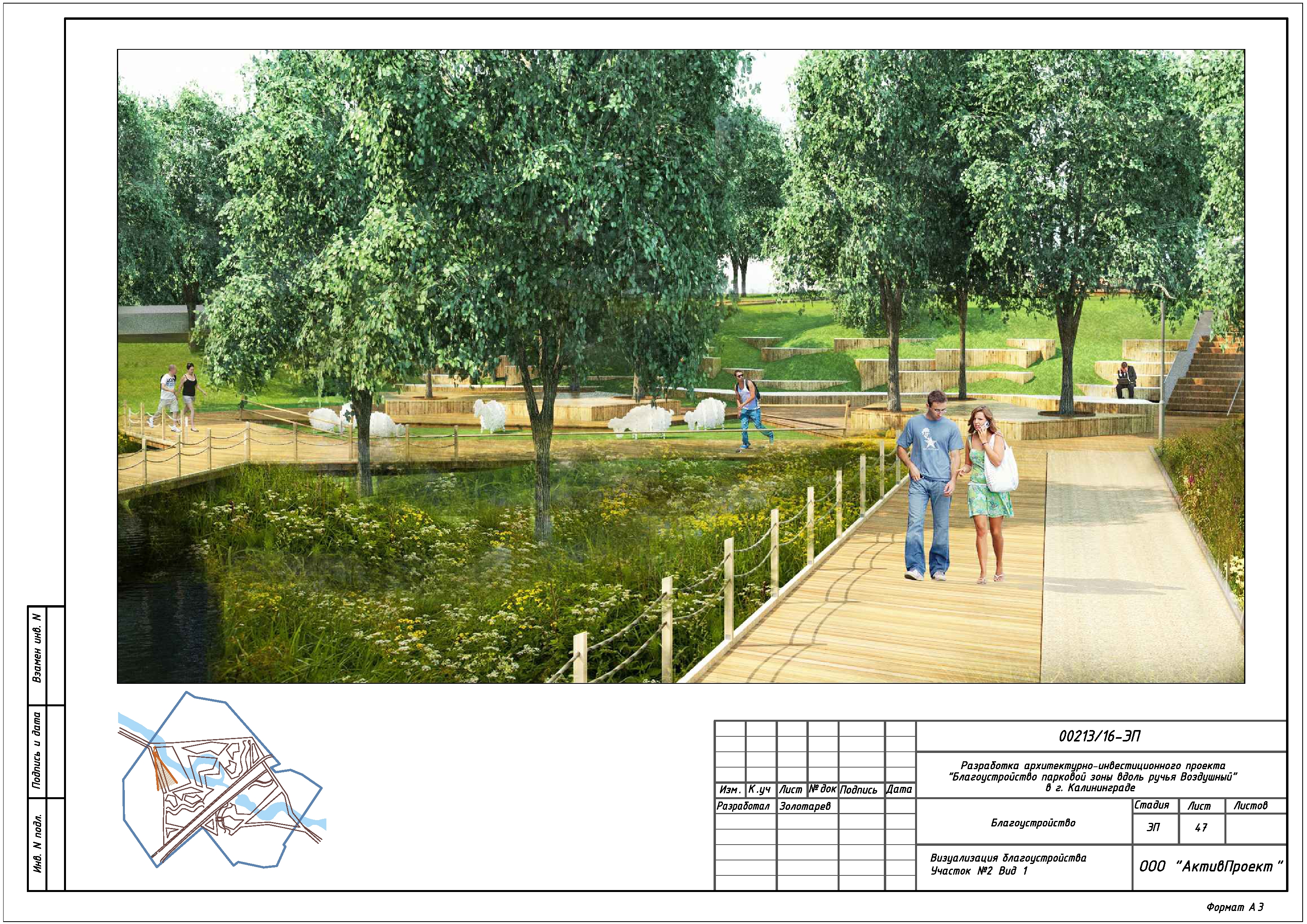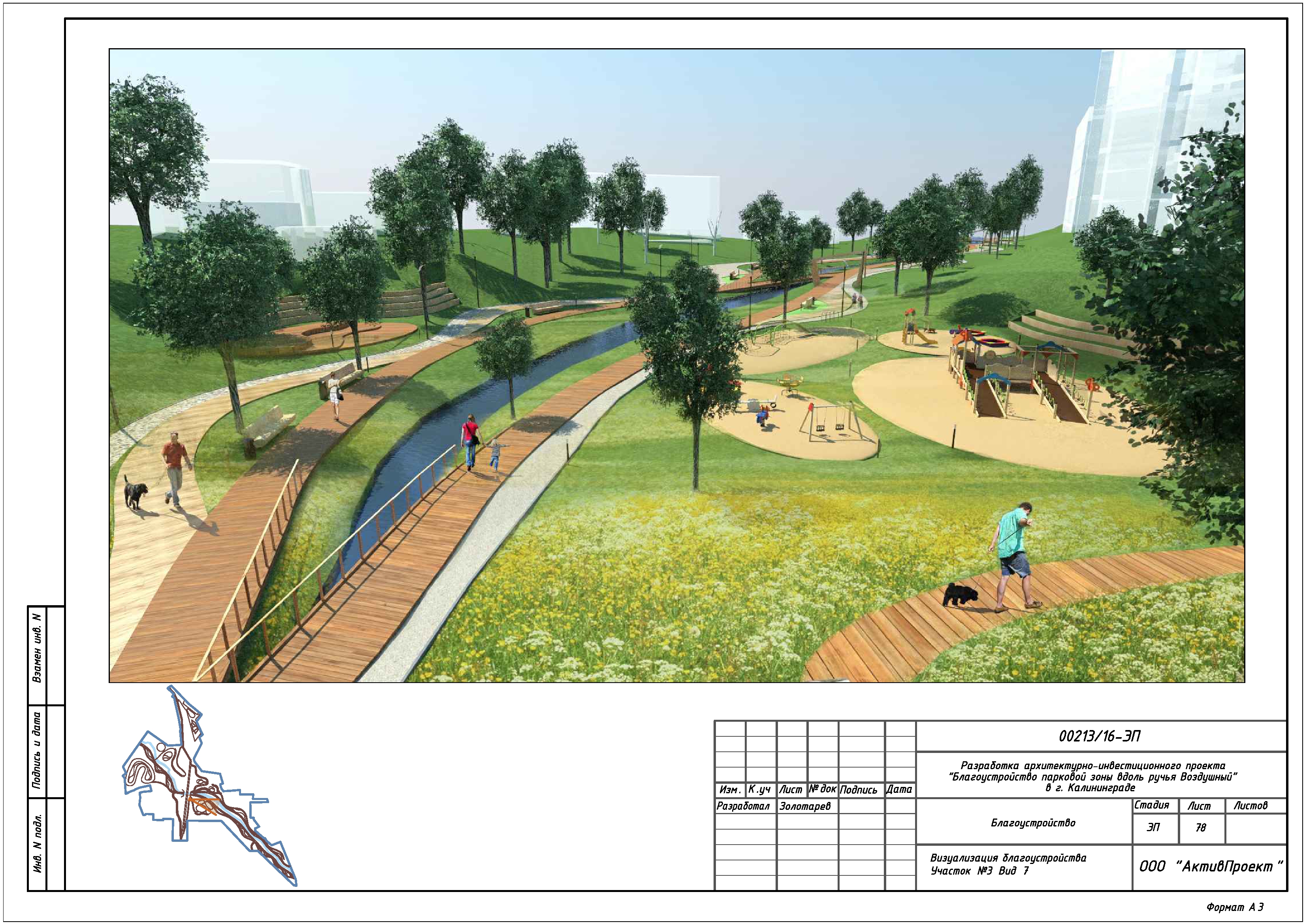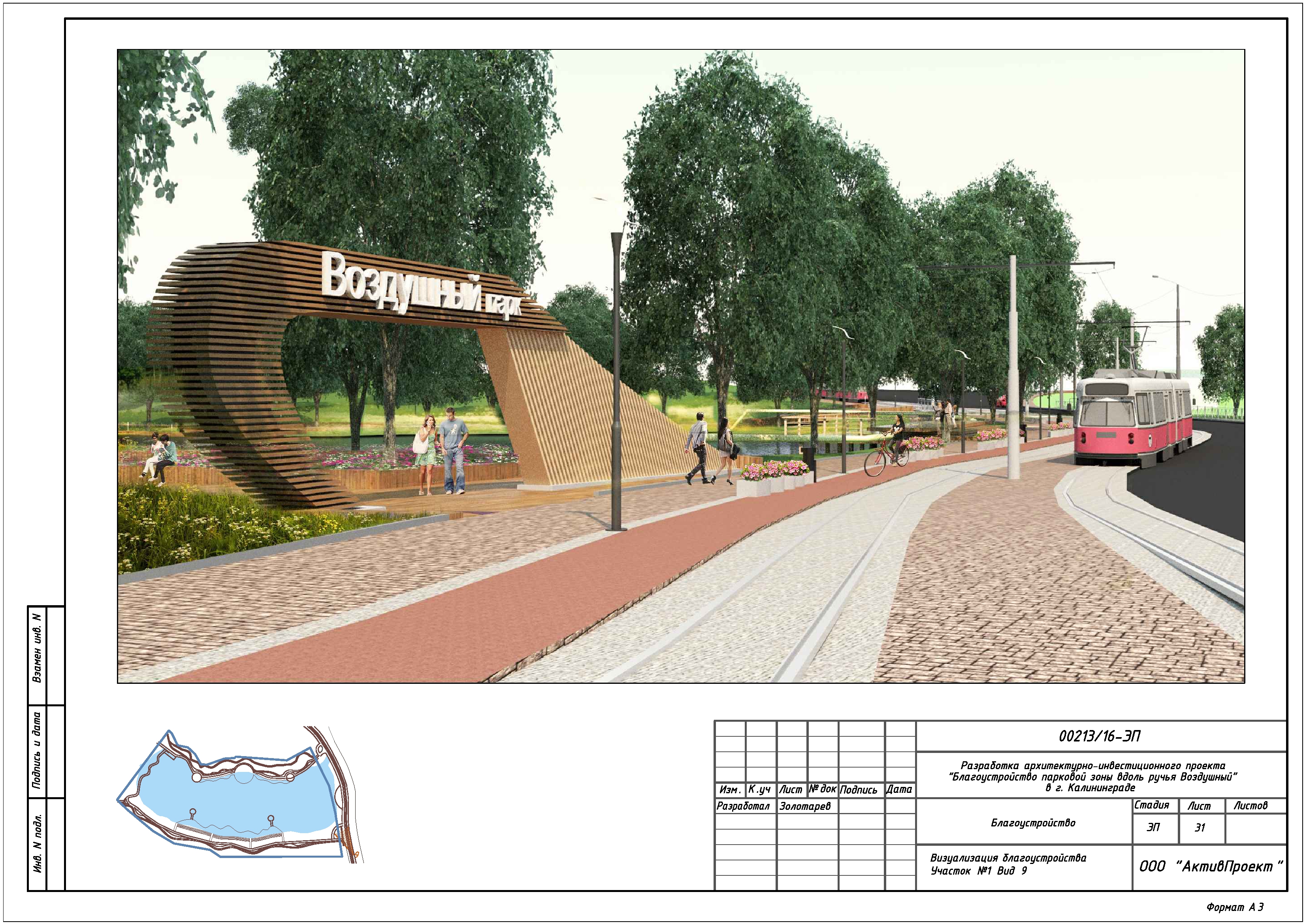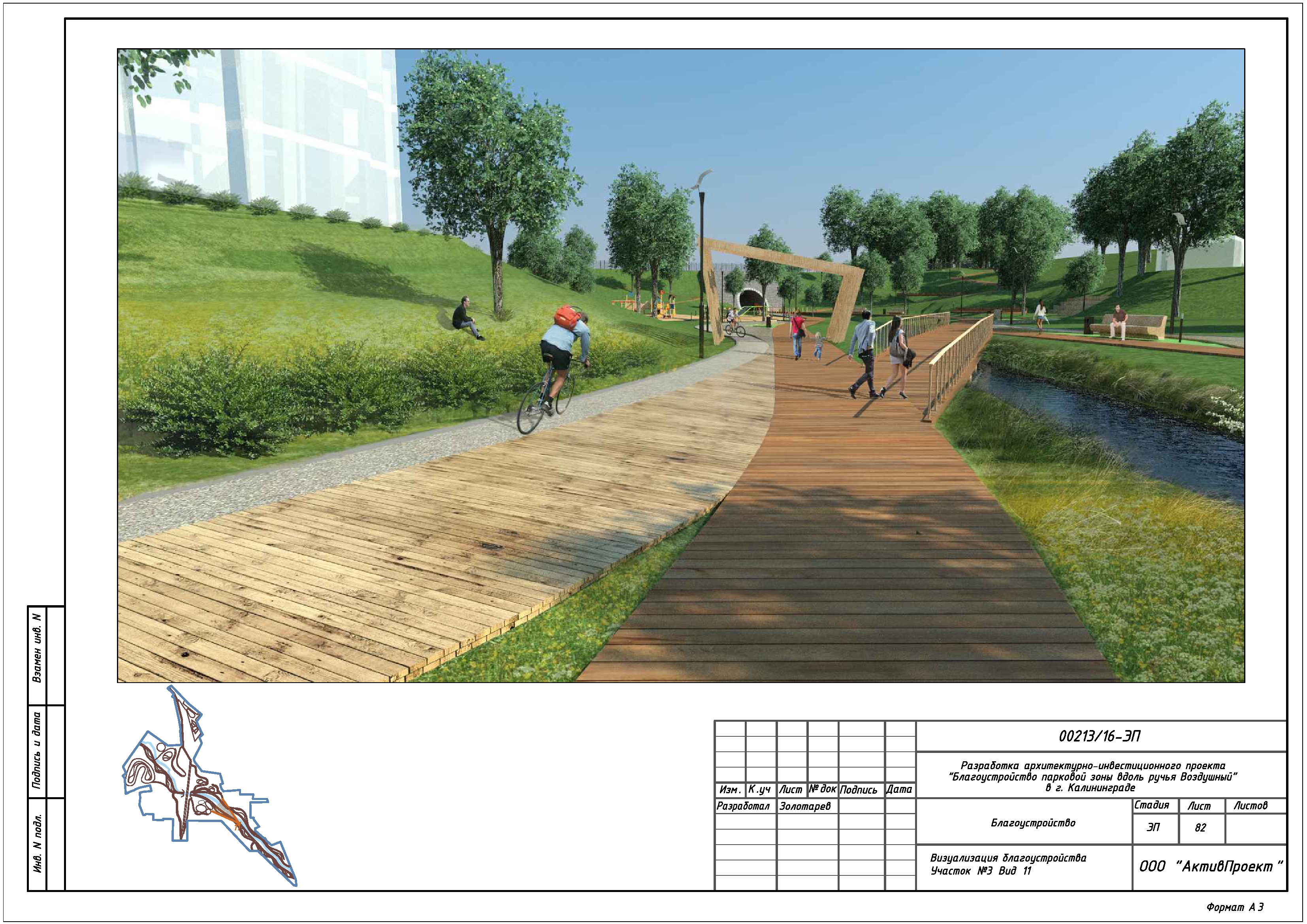 На основании муниципальной программы «Обеспечение градостроительной и архитектурной деятельности в городском округе «Город Калининград», по заказу комитета архитектуры и строительства администрации городского округа «Город Калининград», а также в рамках обеспечения деятельности по подготовке и проведению игр чемпионата мира по футболу 2018 года на территории Калининградской области, в сентябре 2016г разработан архитектурно-инвестиционный проект «Благоустройство парковой зоны вдоль ручья Воздушного в г. Калининграде».