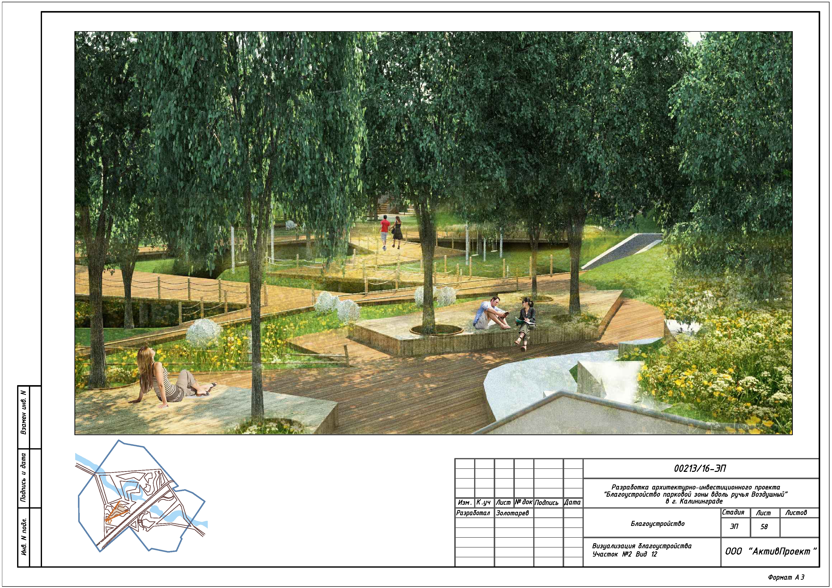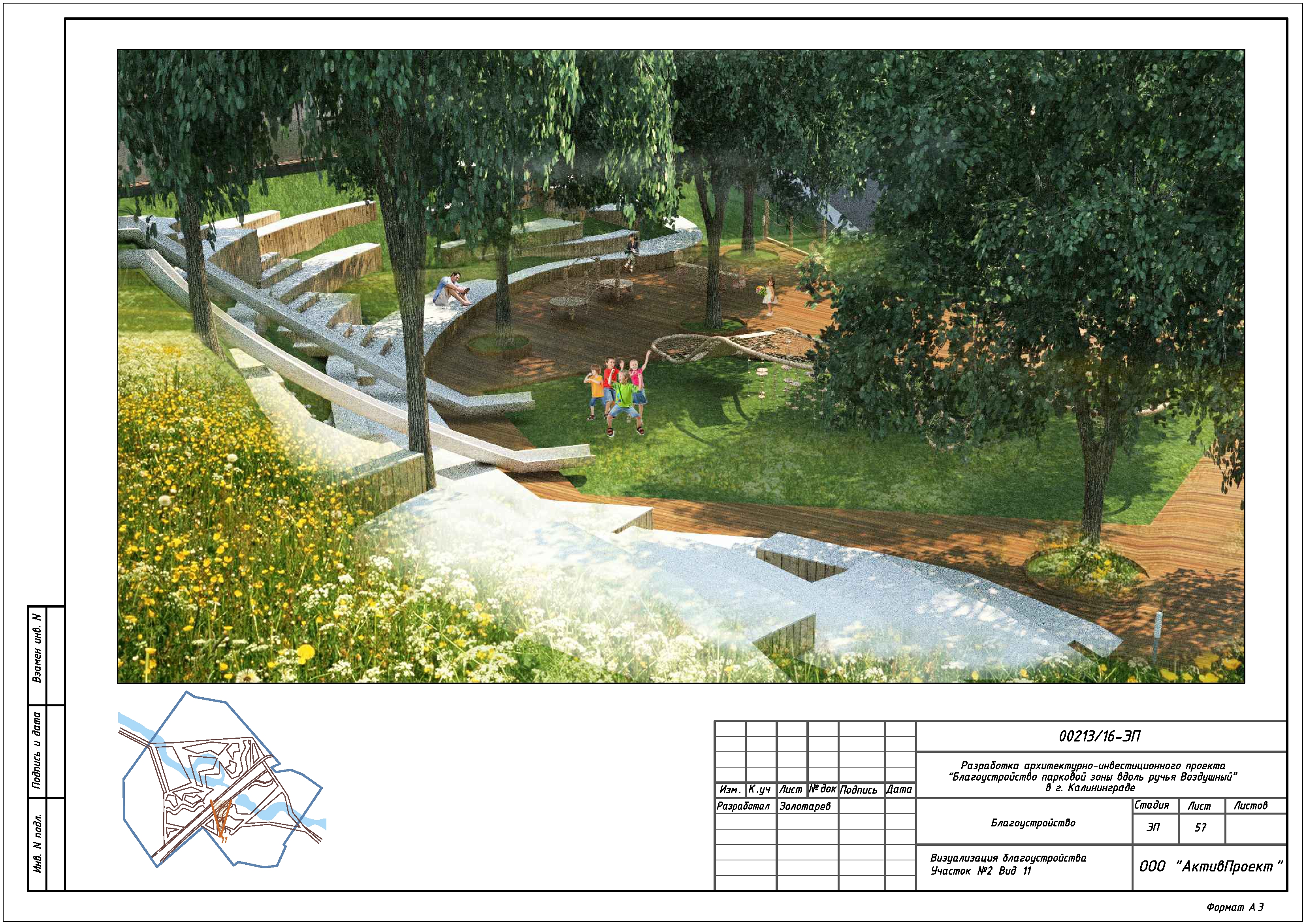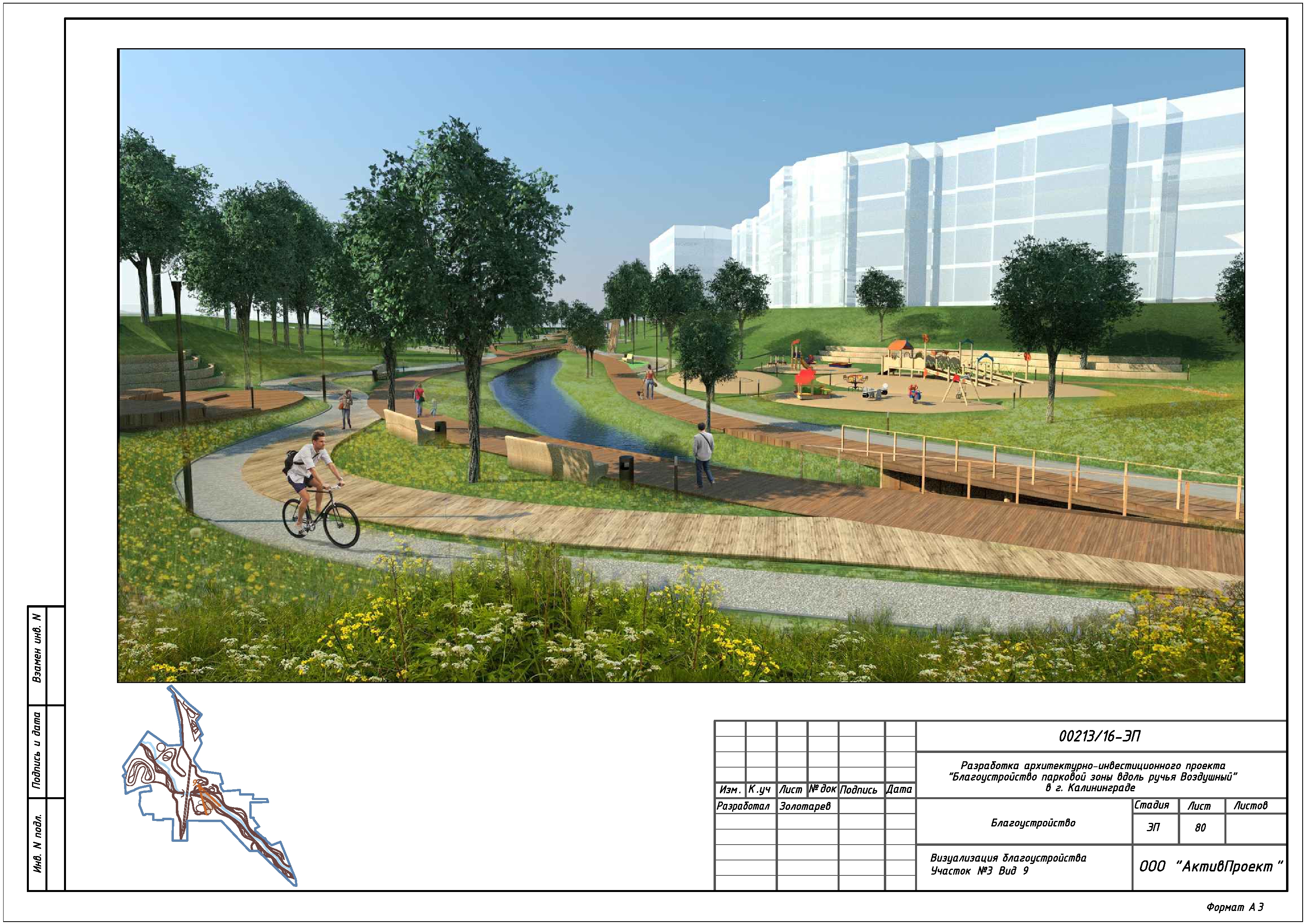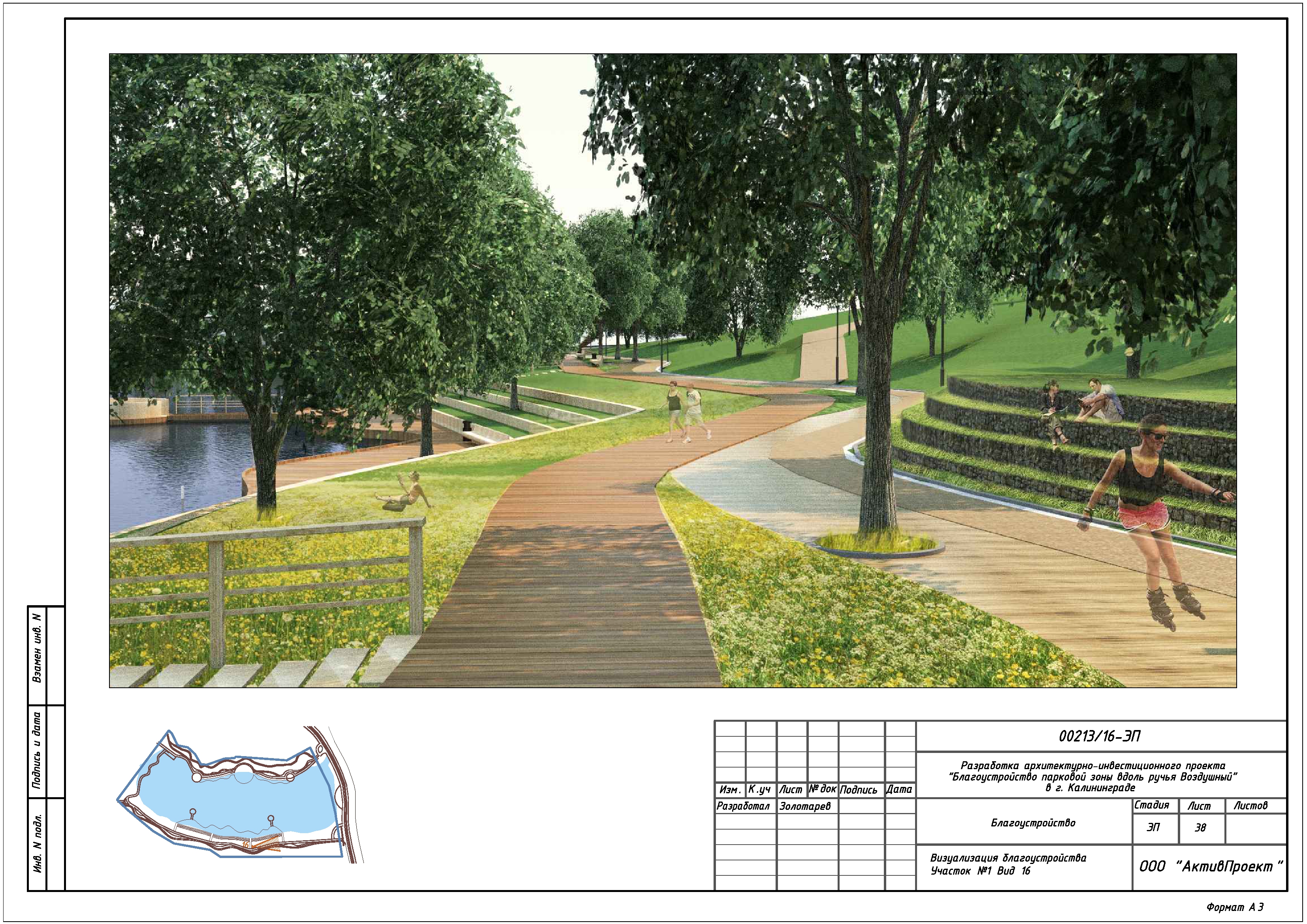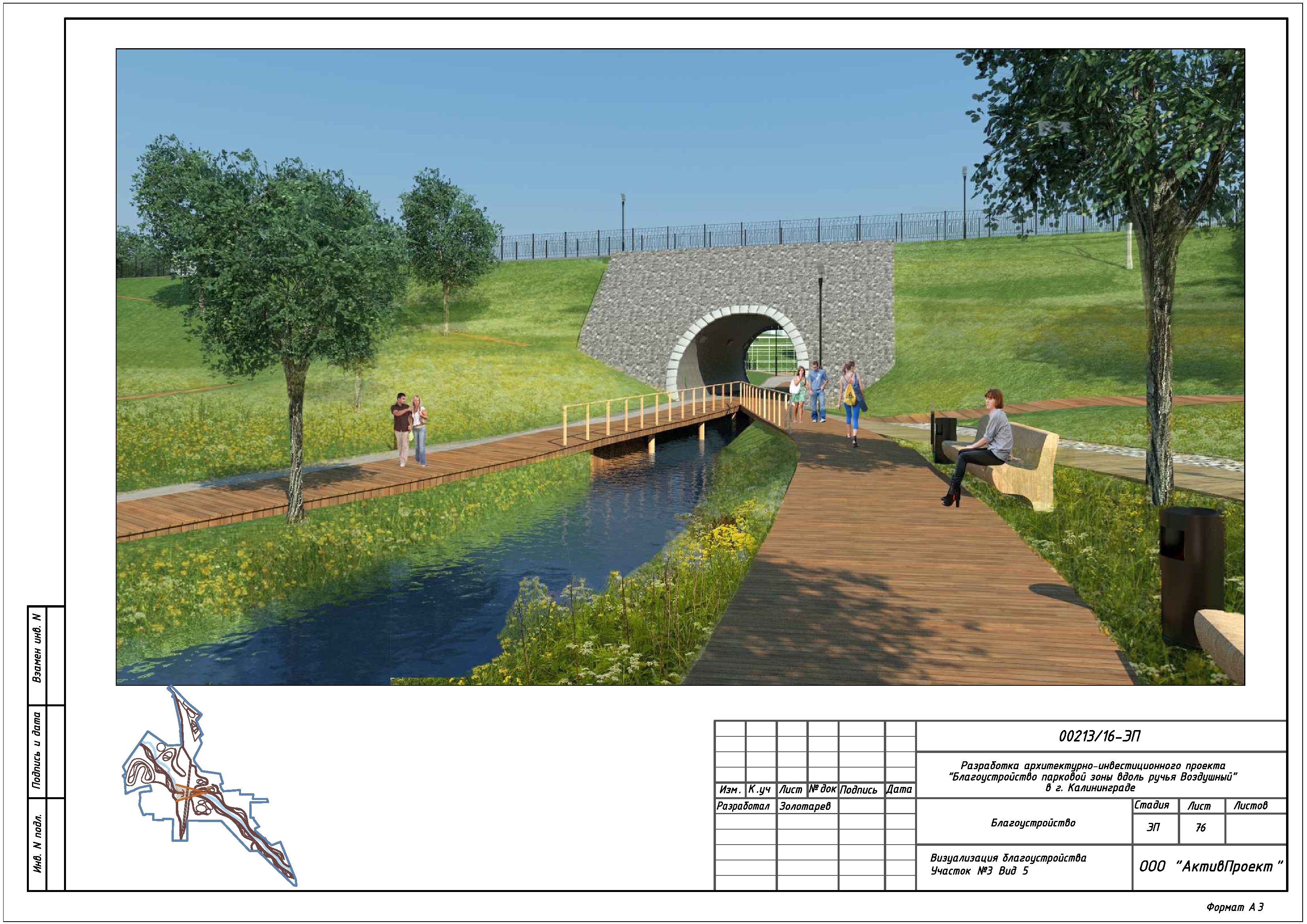 На основании муниципальной программы «Обеспечение градостроительной и архитектурной деятельности в городском округе «Город Калининград», по заказу комитета архитектуры и строительства администрации городского округа «Город Калининград», а также в рамках обеспечения деятельности по подготовке и проведению игр чемпионата мира по футболу 2018 года на территории Калининградской области, в сентябре 2016г разработан архитектурно-инвестиционный проект «Благоустройство парковой зоны вдоль ручья Воздушного в г. Калининграде».