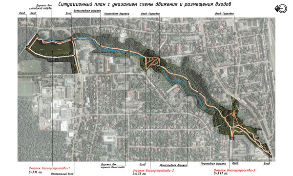 Участок №3 – в районе пересечения ручья воздушного акведуком у многоквартирного жилого дома по ул. Красносельская №18, предлагается организовать парковую рекреационную зону для активного отдыха с устройством детской и спортивной площадок, размещением уличных тренажеров, памптрека, скалодрома, пешеходных тропинок, велосипедных дорожек. Выполнить террасирование склонов на уже сложившемся рельефе с устройством площадок для отдыха.