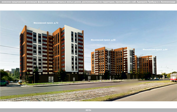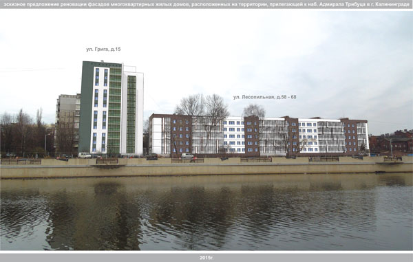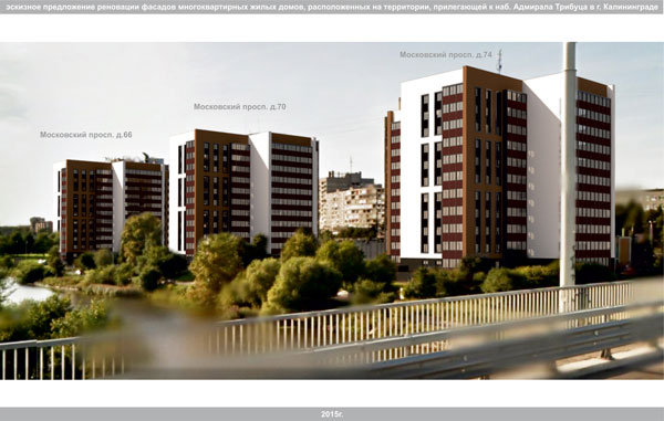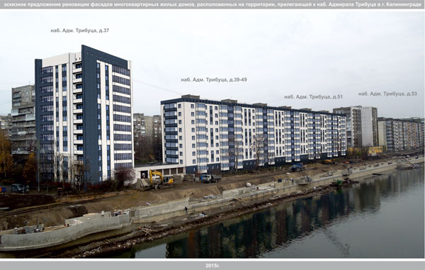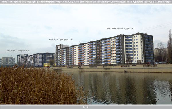 Для решения этих задач комитетом архитектуры и строительства администрации городского округа «Город Калининград» в 2015г. подготовлена «Концепция реновации фасадов многоквартирных жилых домов, расположенных на территории прилегающей к набережной Адм. Трибуца» включающая в себя эскизные предложения по колористическому решению фасадов домов.
