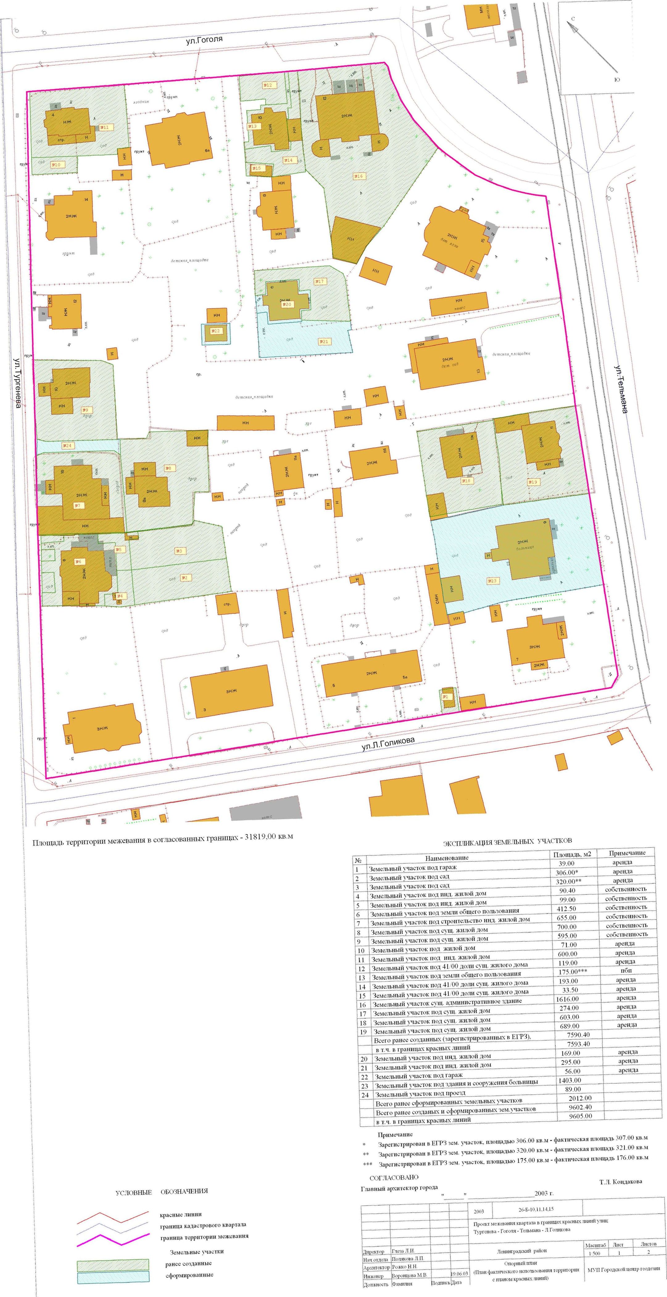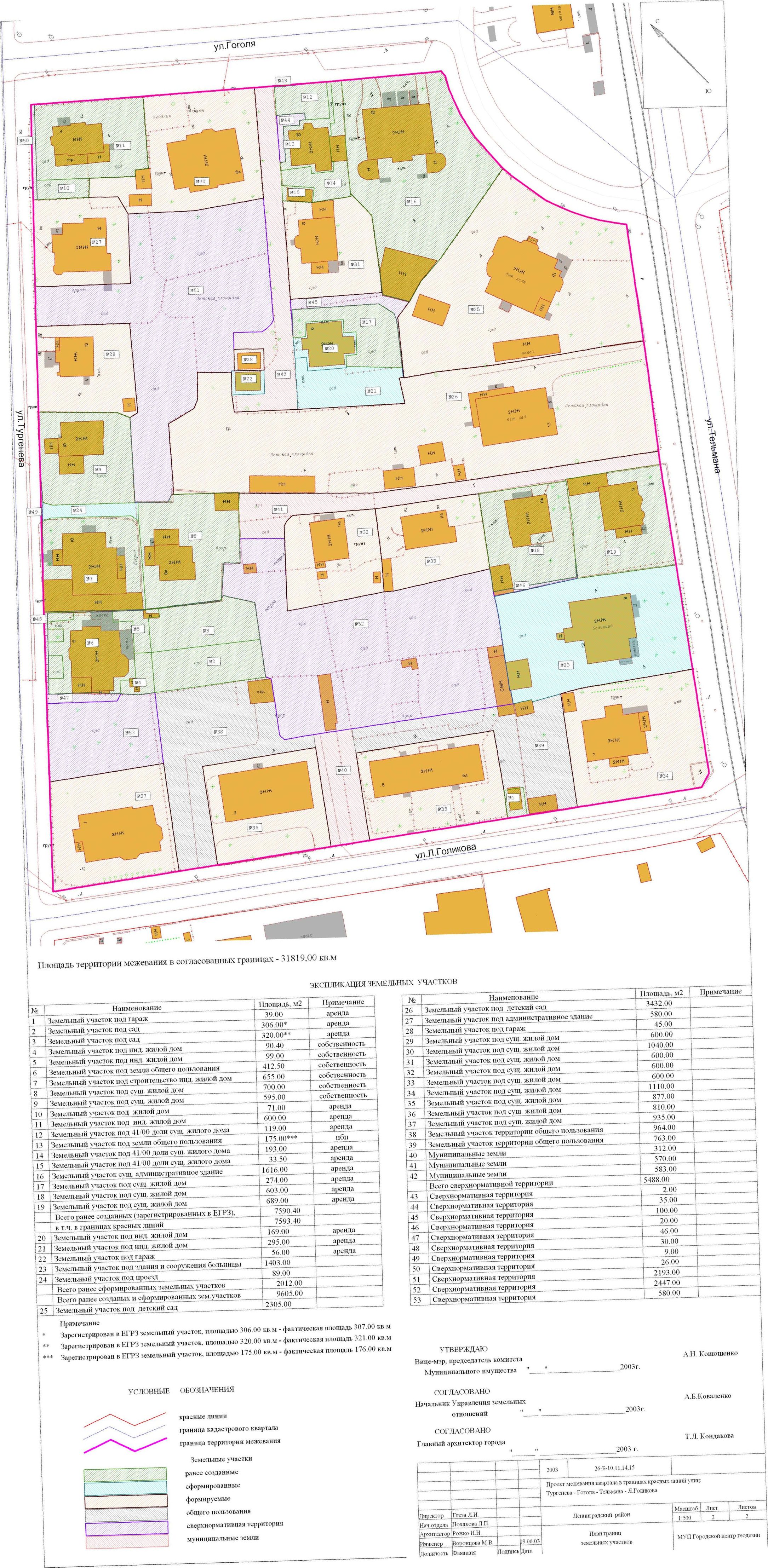 | Материалы проекта: | Постановление № 2428 от 17.10.2003 Опорный план План границ земельных участков Данные по нормативным и проектным площадям земельных участков Данные по существующему жилому фонду и населению Технико-экономические показатели Пояснительная записка Данные ГП |