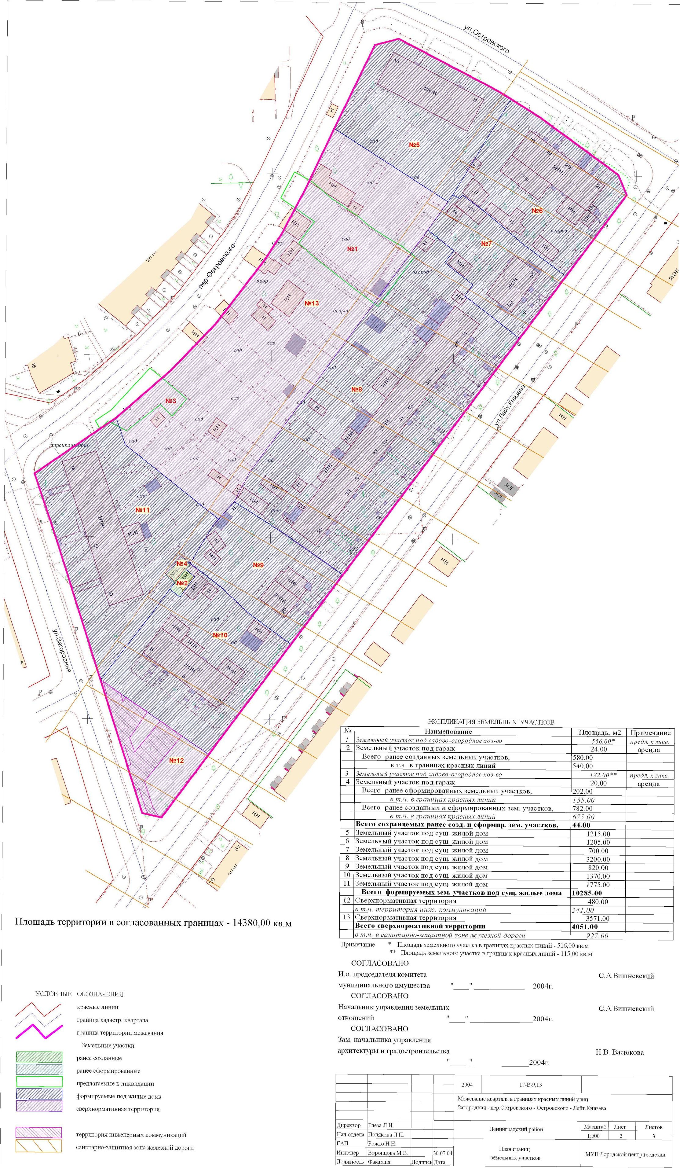 | Материалы проекта: | Постановление № 3043 от 04.11.2004 Опорный план План границ земельных участков Данные по нормативным и проектным площадям земельных участков Данные по существующему жилому фонду и населению Пояснительная записка Данные ГП |