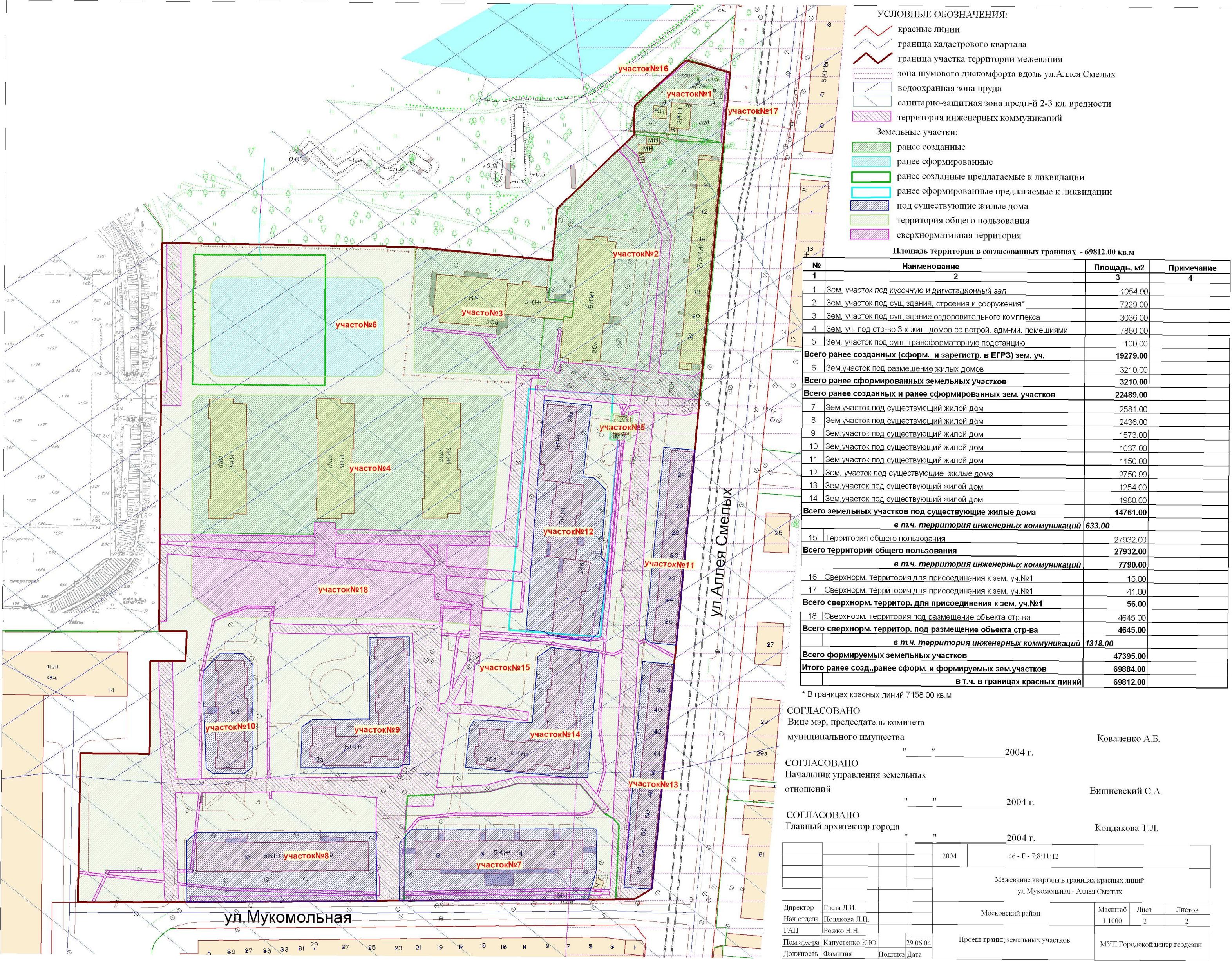 | Материалы проекта: | Постановление № 2428 от 02.09.2004 Опорный план План границ земельных участков Данные ГП Данные по нормативным и проектным площадям земельных участков Данные по существующему жилому фонду и населению Пояснительная записка |