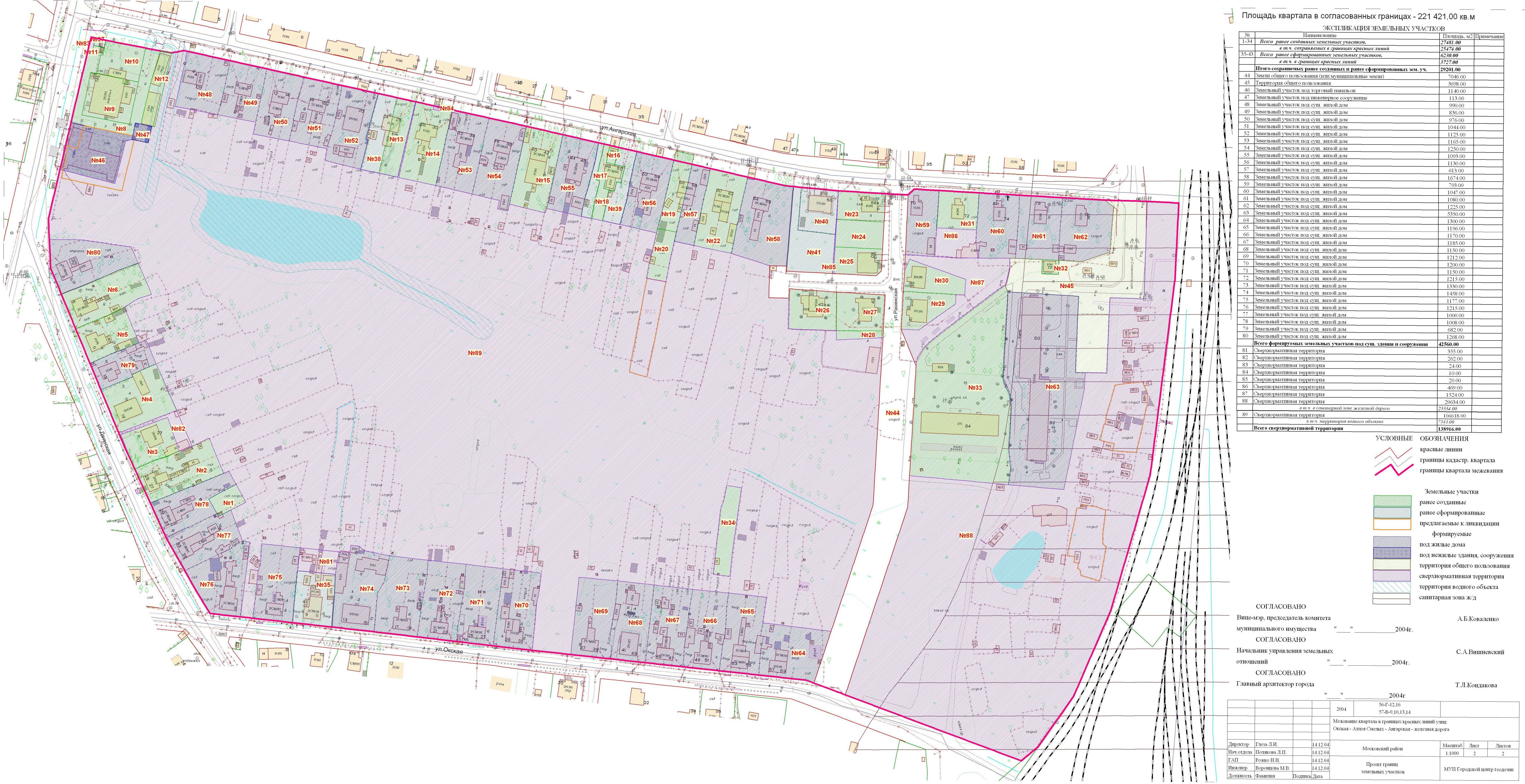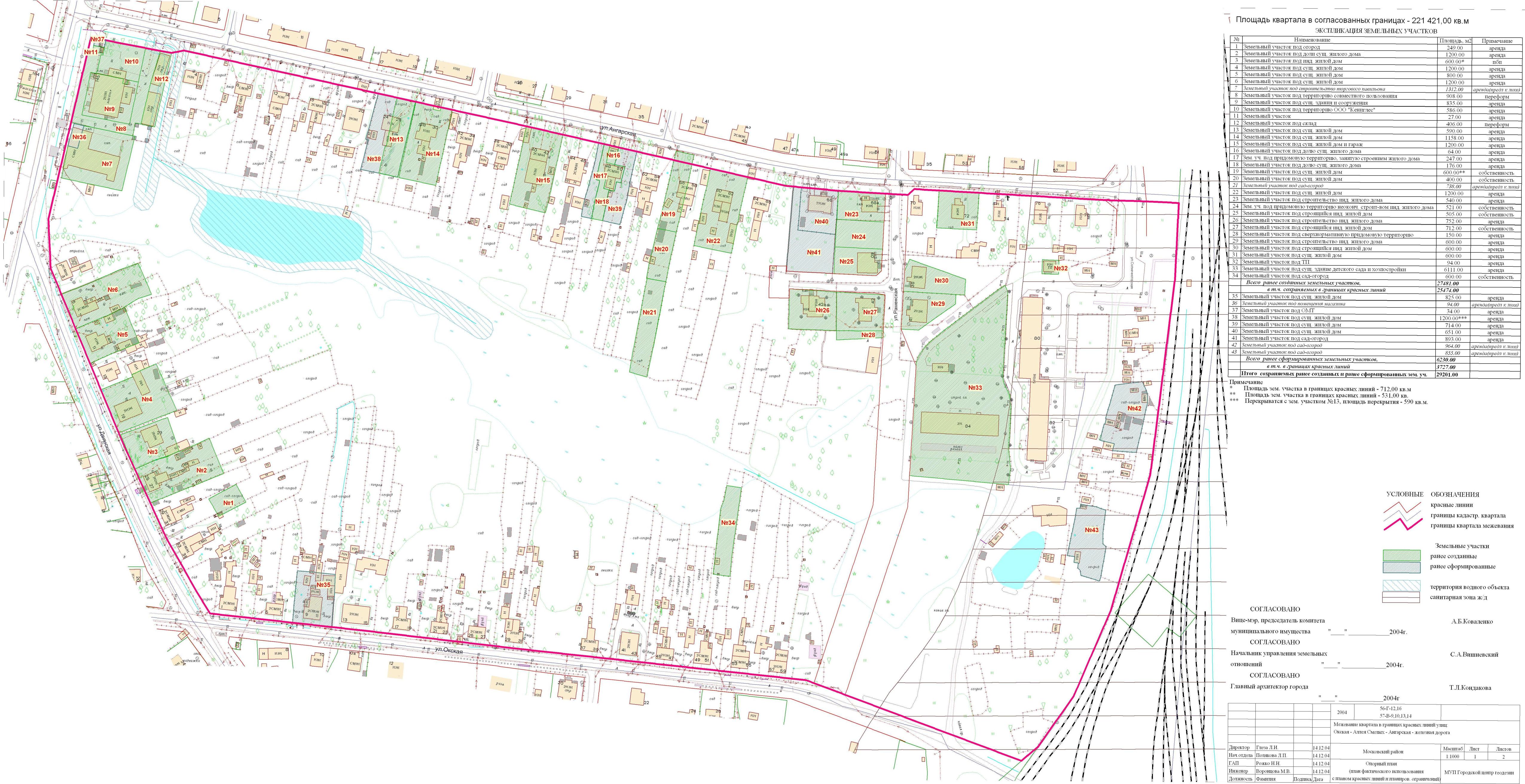 | Материалы проекта: | Постановление № 424 от 11.02.2005 Опорный план План границ земельных участков Данные ГП Данные по нормативным и проектным площадям земельных участков Данные по существующему жилому фонду и населению Пояснительная записка |