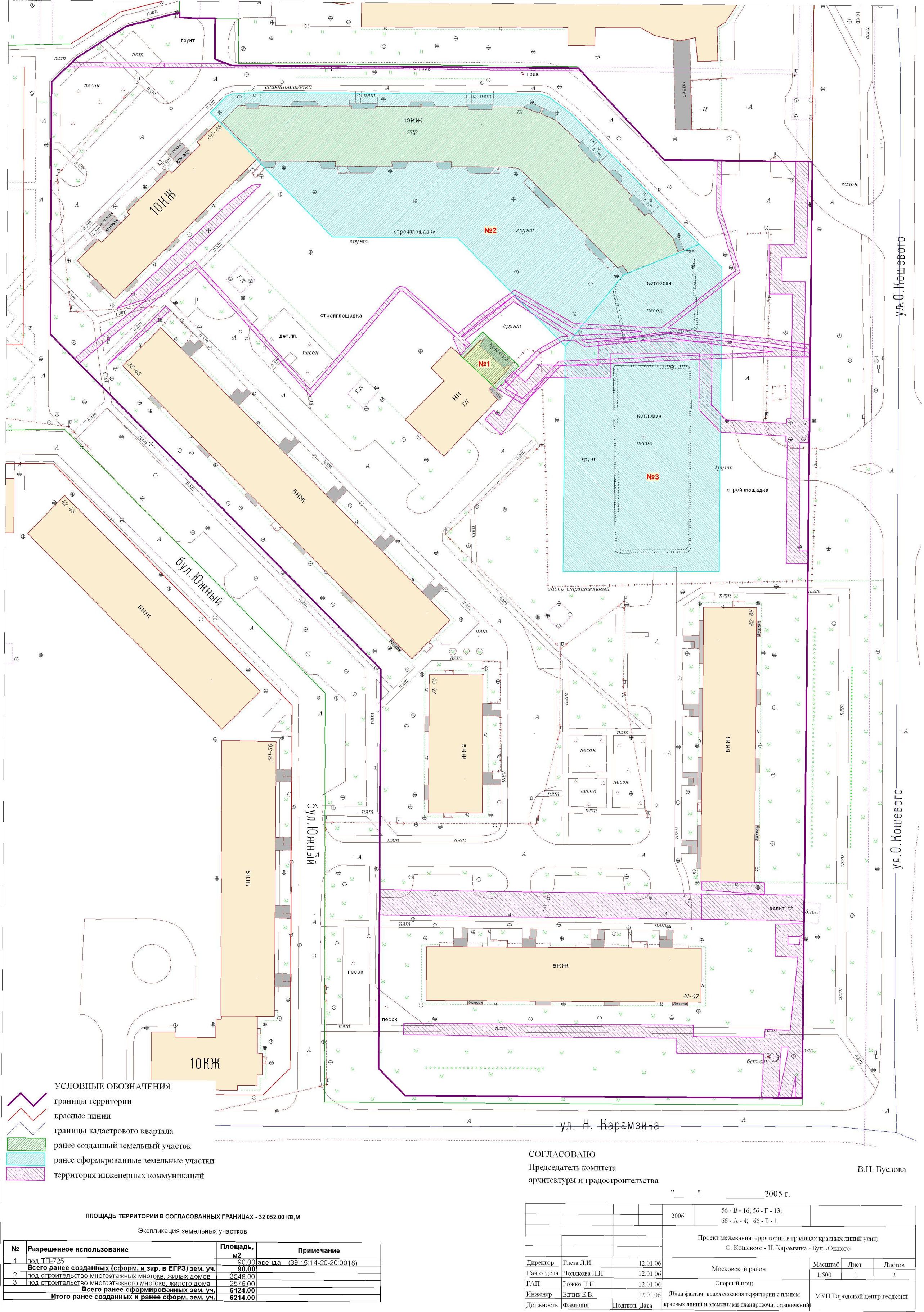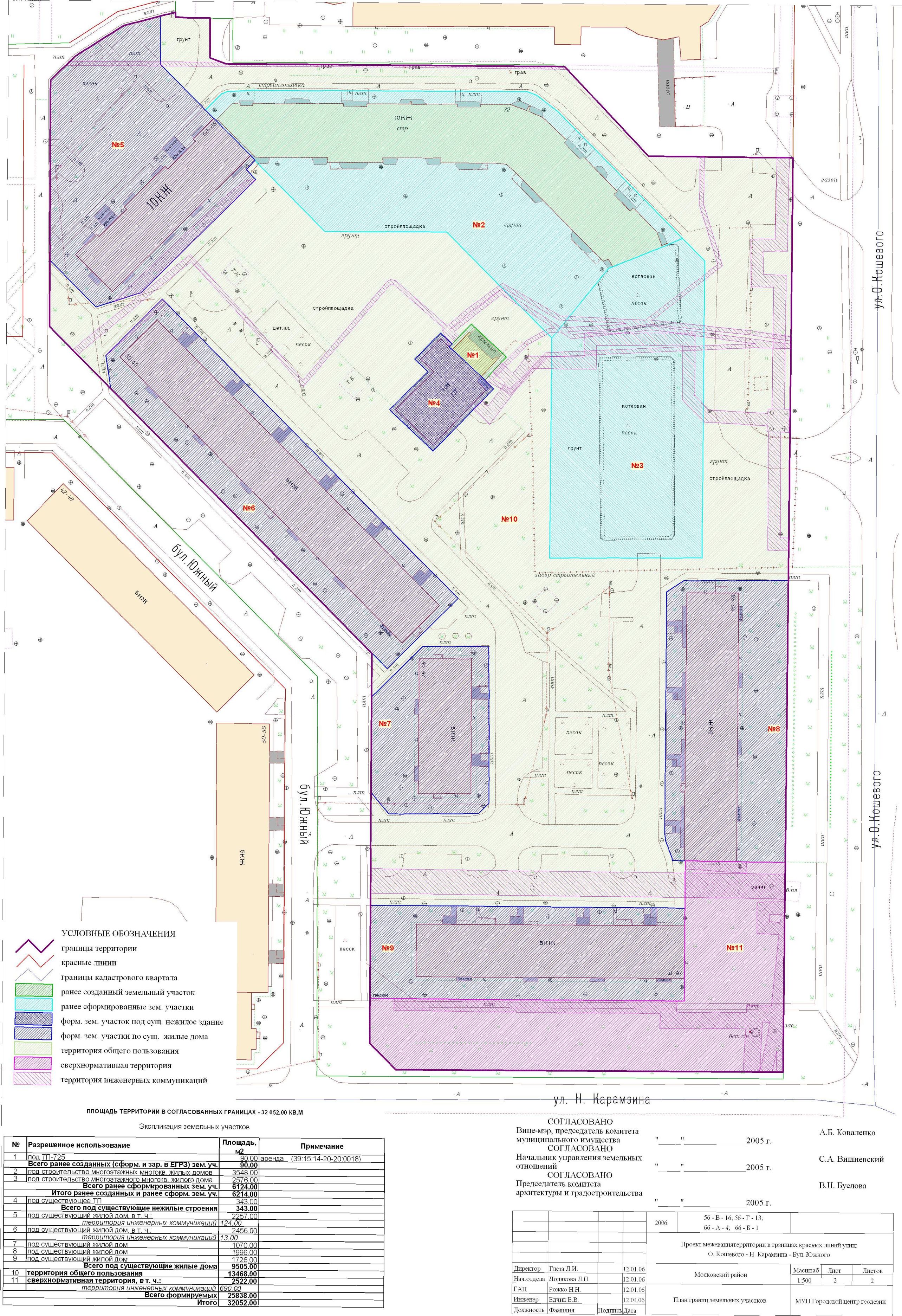 | Материалы проекта: | Постановление № 2384 от 13.10.2006 Опорный план План границ земельных участков Данные ГП Данные по нормативным и проектным площадям земельных участков Данные по существующему жилому фонду и населению Пояснительная записка Технико-экономические показатели |