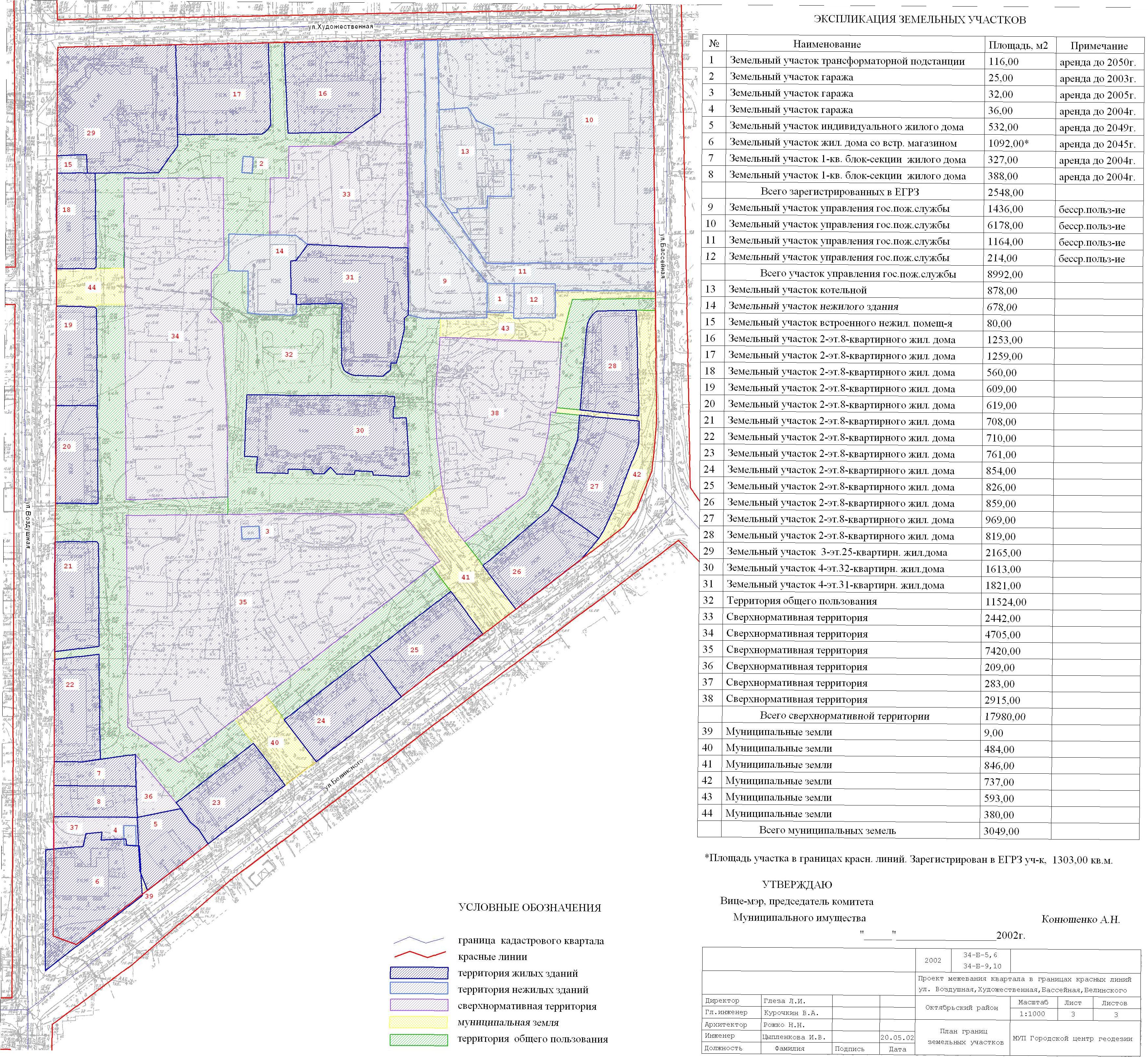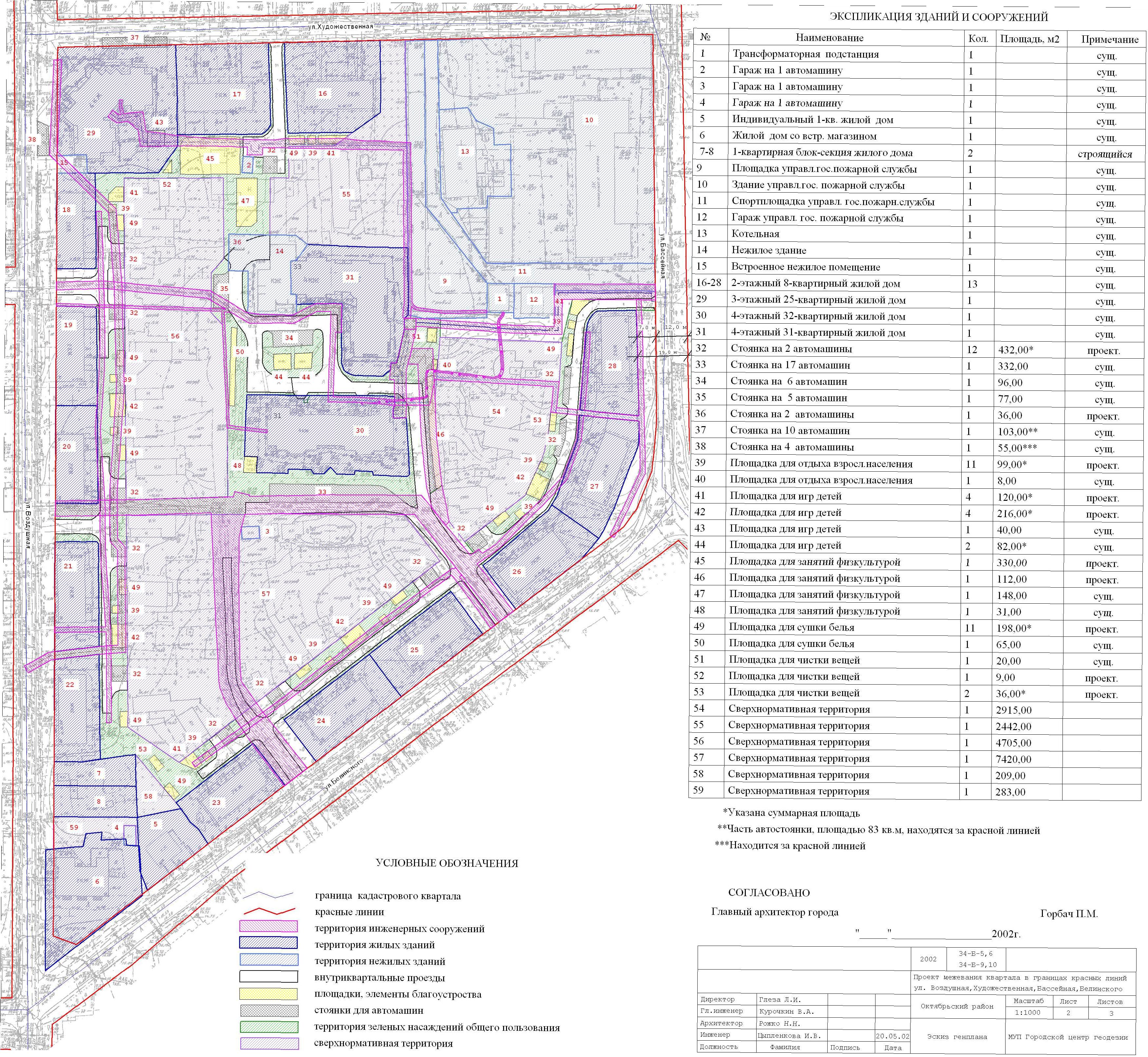 | Материалы проекта: | Постановление № 2053 от 25.07.2002 Опорный план План границ земельных участков Эскиз генерального плана Данные ГП Данные по нормативным и проектным площадям земельных участков Пояснительная записка |