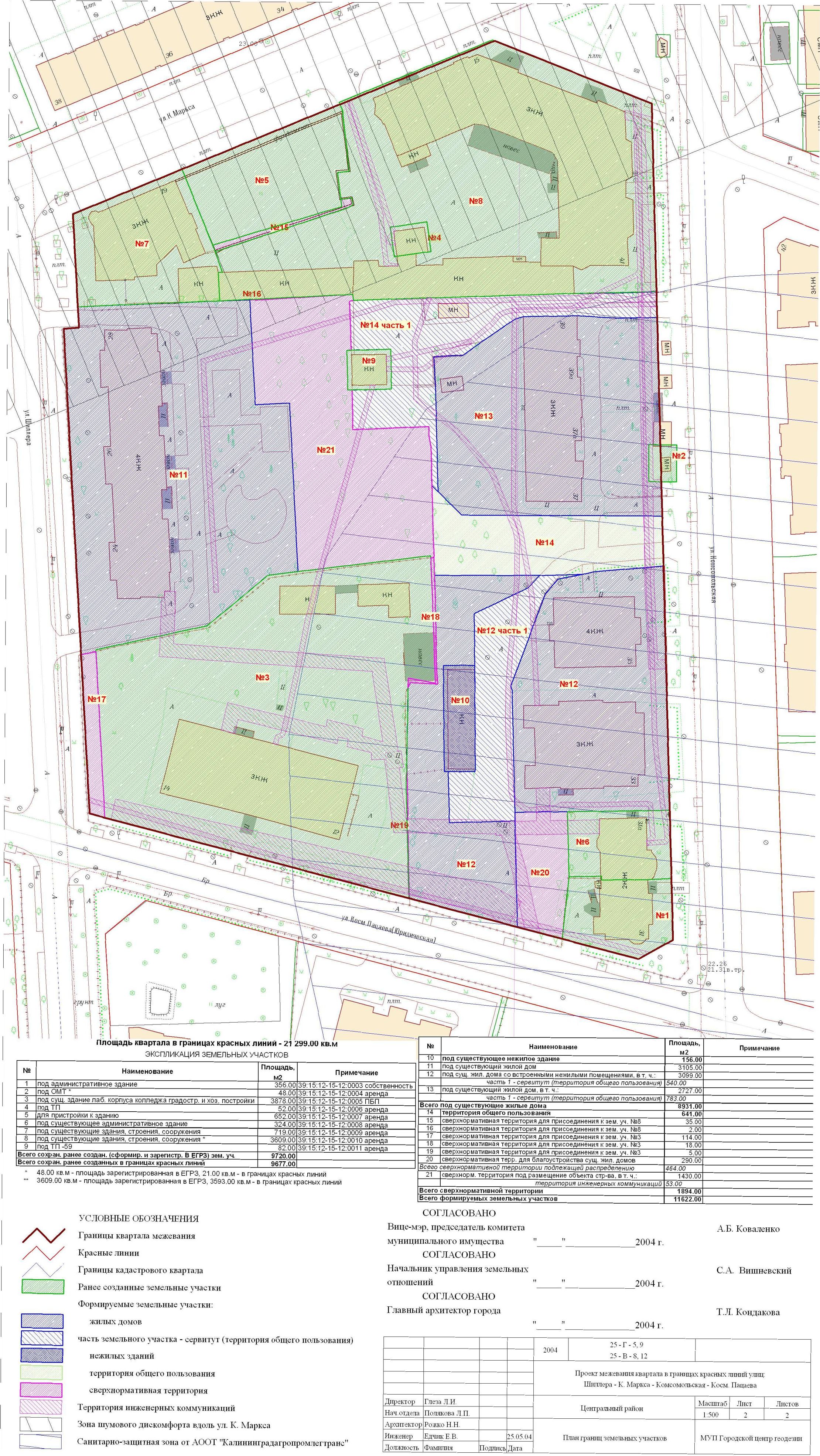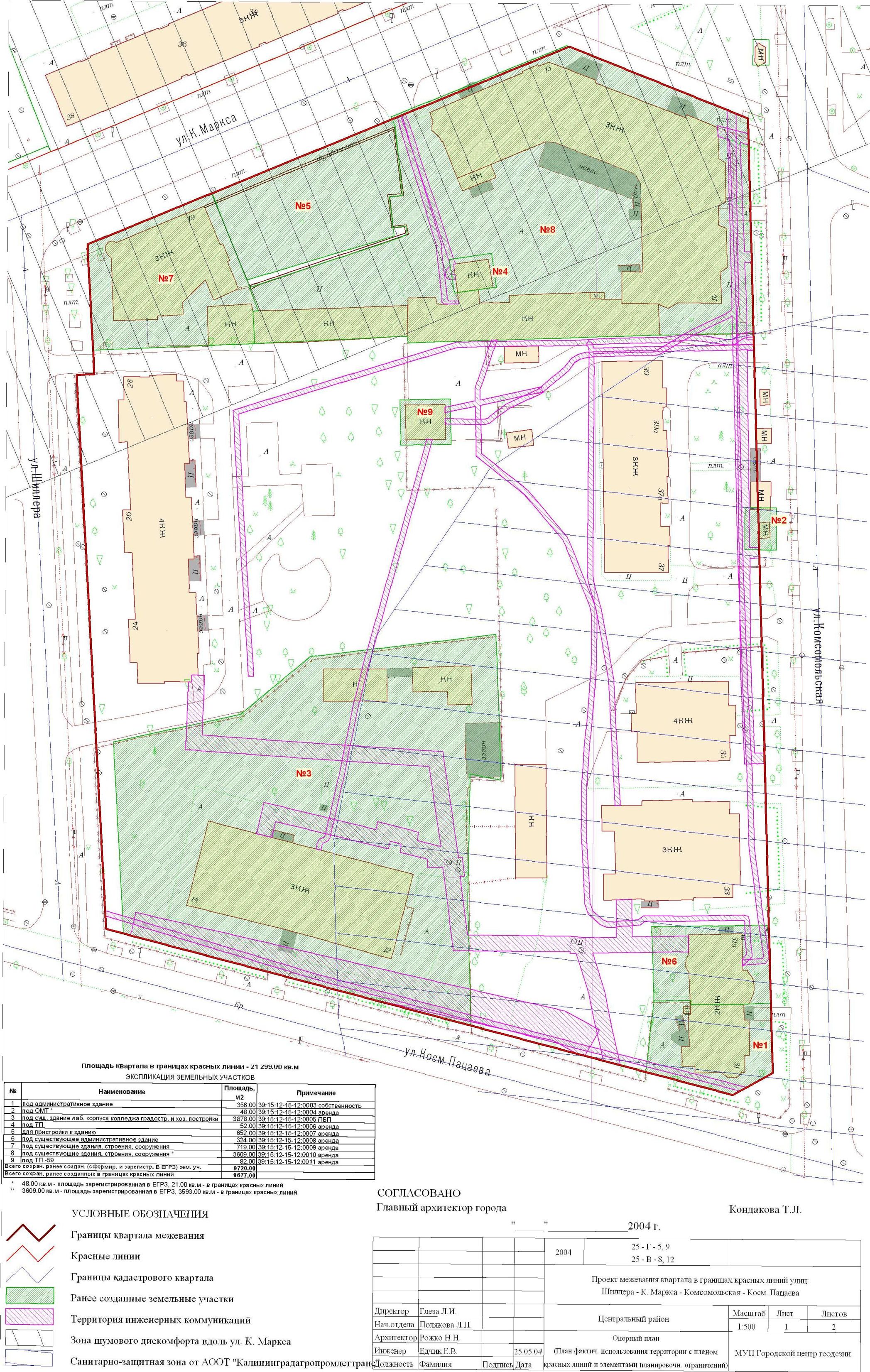 | Материалы проекта: | Постановление № 2525 от 14.09.2004 Опорный план План границ земельных участков Данные ГП Данные по нормативным и проектным площадям земельных участков Данные по существующему жилому фонду и населению Пояснительная записка |