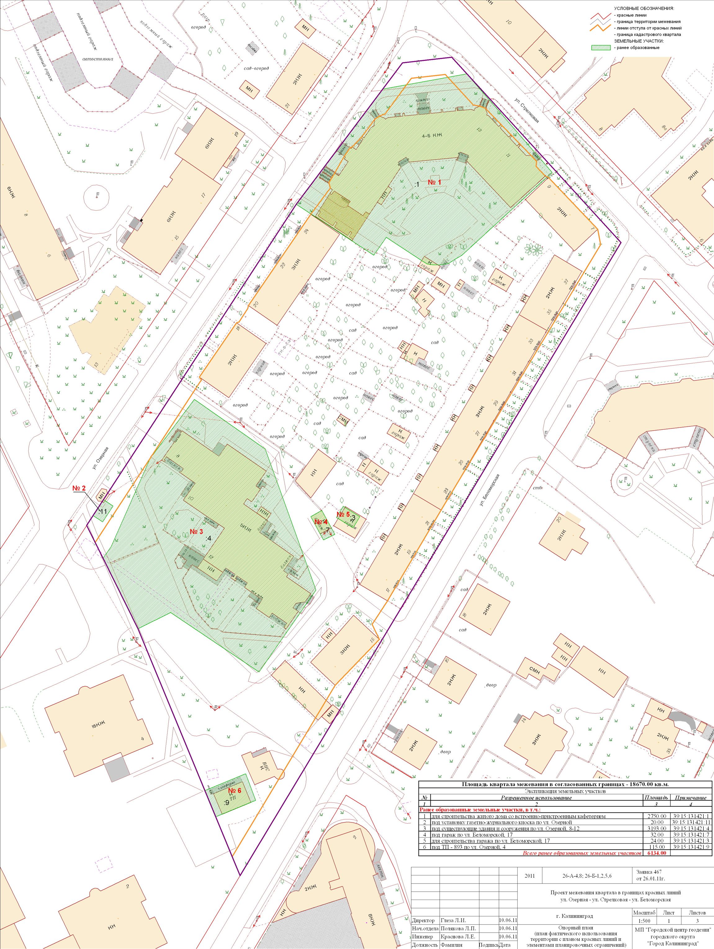 | Материалы проекта: | Постановление № 2213 от 12.12.2011 Опорный план План границ земельных участков Разбивочный чертёж красных линий Пояснительная записка Данные по нормативным и проектным площадям земельных участков |