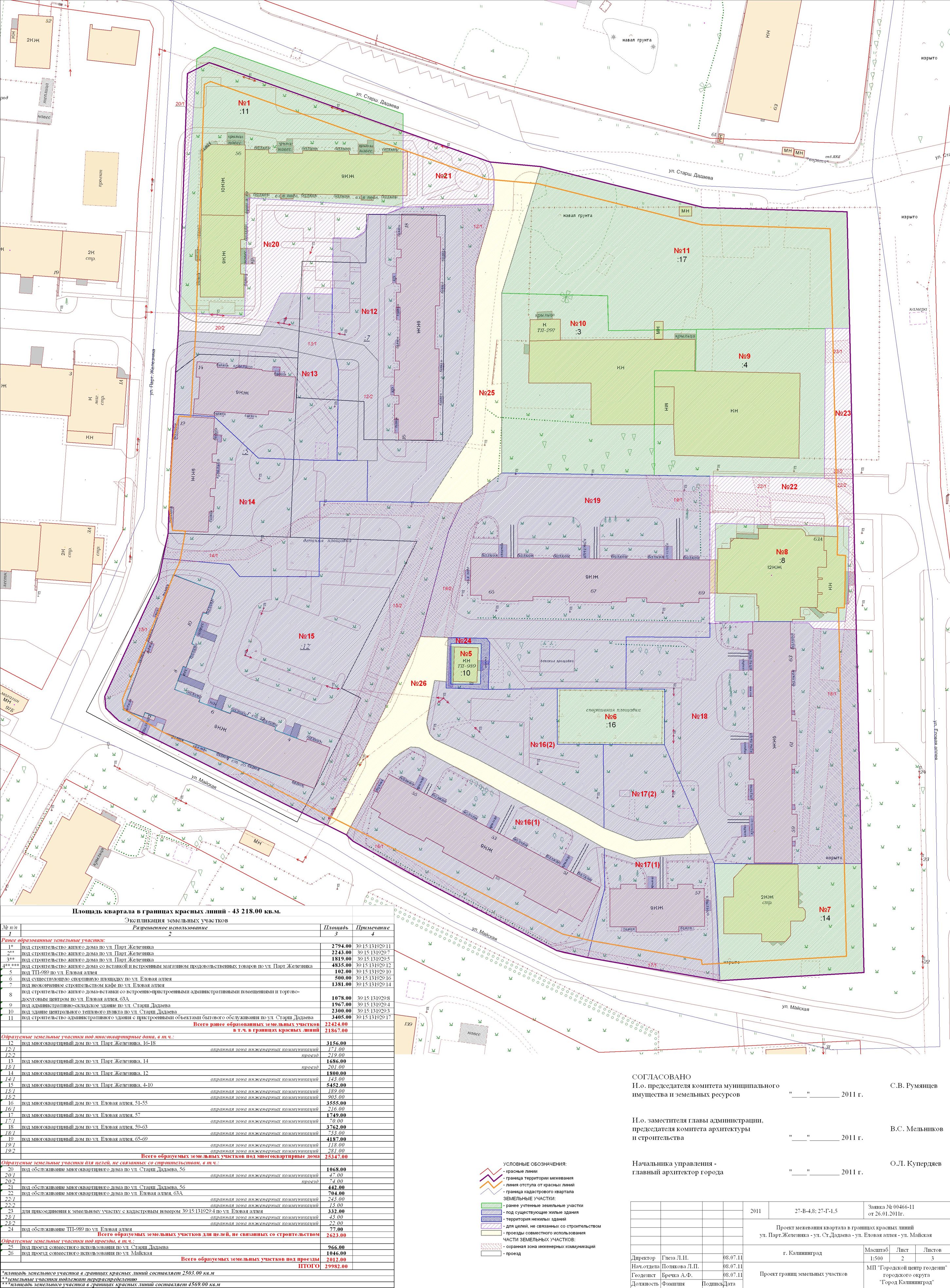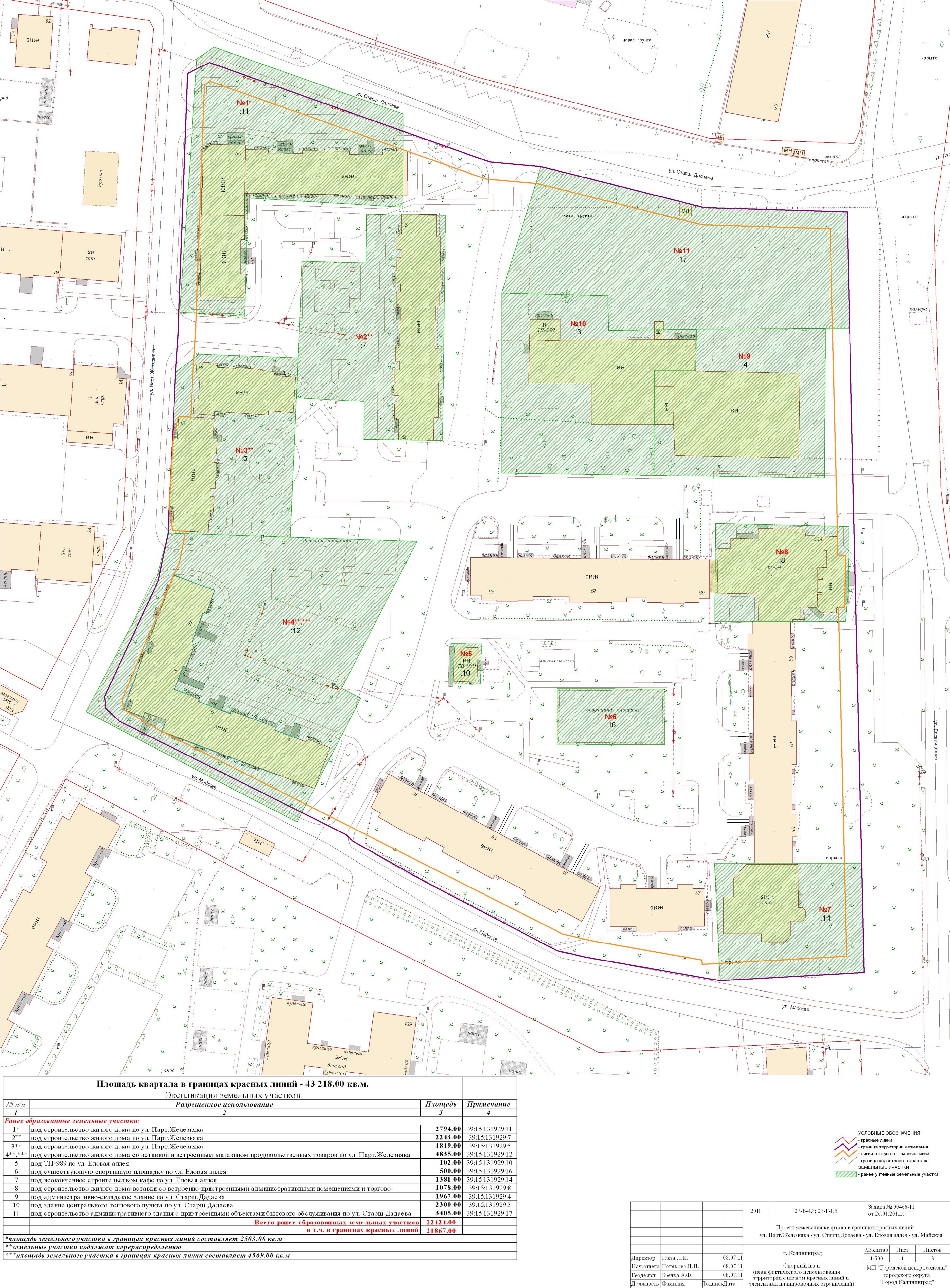 | Материалы проекта: | Постановление № 2131 от 02.12.2011 Опорный план План границ земельных участков Разбивочный чертёж красных линий Пояснительная записка Данные по нормативным и проектным площадям земельных участков |