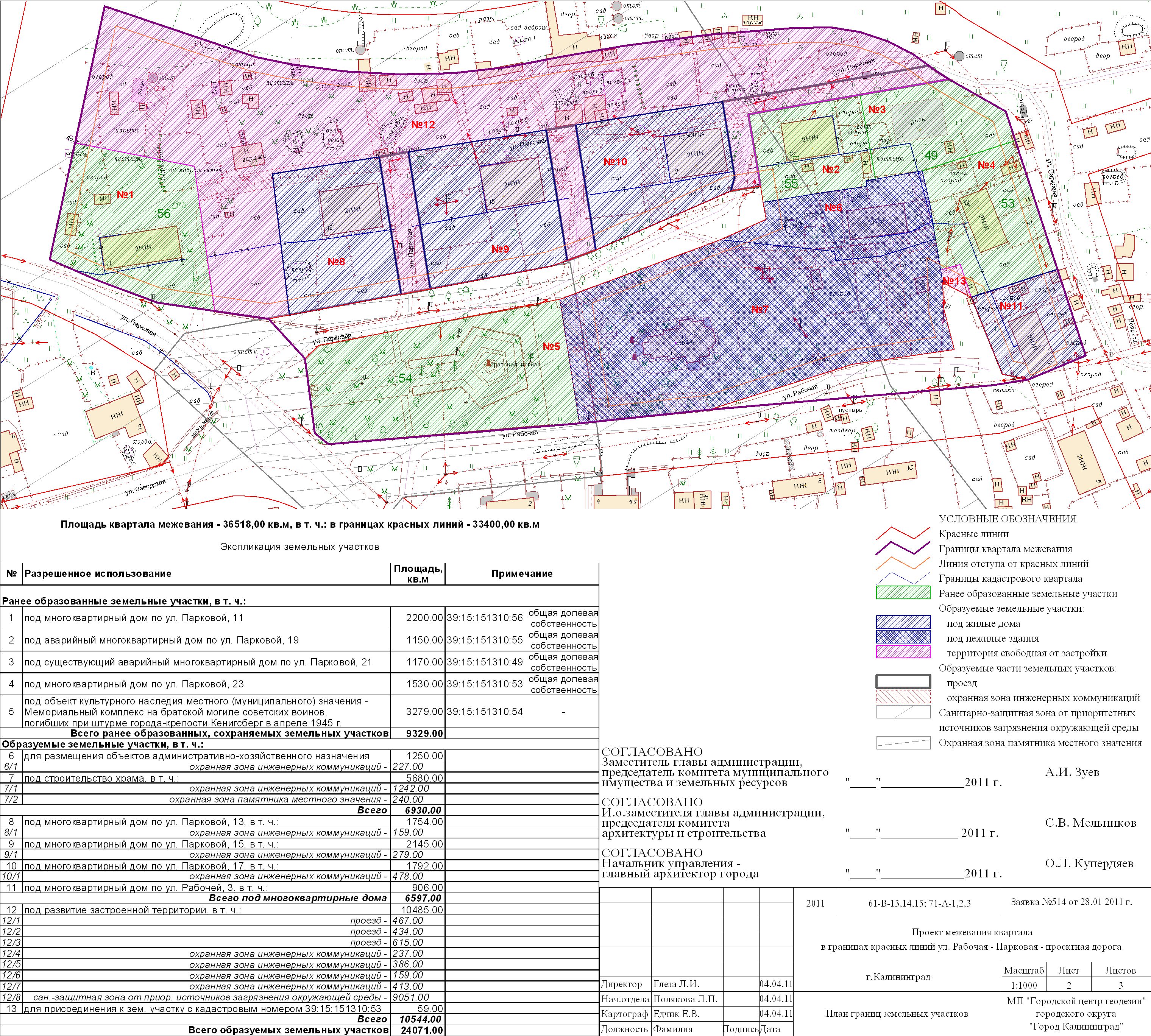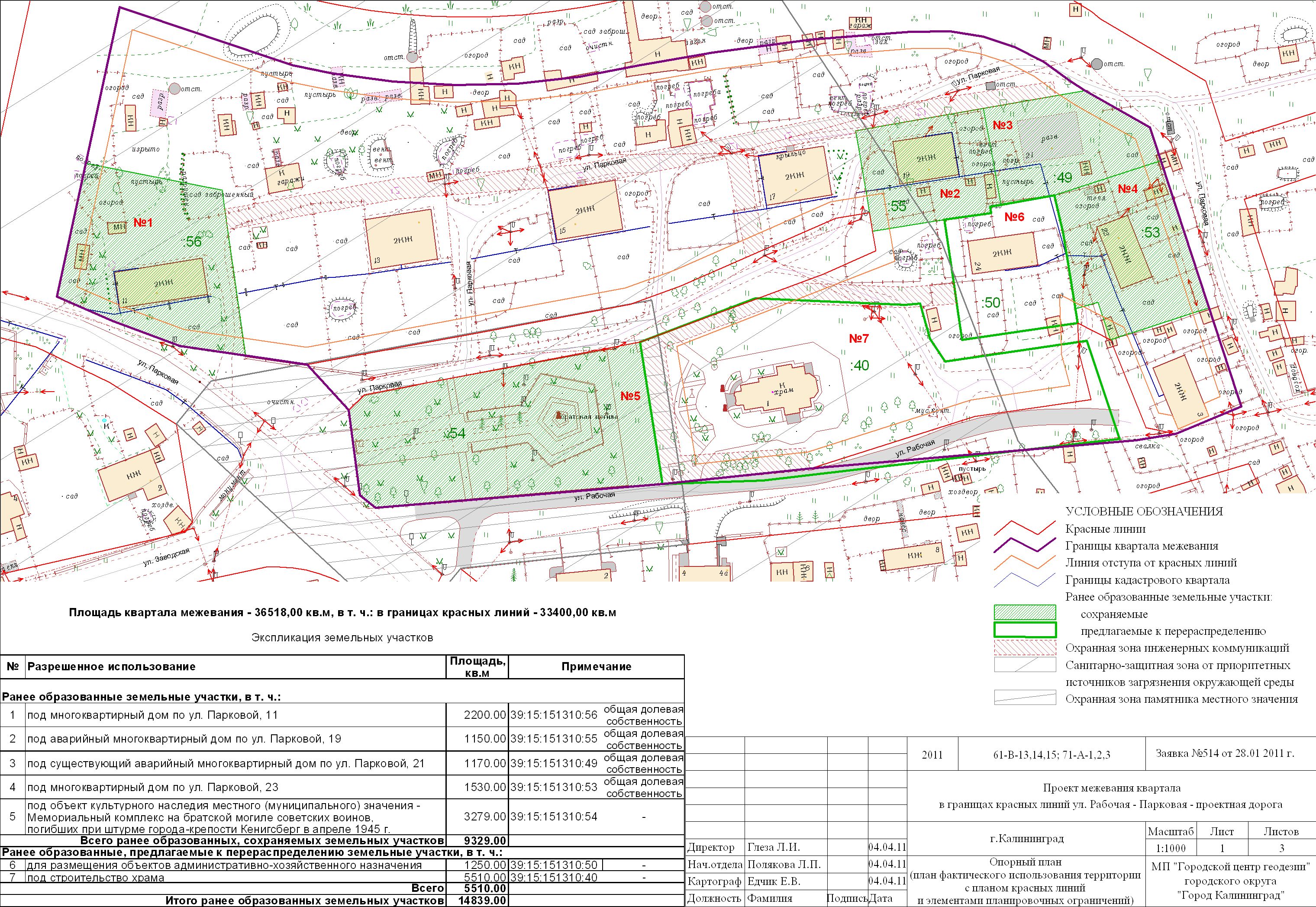| Материалы проекта: | Постановление № 2305 от 23.12.2011 Опорный план План границ земельных участков Разбивочный чертёж красных линий Пояснительная записка Данные по нормативным и проектным площадям земельных участков |
