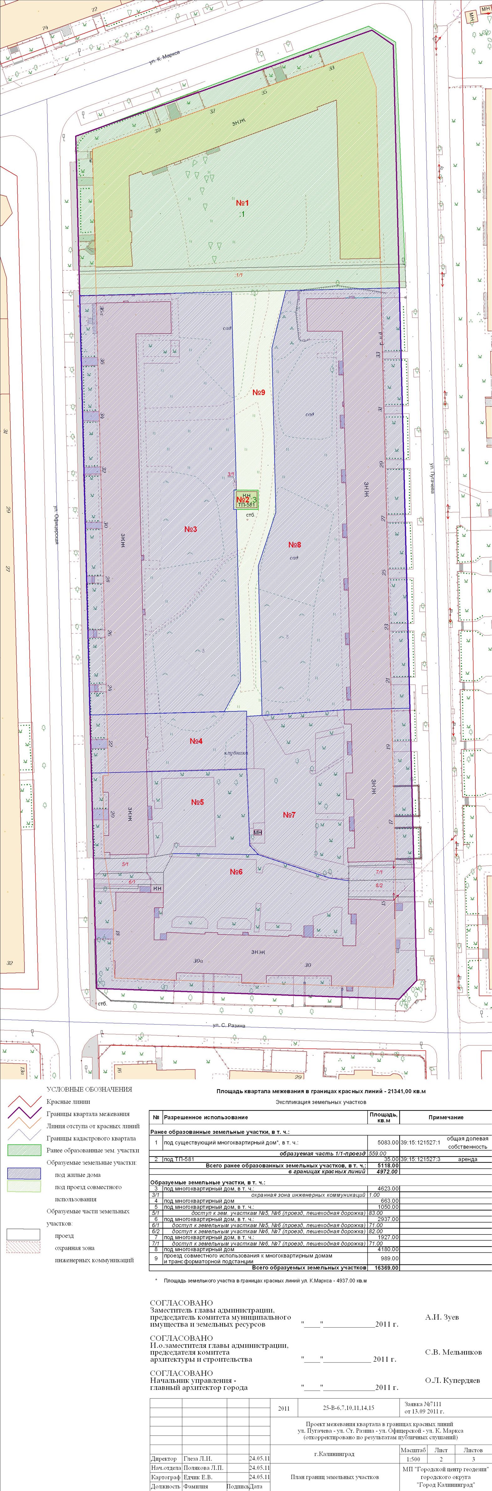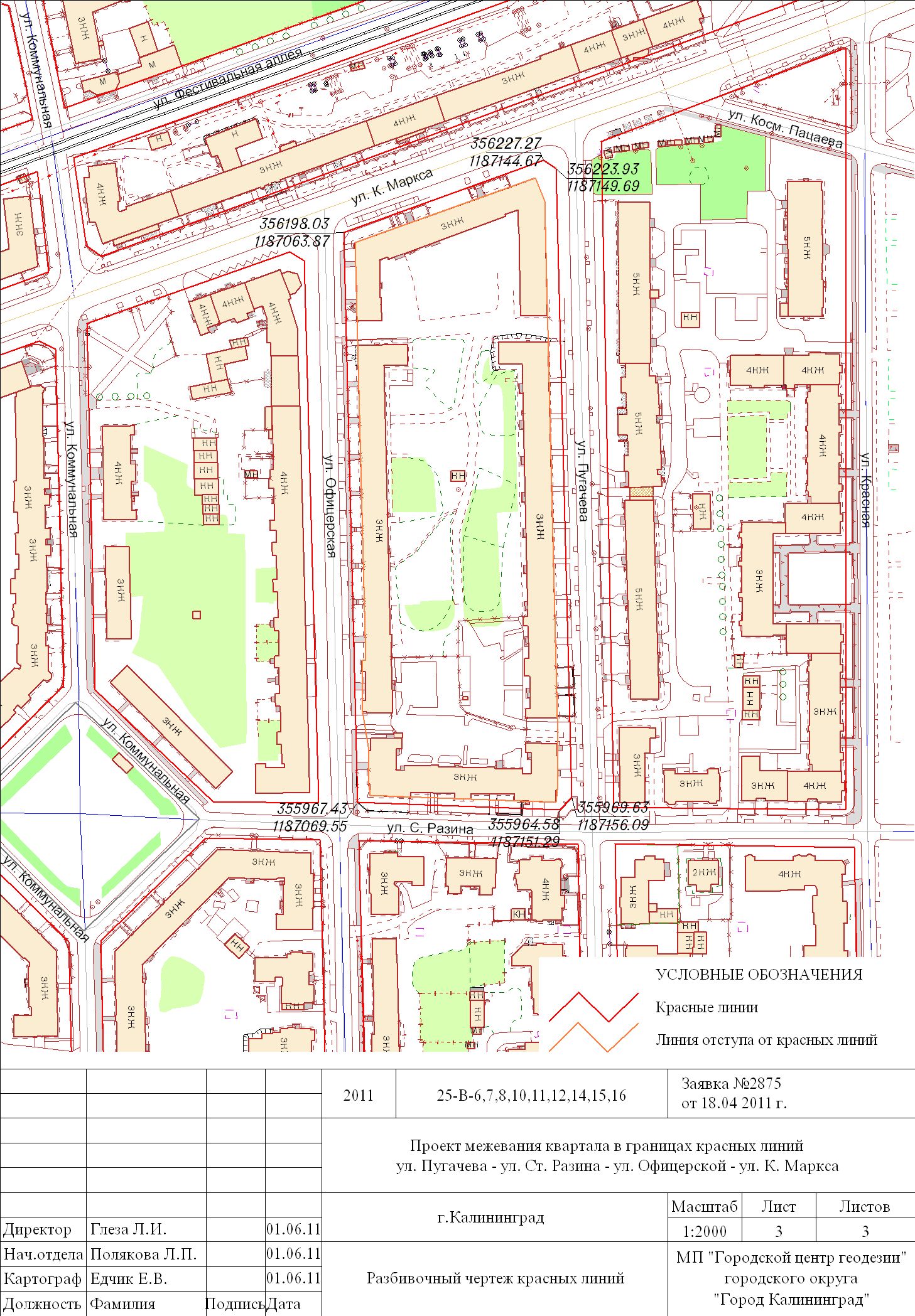 | Материалы проекта: | Постановление № 2210 от 12.12.2011 Опорный план План границ земельных участков Разбивочный чертёж красных линий Пояснительная записка Данные по нормативным и проектным площадям земельных участков |