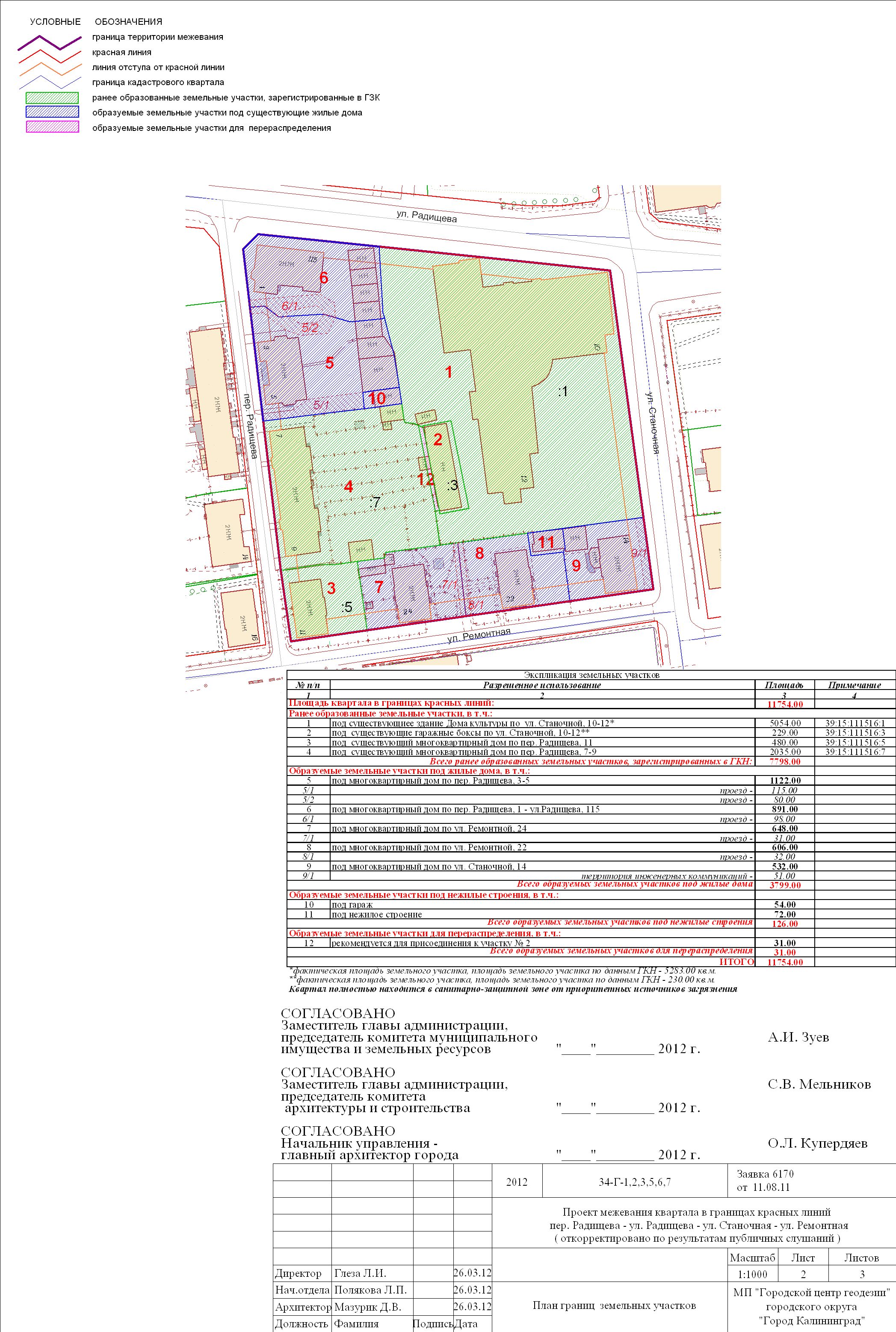 | Материалы проекта: | Постановление № 855 от 24.05.2012 Опорный план План границ земельных участков Разбивочный чертёж красных линий Пояснительная записка Данные по нормативным и проектным площадям земельных участков |