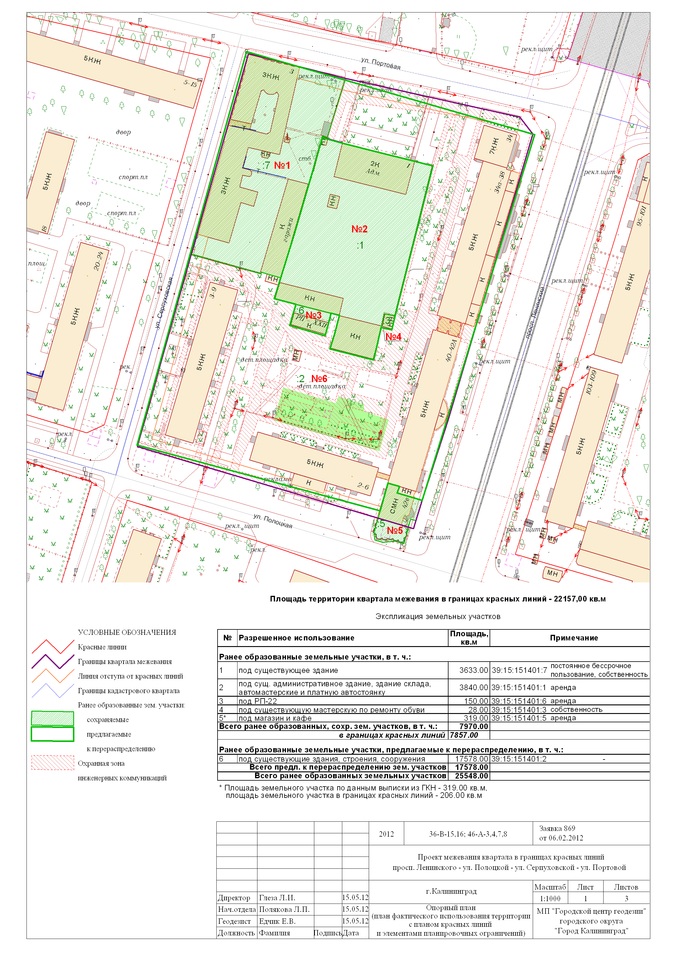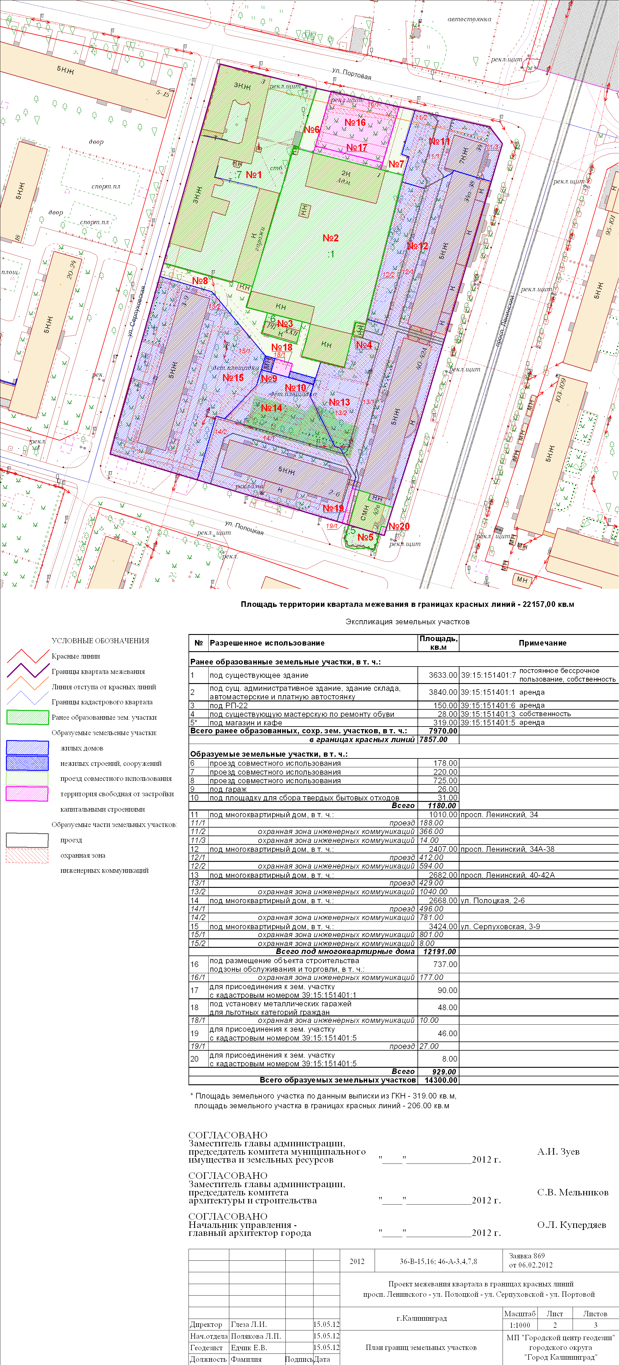 | Материалы проекта: | Постановление № 1741 от 14.09.2012 Данные по нормативным и проектным площадям земельных участков Опорный план План красных линий Проект границ земельных участков |