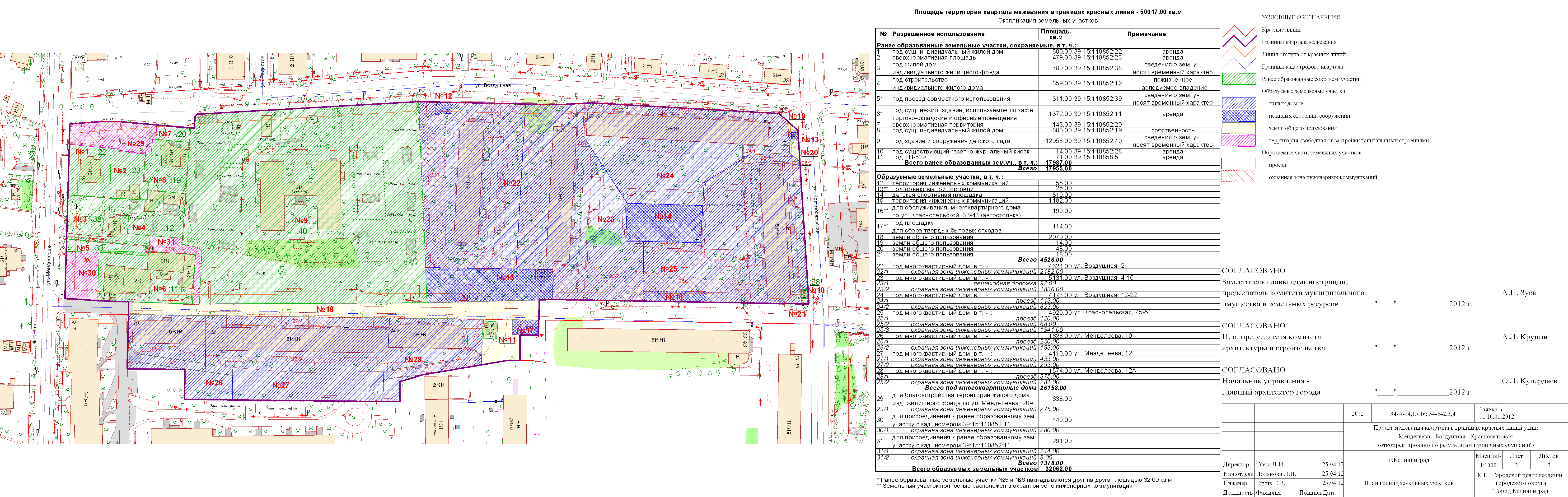 | Материалы проекта: | Постановление № 1793 от 19.09.2012 Данные по нормативным и проектным площадям земельных участков Опорный план План красных линий Проект границ земельных участков |