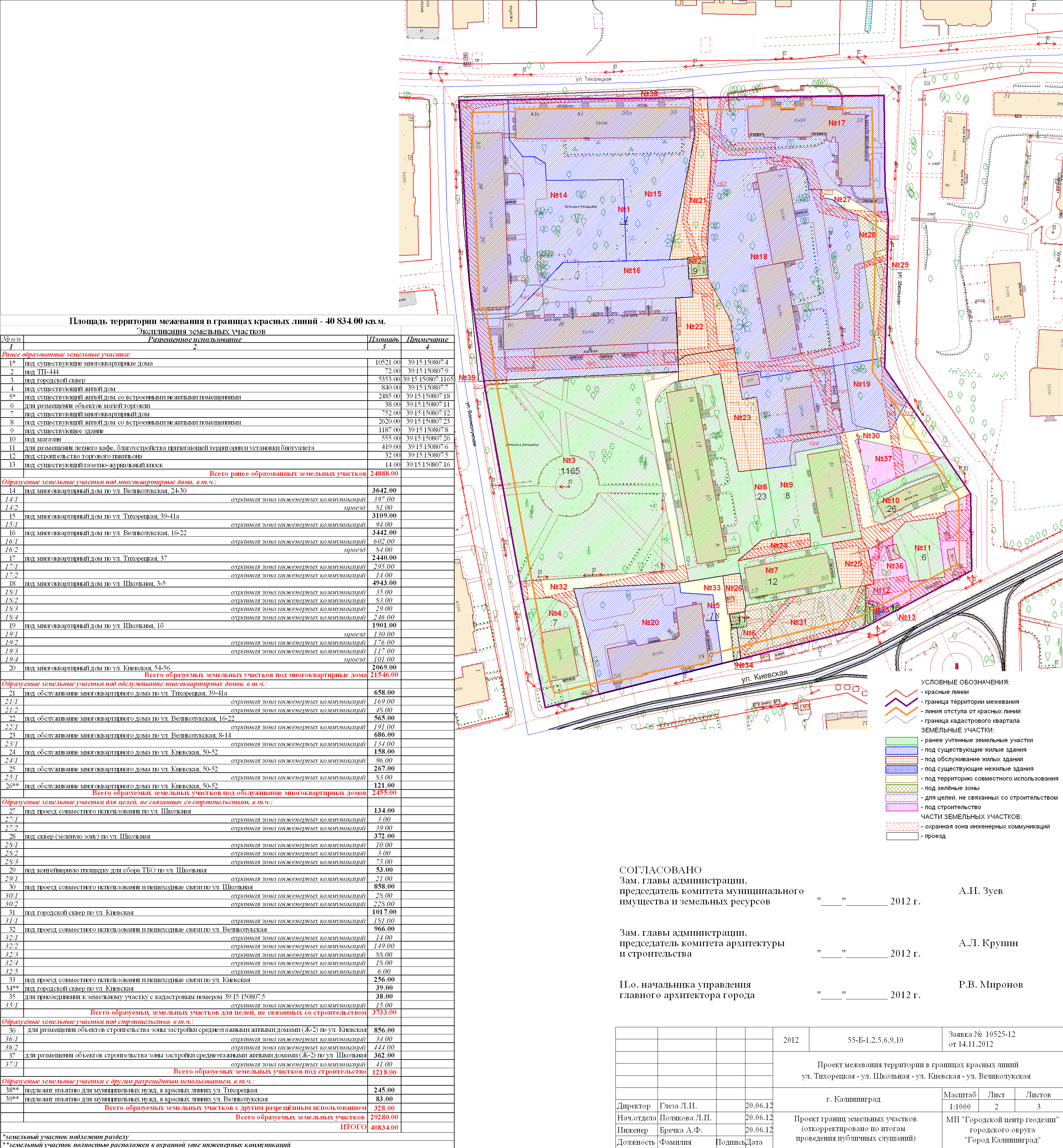 | Материалы проекта: | Постановление № 2384 от 21.12.2012 Данные по нормативным и проектным площадям земельных участков Опорный план План красных линий Проект границ |