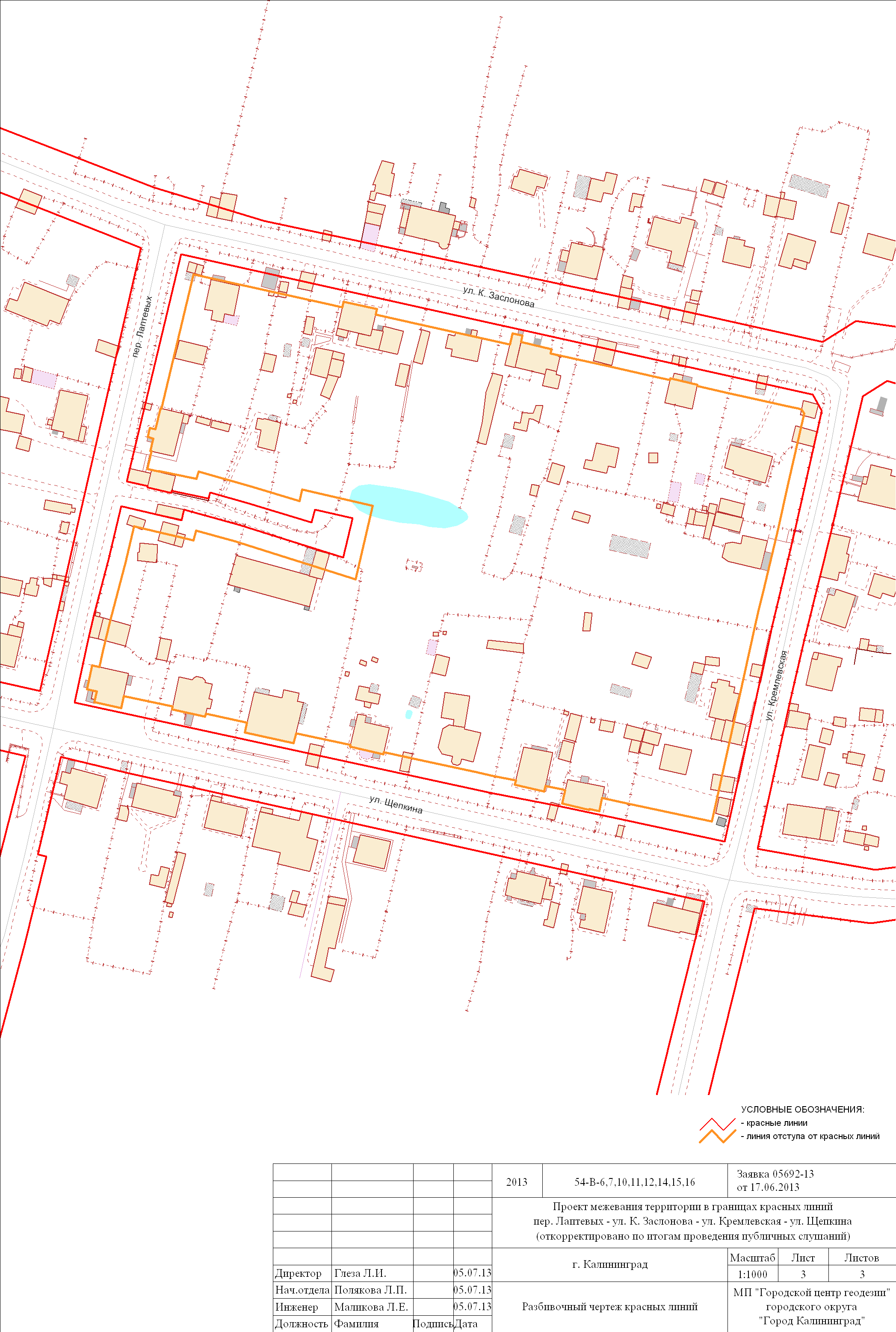 | Материалы проекта: | Постановление № 1121 от 31.07.2013 Опорный план План красных линий Данные по нормативным и проектным площадям земельных участков |