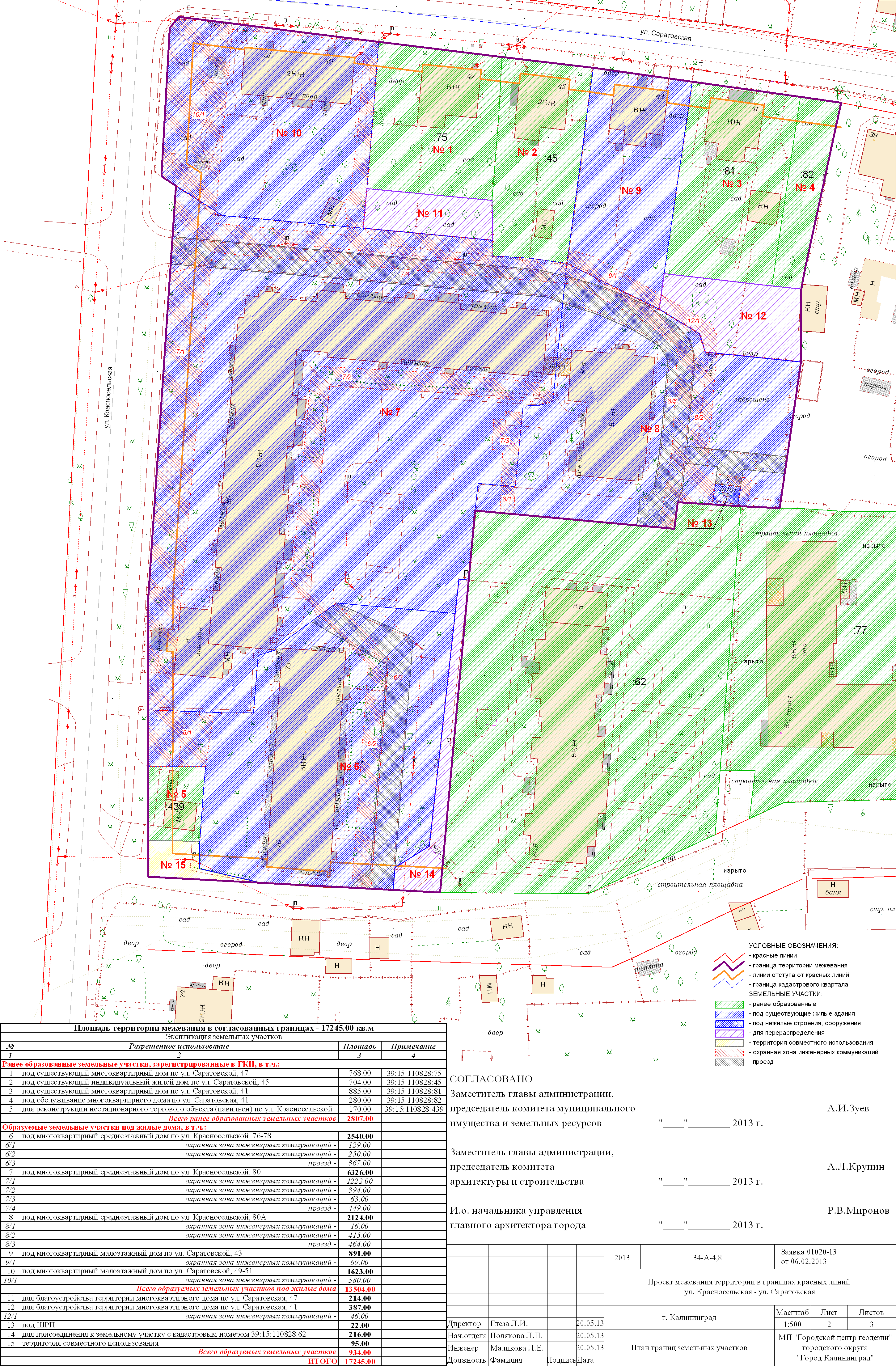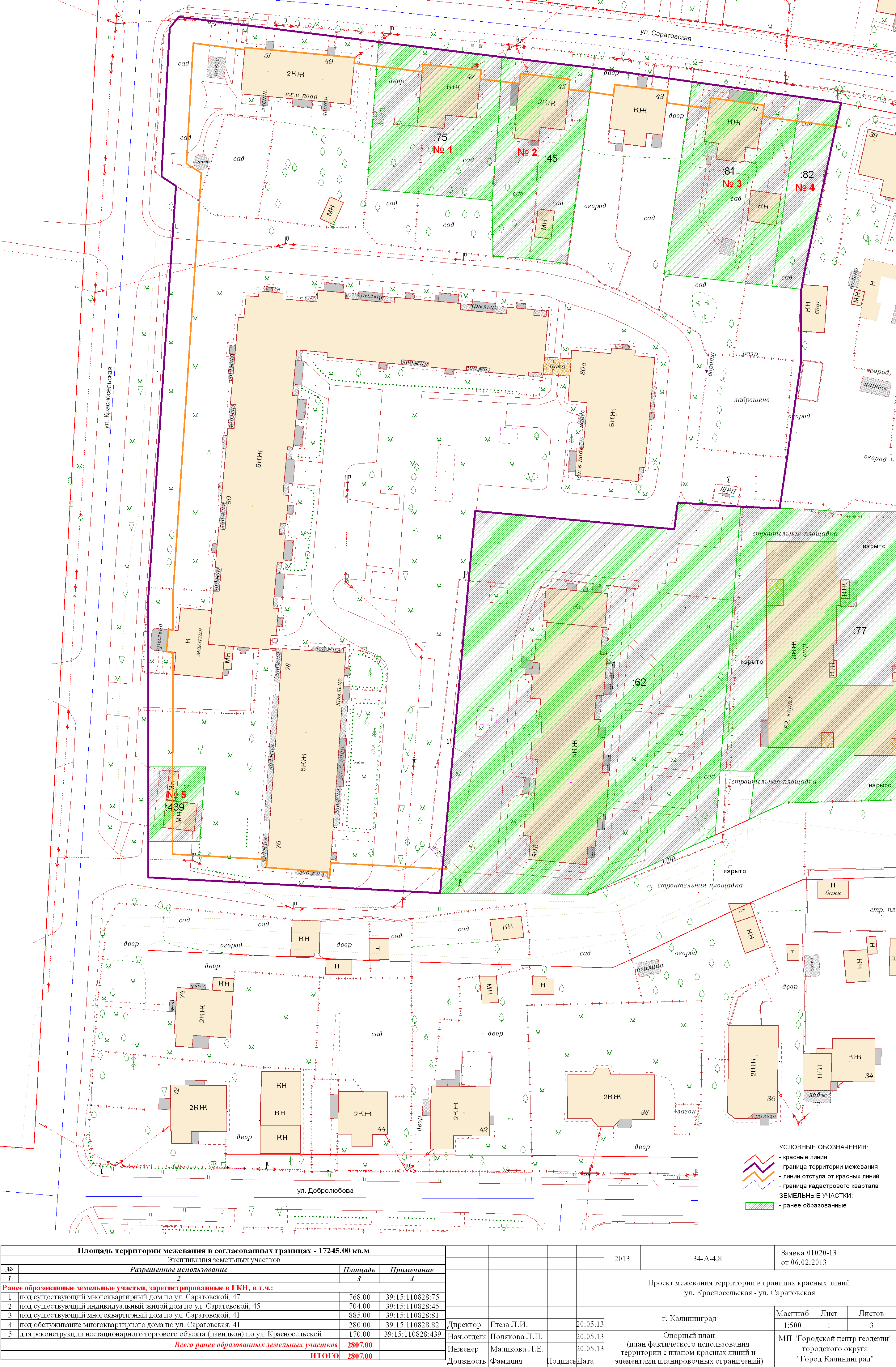 | Материалы проекта: | Постановление № 1070 от 24.07.2013 Данные по нормативным и проектным площадям земельных участков Опорный план План красных линий Проект границ |
