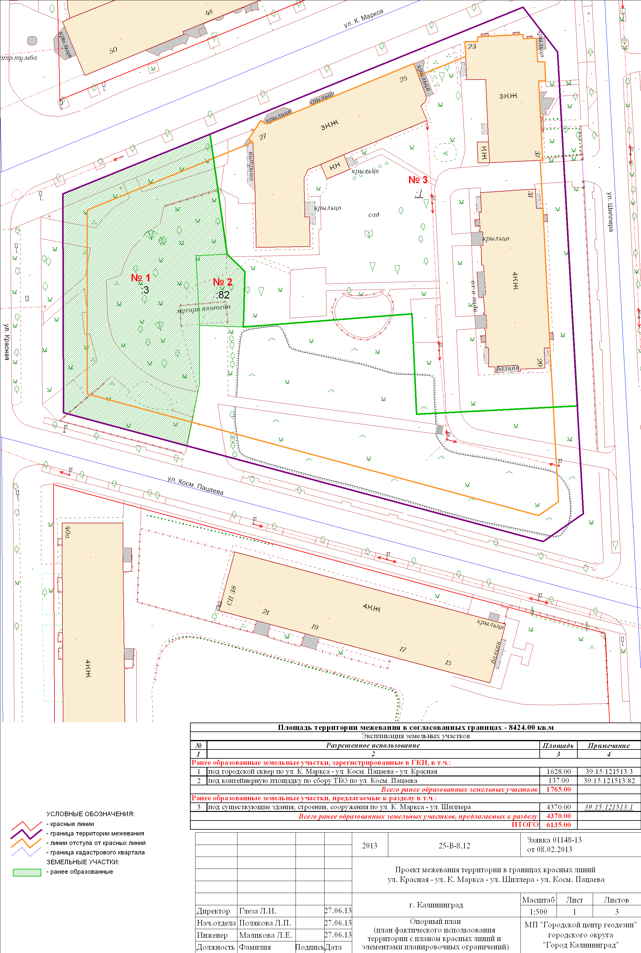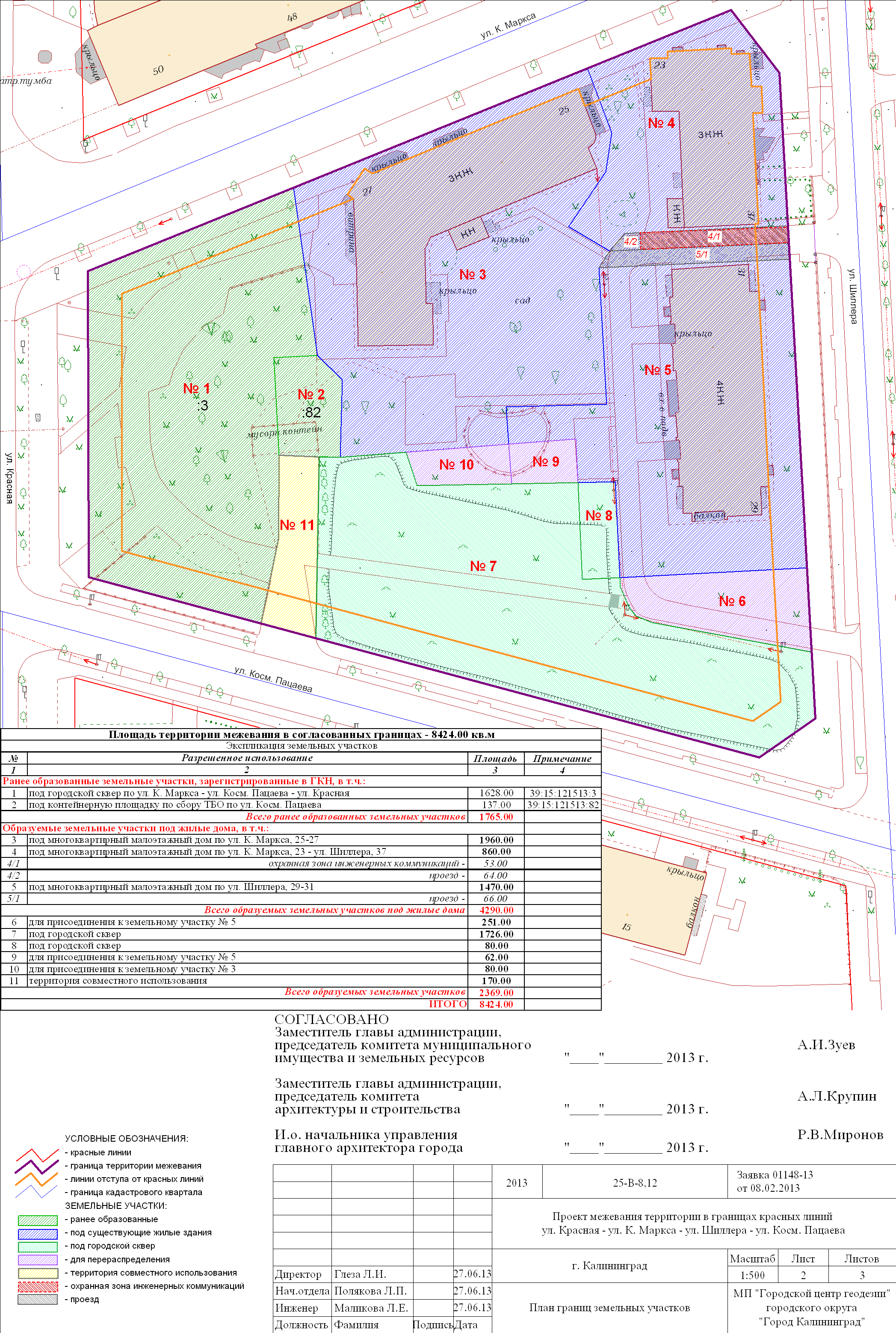 | Материалы проекта: | Постановление № 1387 от 09.09.2013 Данные по нормативным и проектным площадям земельных участков Опорный план План красных_линий Проект границ |