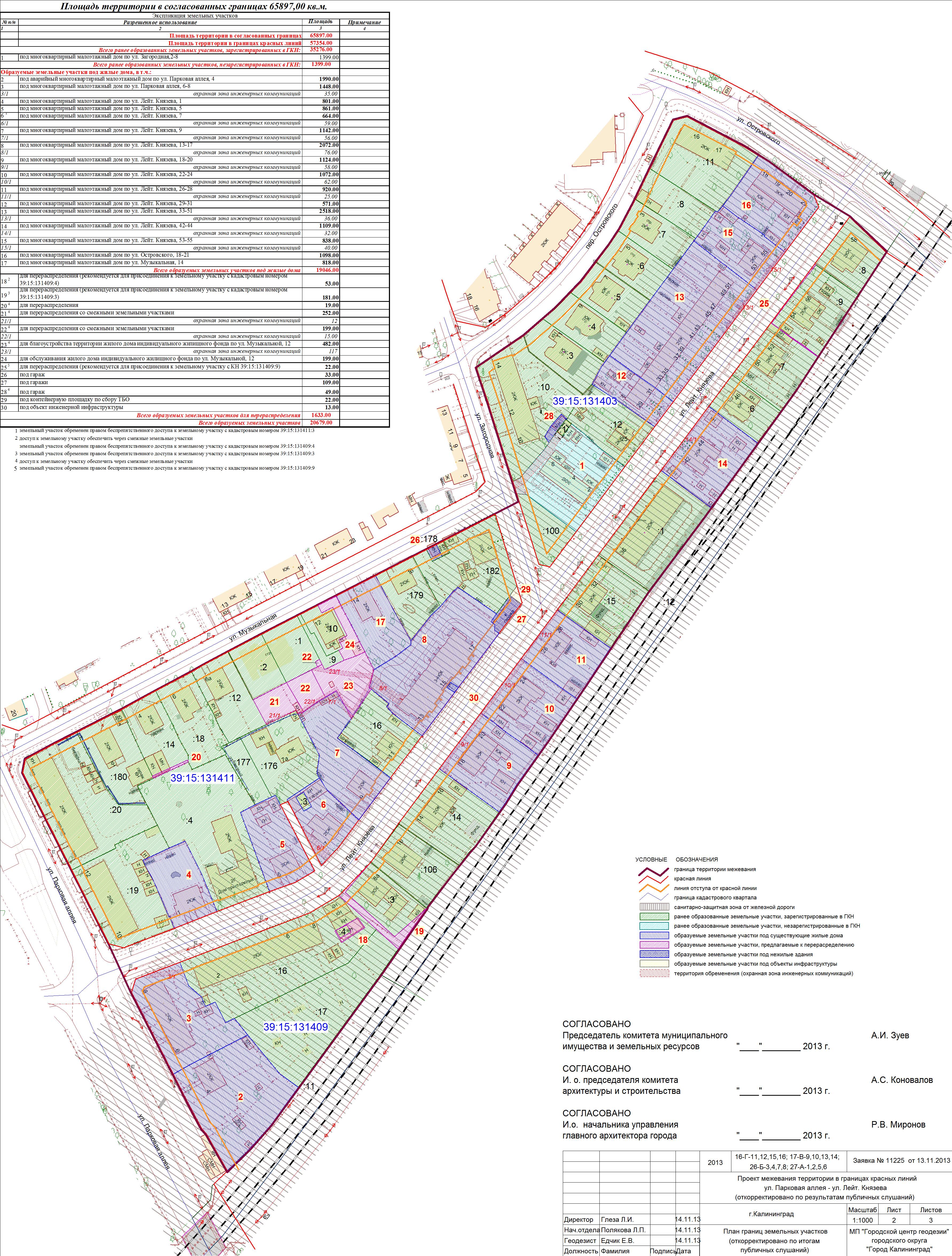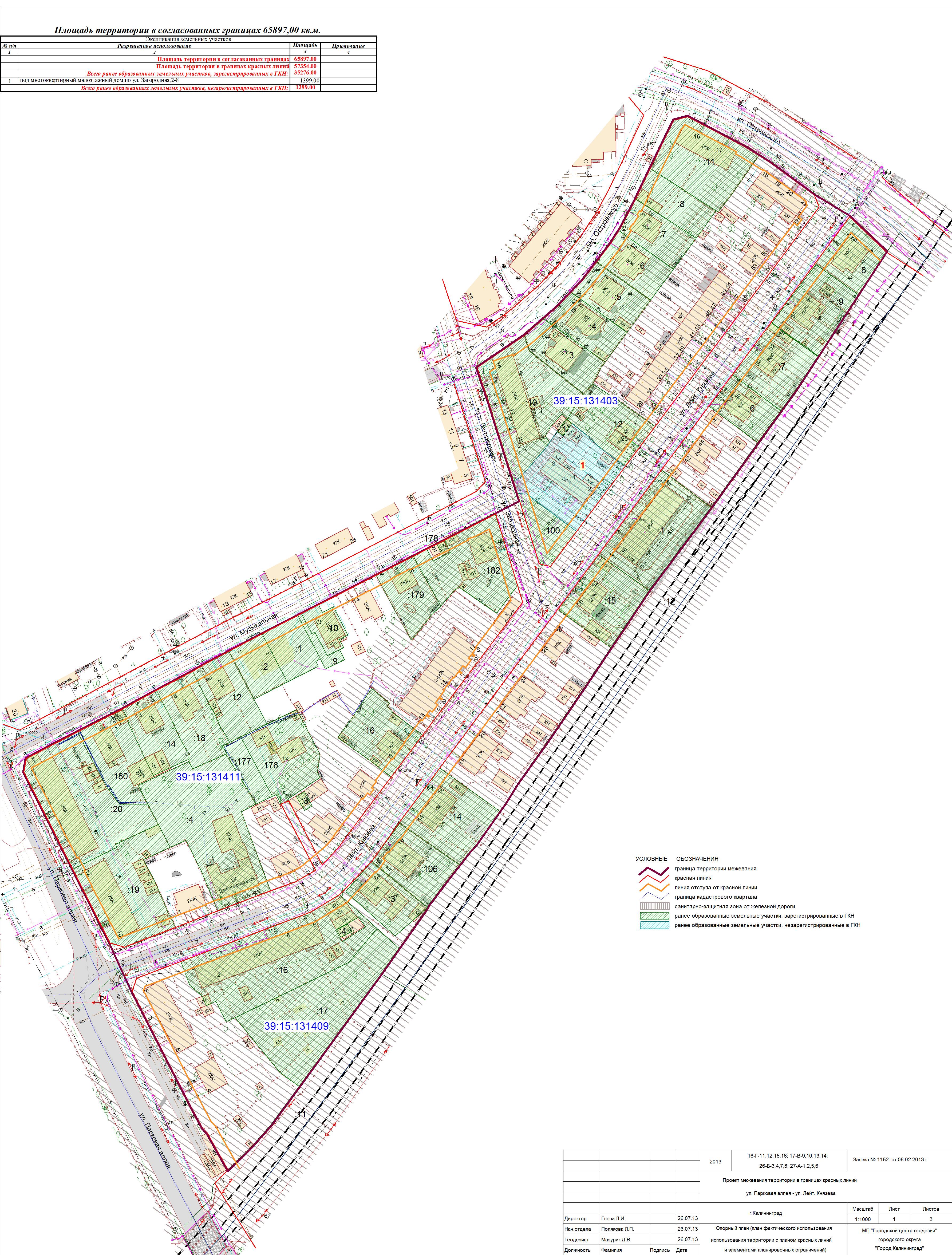| Материалы проекта: | Постановление № 1809 от 26.11.2013 Данные по нормативным и проектным площадям земельных участков Опорный план План красных линий Проект границ Пояснительная записка |