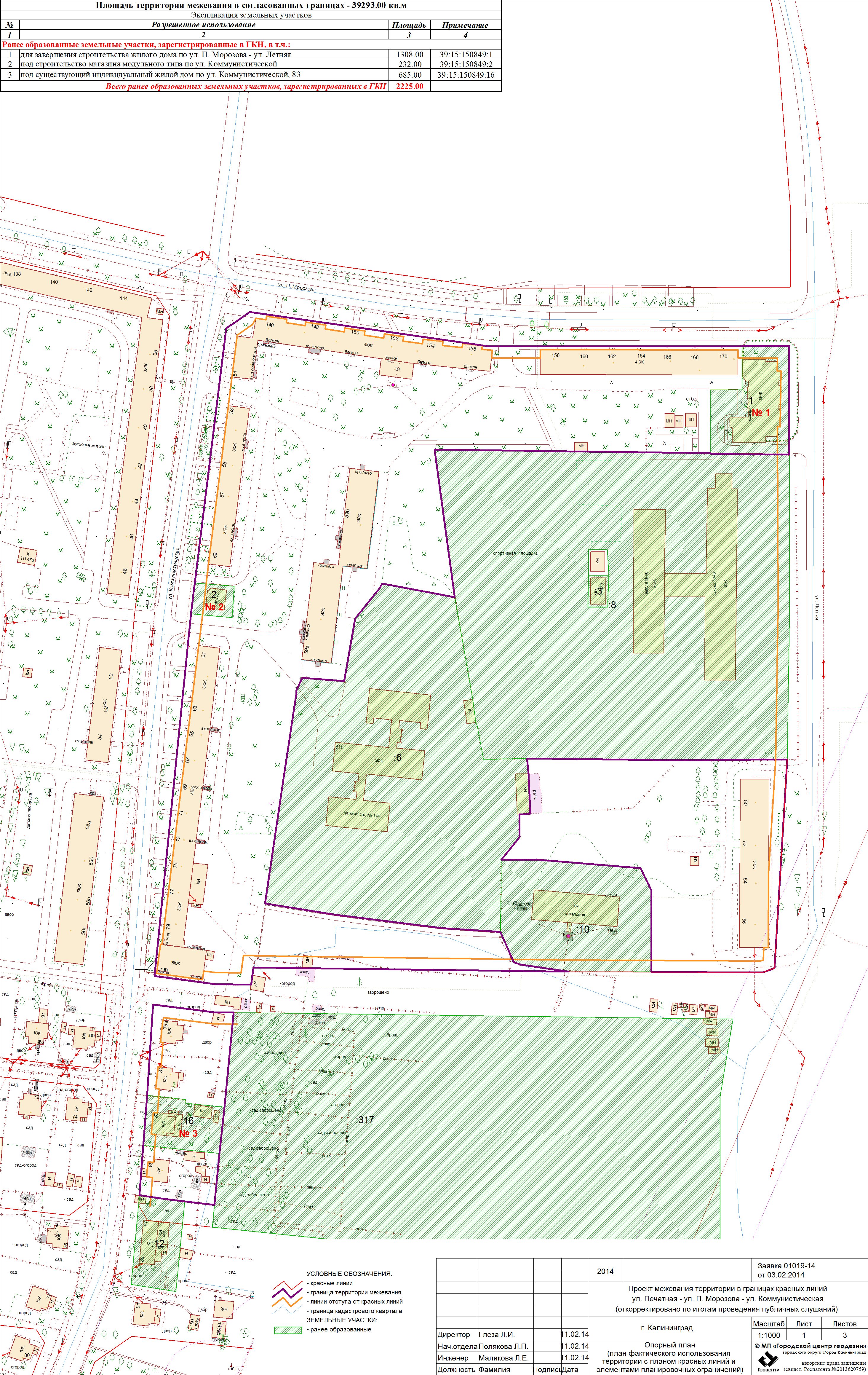| Материалы проекта: | Постановление № 377 от 06.03.2014 Данные по нормативным и проектным площадям земельных участков Опорный план План красных линий Проект границ Пояснительная записка |