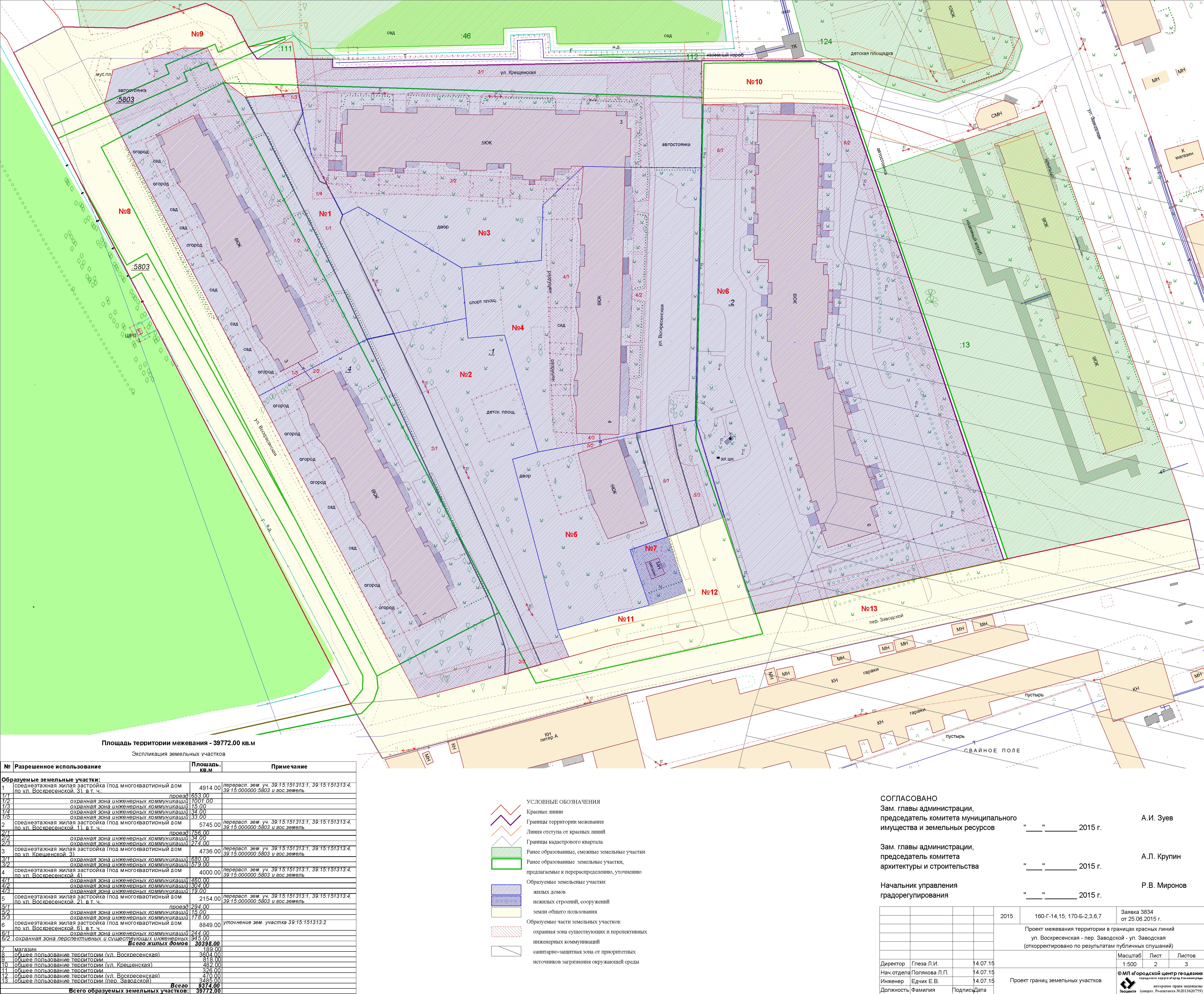 | Материалы проекта: | Постановление № 1480 от 02.09.2015 Опорный план Проект границ земельных участков Разбивочный чертеж красных линий Пояснительная записка Данные по нормативным и проектным площадям земельных участков |