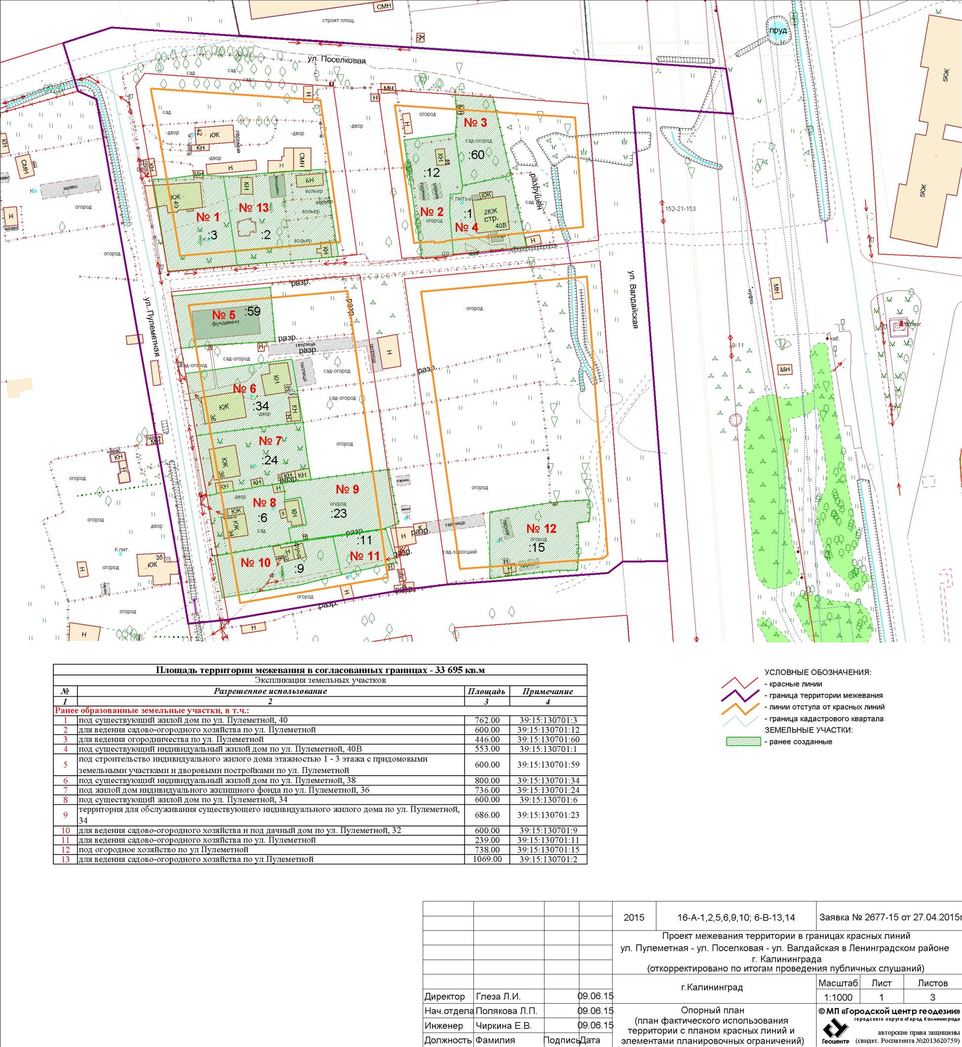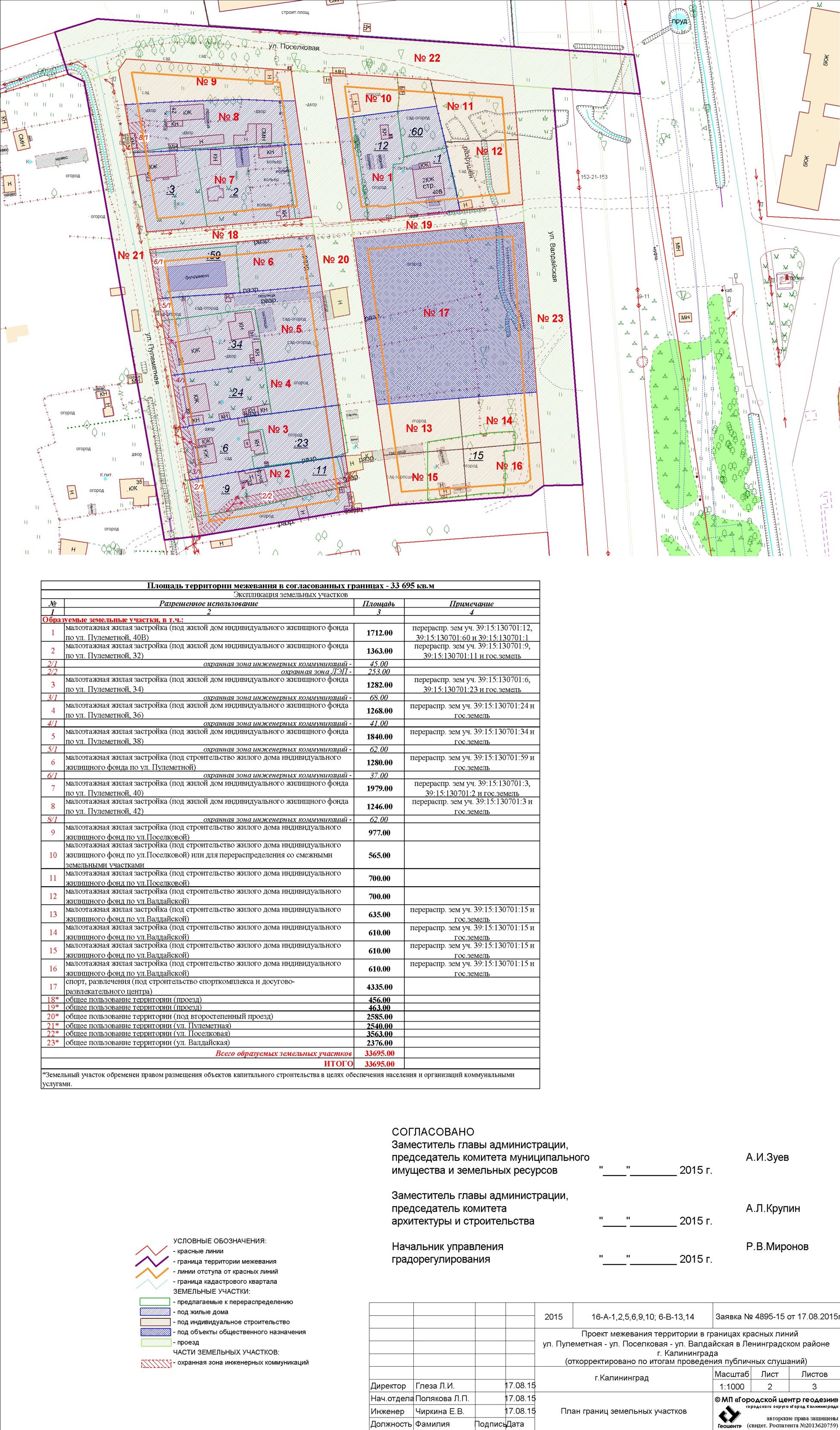 | Материалы проекта: | Постановление № 1604 от 22.09.2015 Опорный план Проект границ земельных участков Разбивочный чертеж красных линий Пояснительная записка Данные по нормативным и проектным площадям земельных участков |