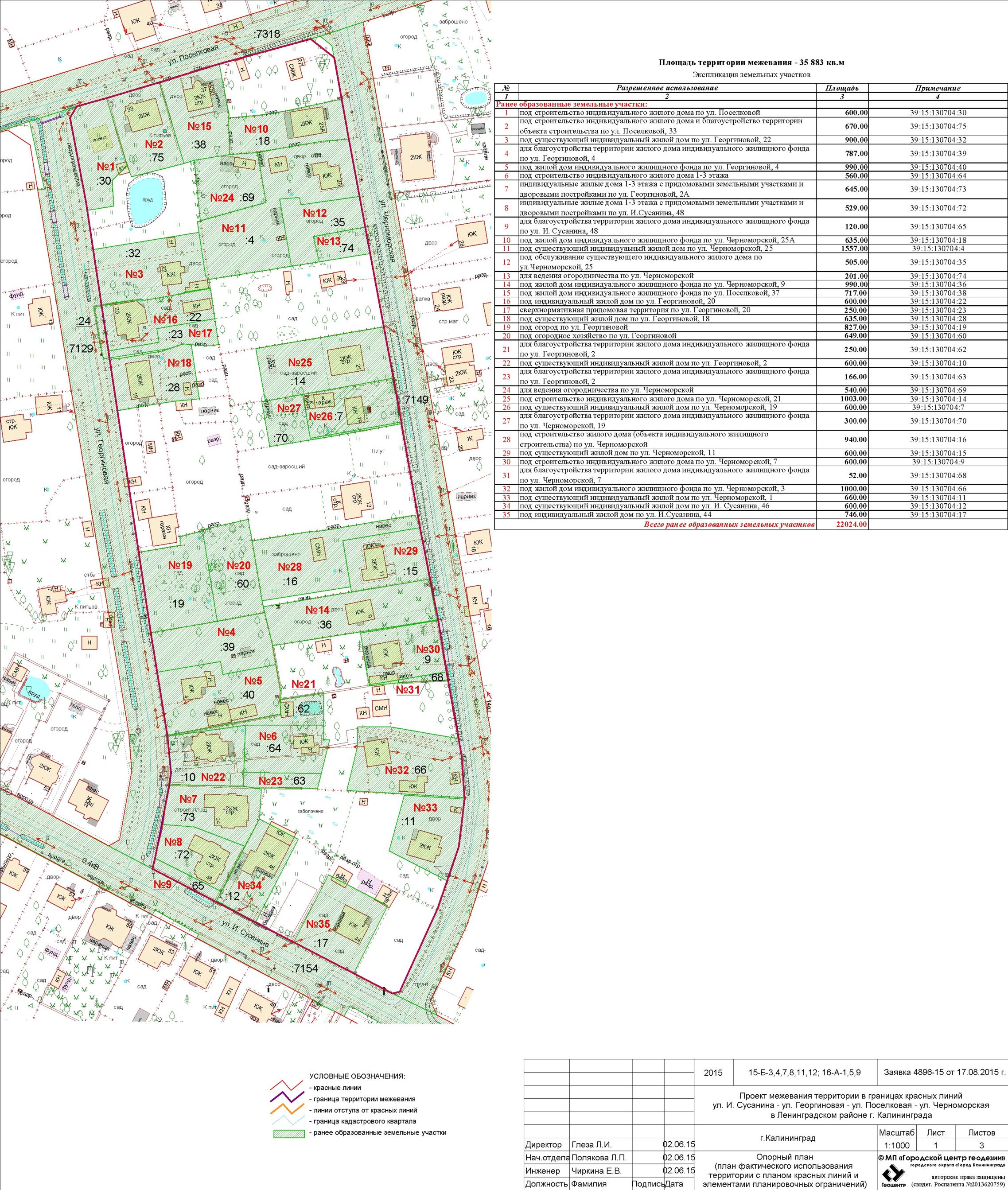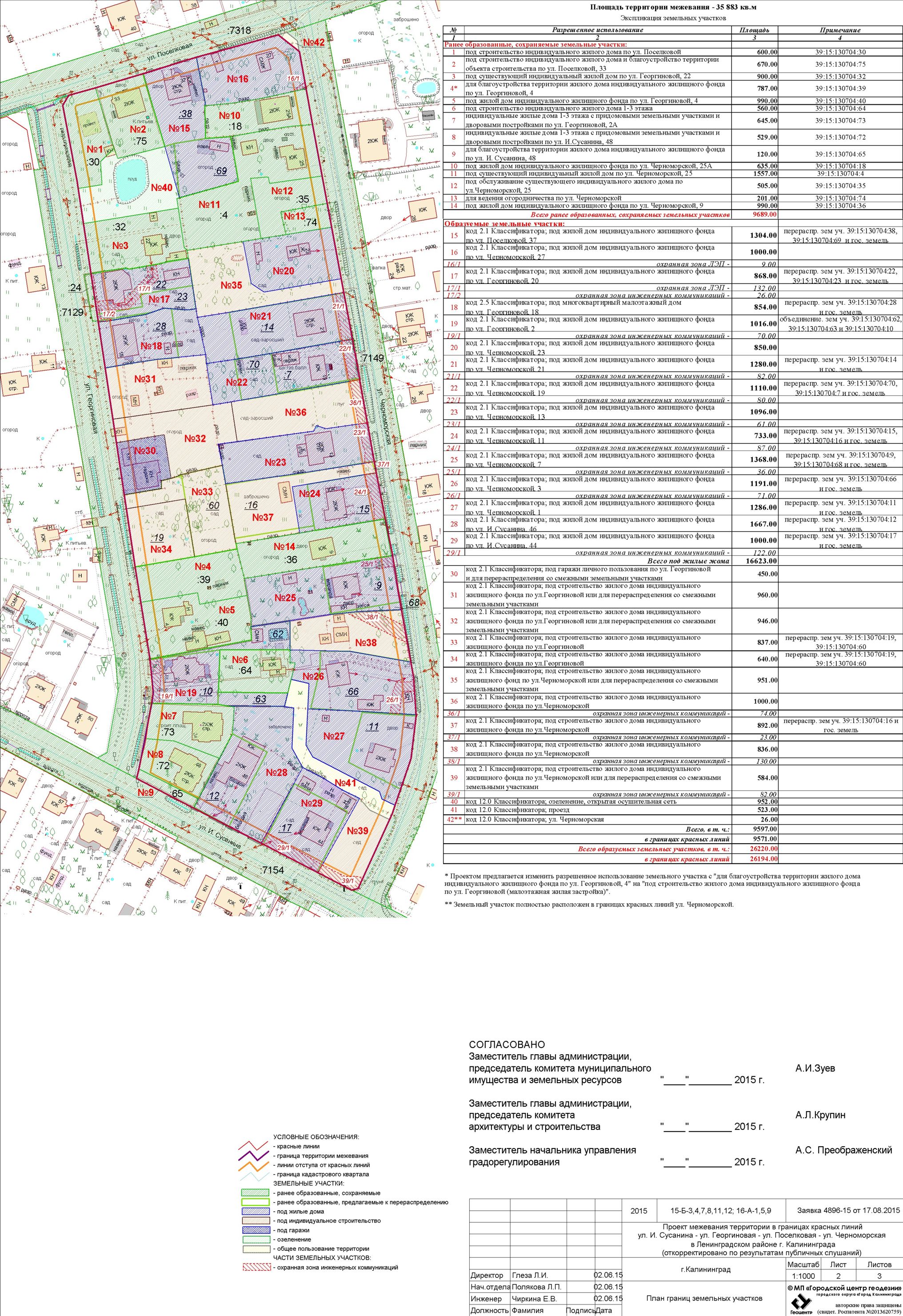 | Материалы проекта: | Постановление № 1715 от 12.10.2015 Опорный план Проект границ земельных участков Разбивочный чертеж красных линий Пояснительная записка Данные по нормативным и проектным площадям земельных участков |
