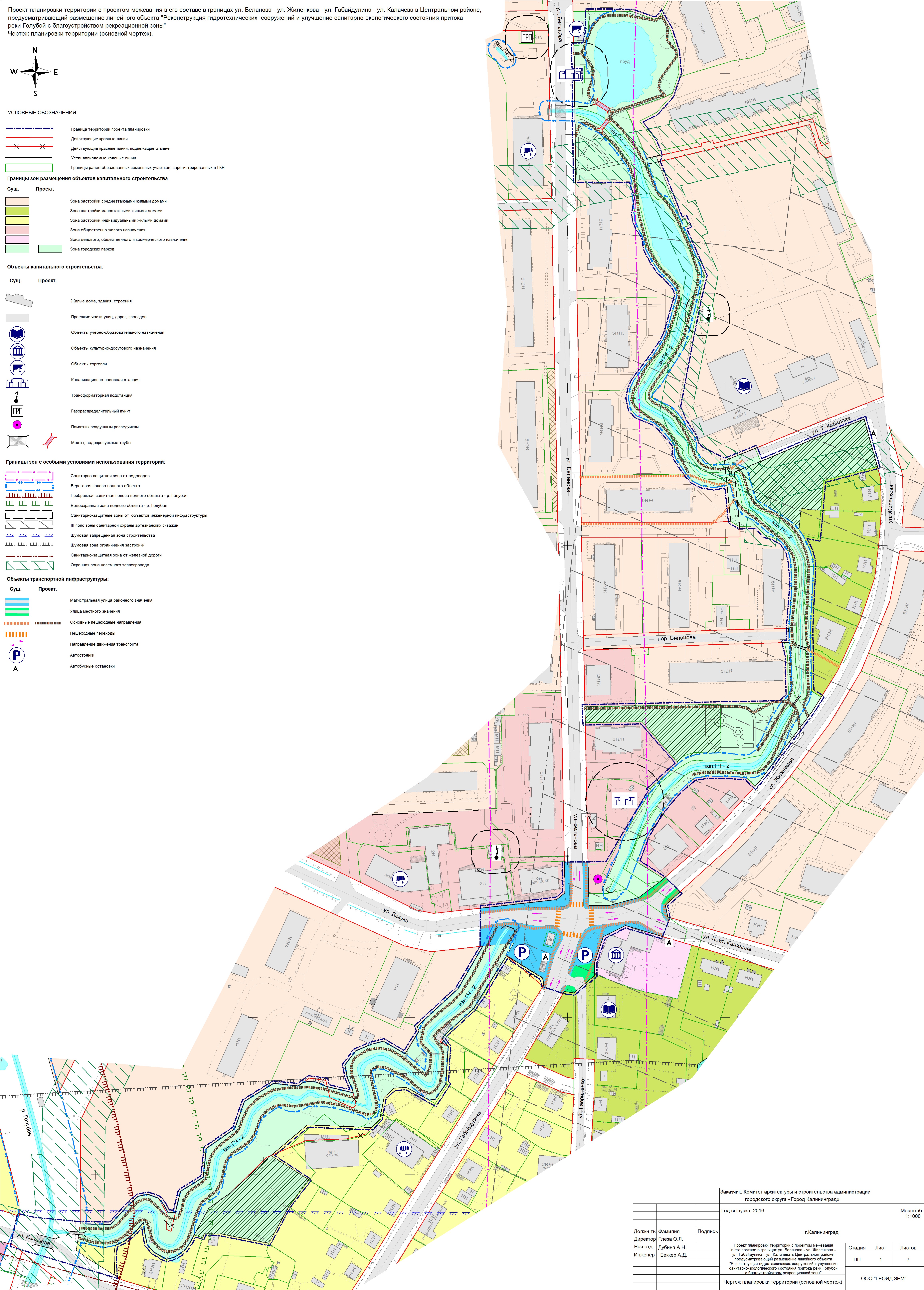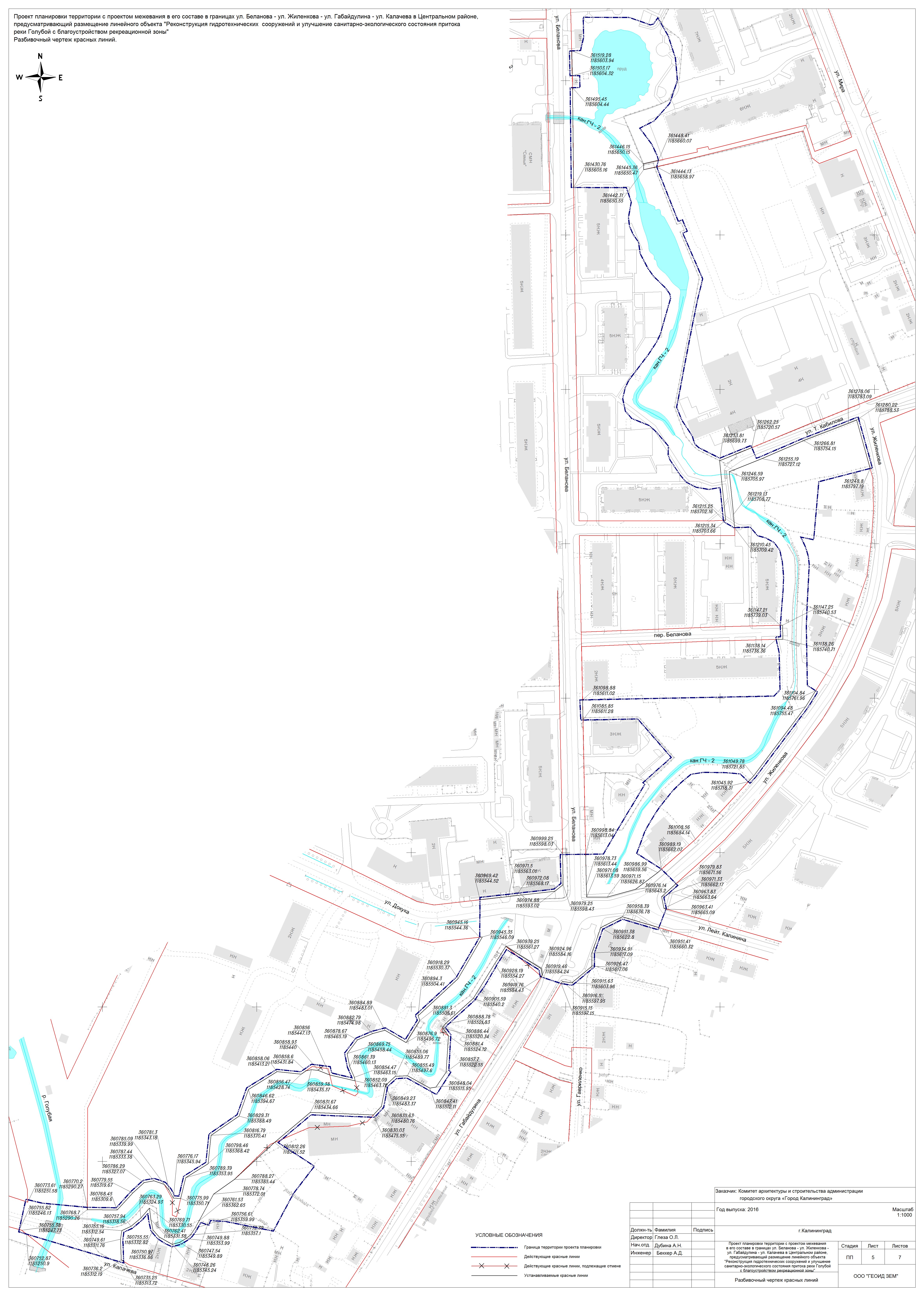 Проект планировки территории с проектом межевания в его составе в границах ул. Беланова – ул. Жиленкова – ул. Габайдулина – ул. Калачева в Центральном районе, предусматривающий размещение линейного объекта «Реконструкция гидротехнических сооружений и улучшение санитарно-экологического состояния притока реки Голубой с благоустройством рекреационной зоны» |