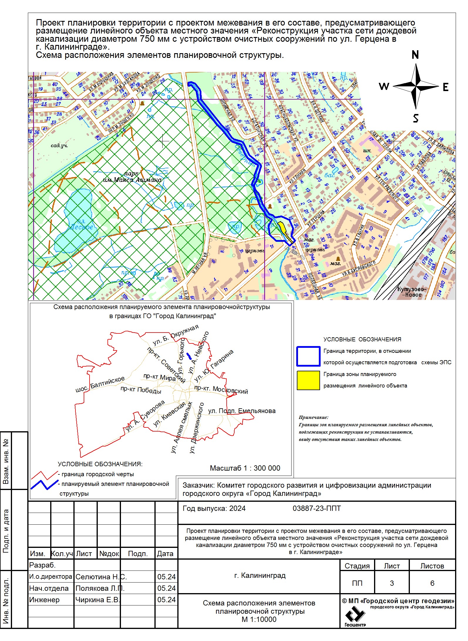 б/н. Проект планировки территории с проектом межевания в его составе, предусматривающий размещение линейного объекта местного значения «Реконструкция участка сети дождевой канализации диаметром 750 мм с устройством очистных сооружений по ул. Герцена в г. Калининграде» Центральная городская библиотека им. А.П. Чехова (г.Калининград, пр-кт Московский, 39),