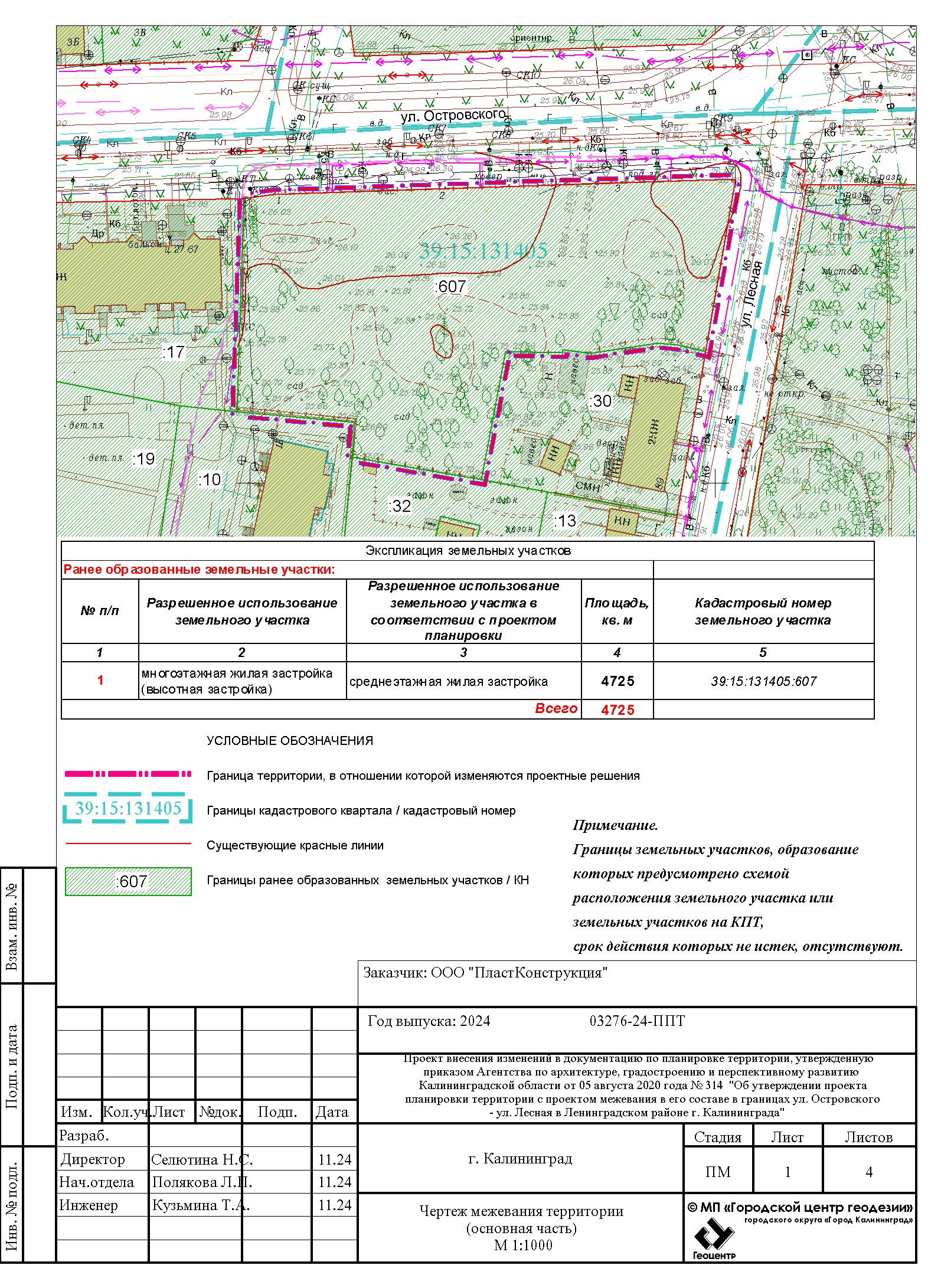 Проект внесения изменений в документацию по планировке территории, утвержденную приказом Агентства по архитектуре, градостроению и перспективному развитию Калининградской области от 05.08.2020 № 314 «Об утверждении проекта планировки территории с проектом межевания в его составе в границах ул. Островского – ул. Лесная в Ленинградском районе