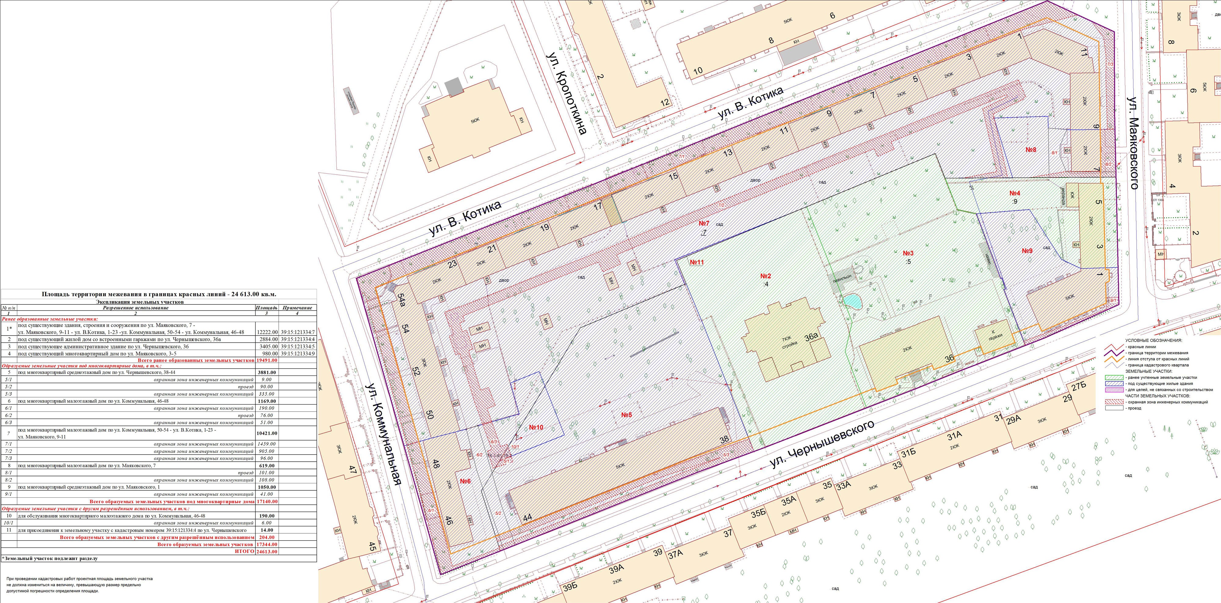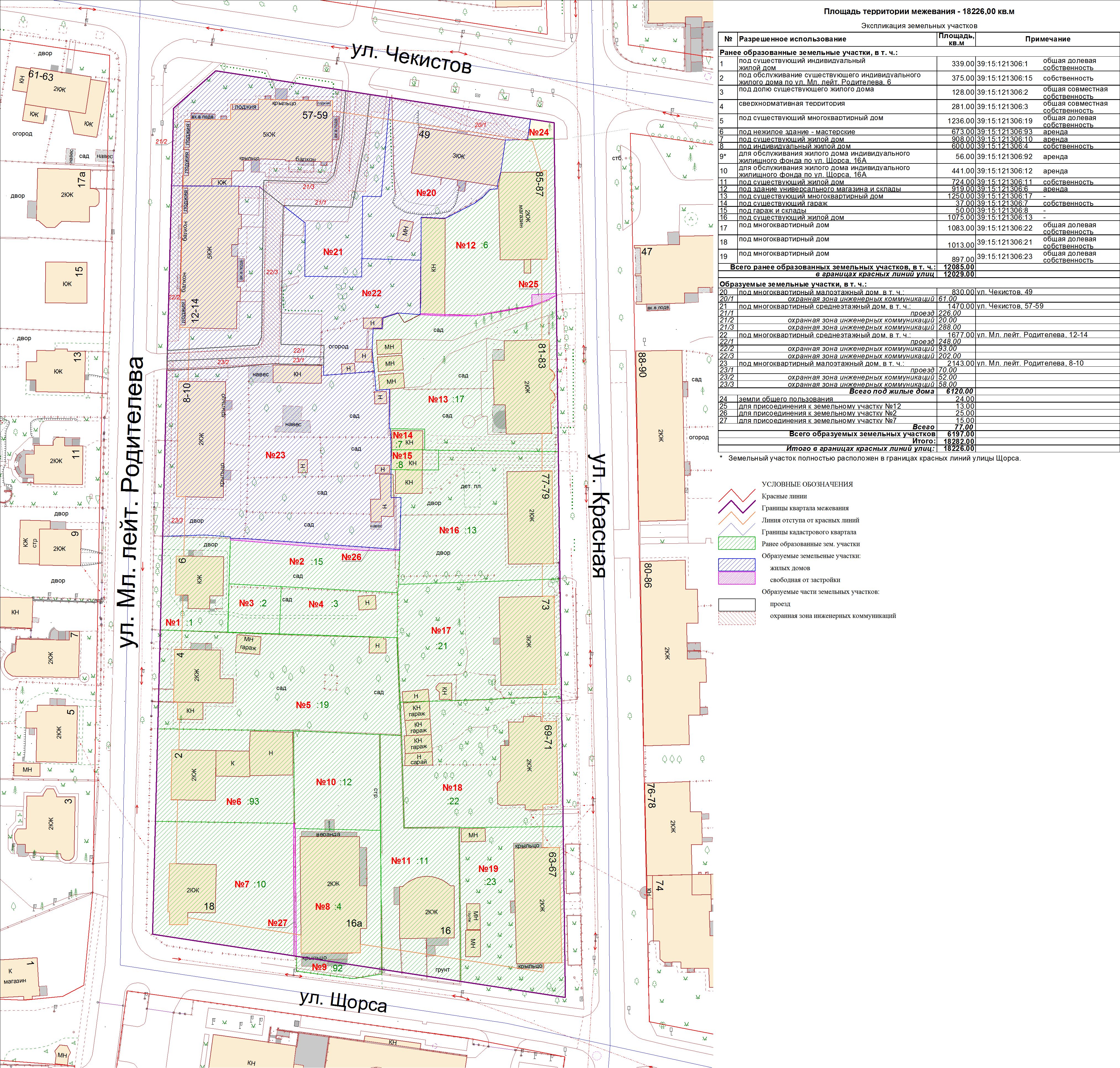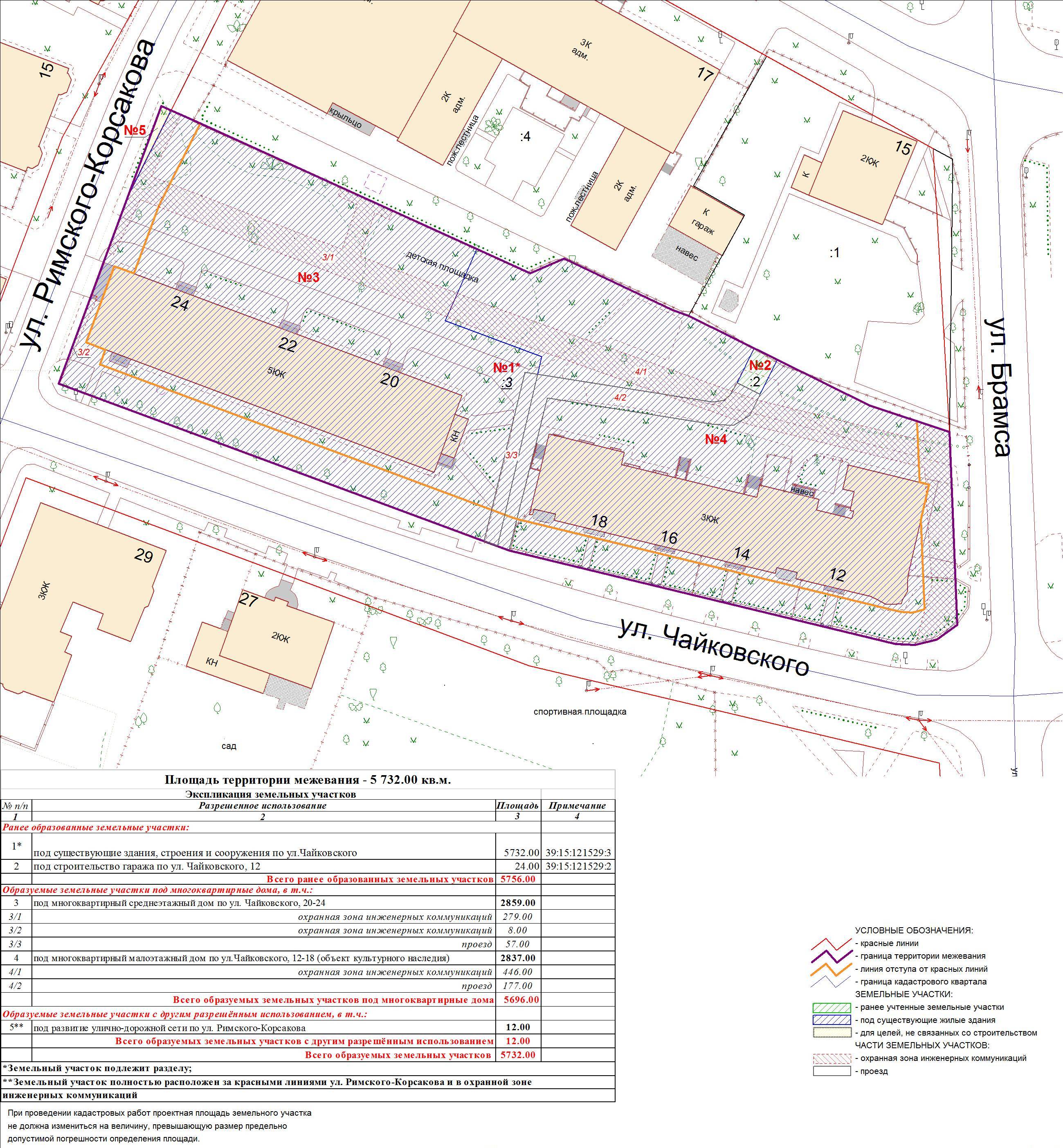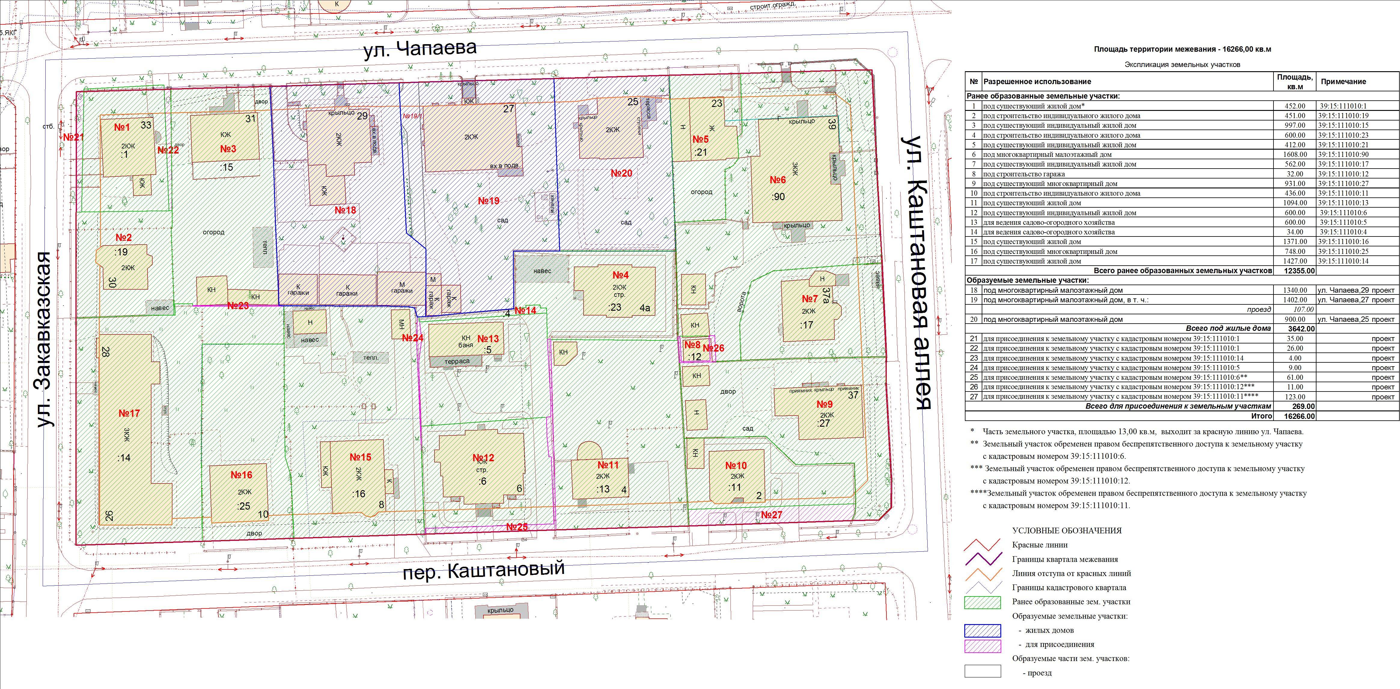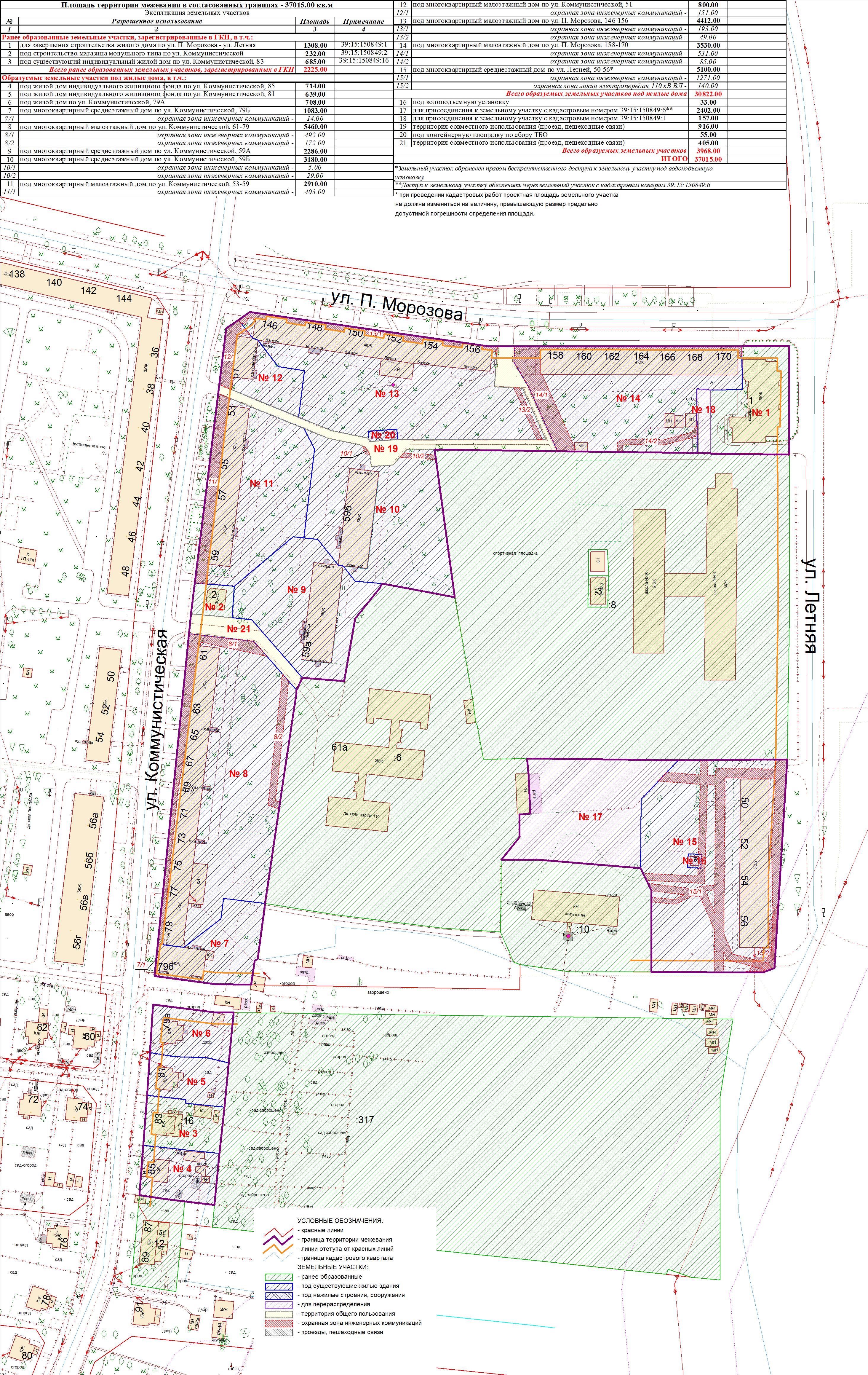 | Проект межевания территории в границах ул. Куйбышева – внутриквартального проезда – южной границы земельного участка с кадастровым номером 39:15:131931:77 по ул. Еловая аллея – пер. Куйбышева Ленинградского района города Калининграда | Оповещение Проект границ | Заключение | ||