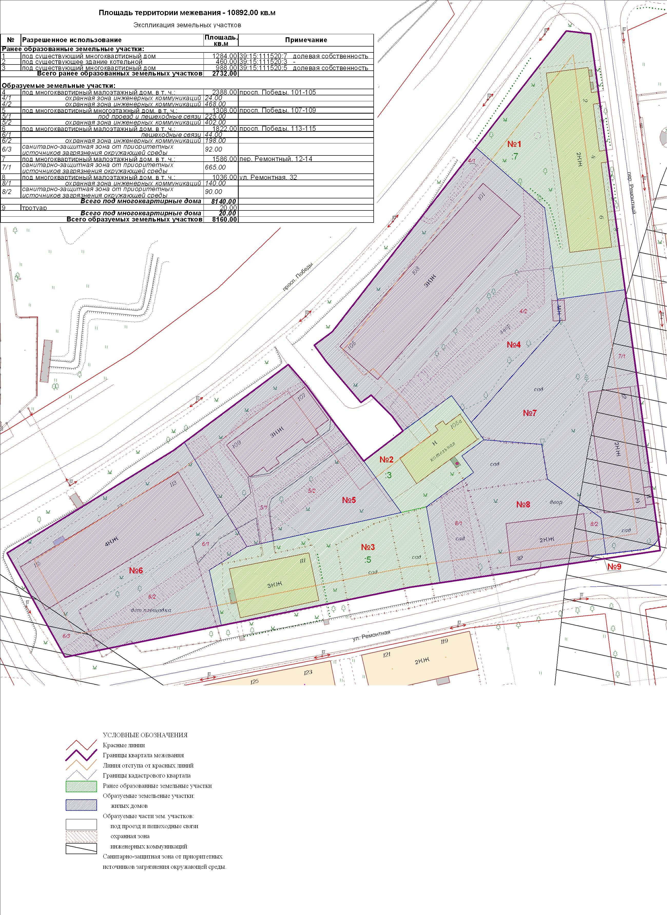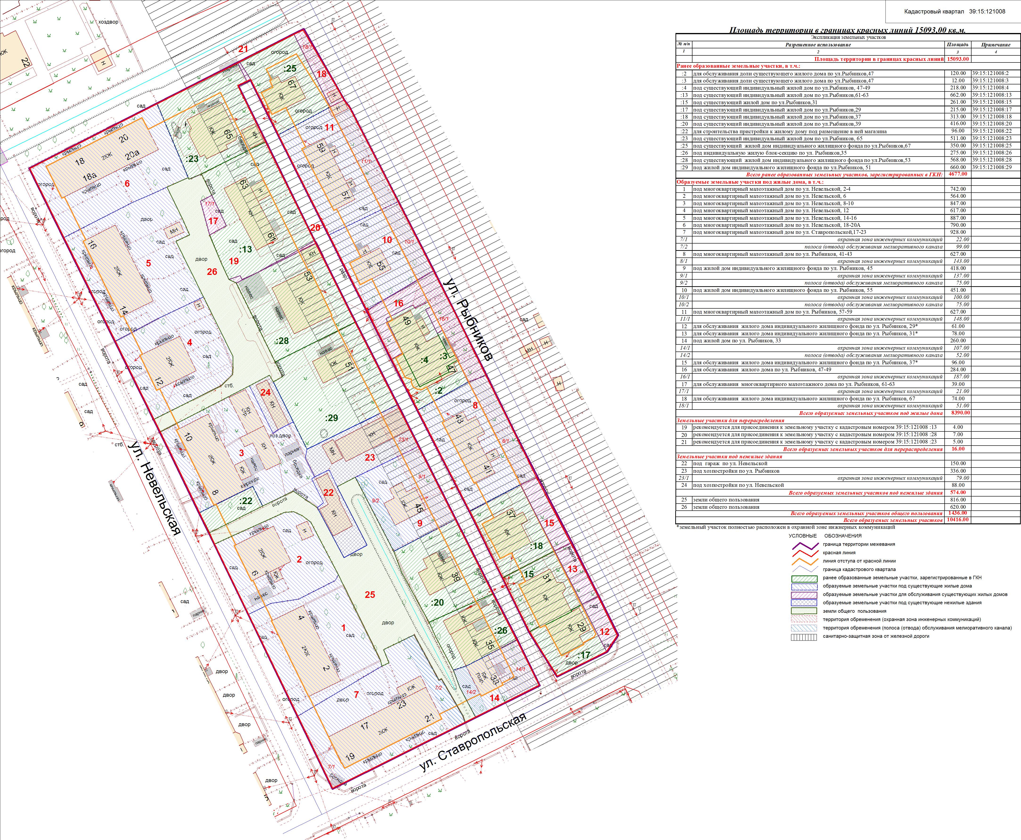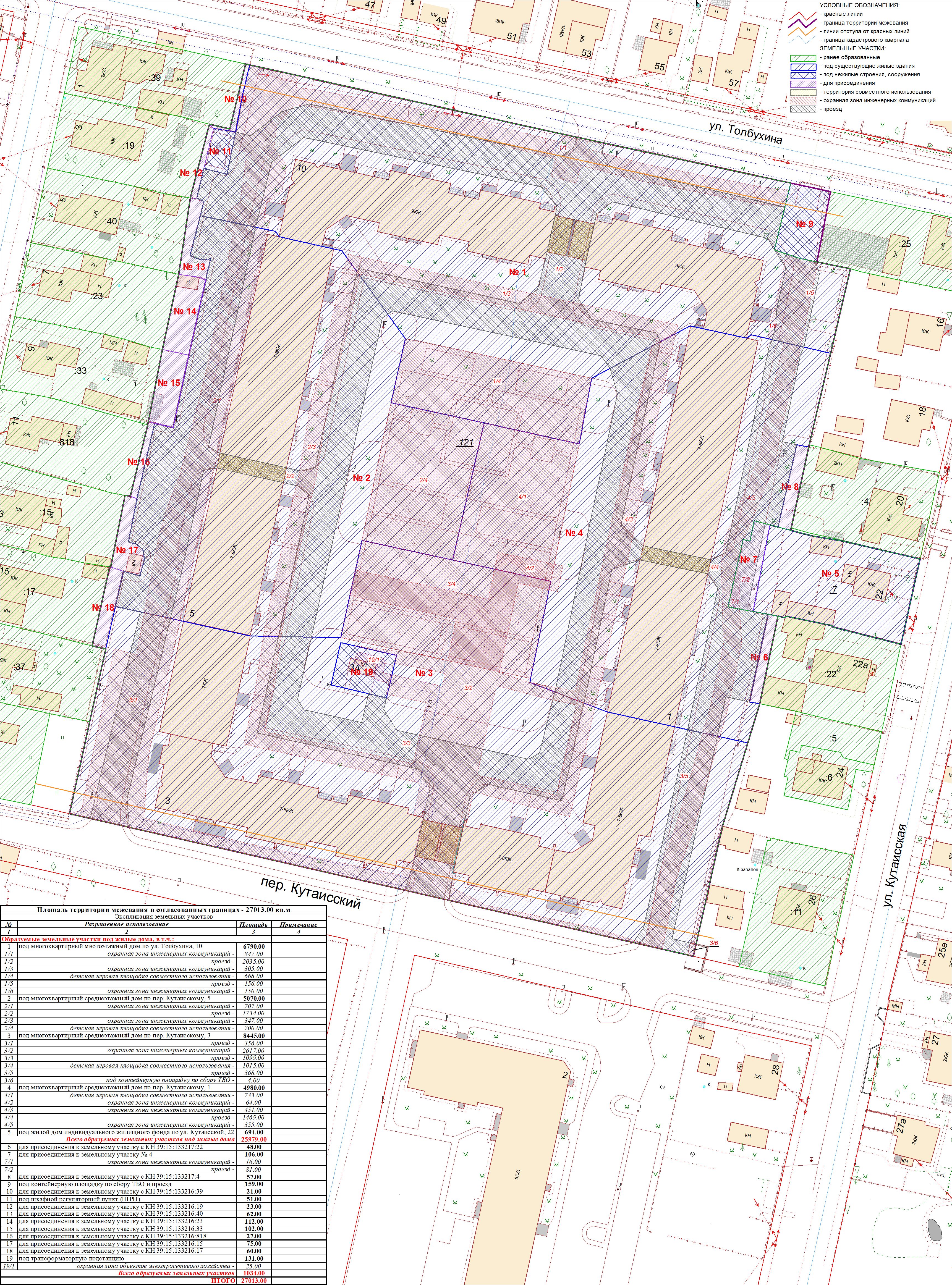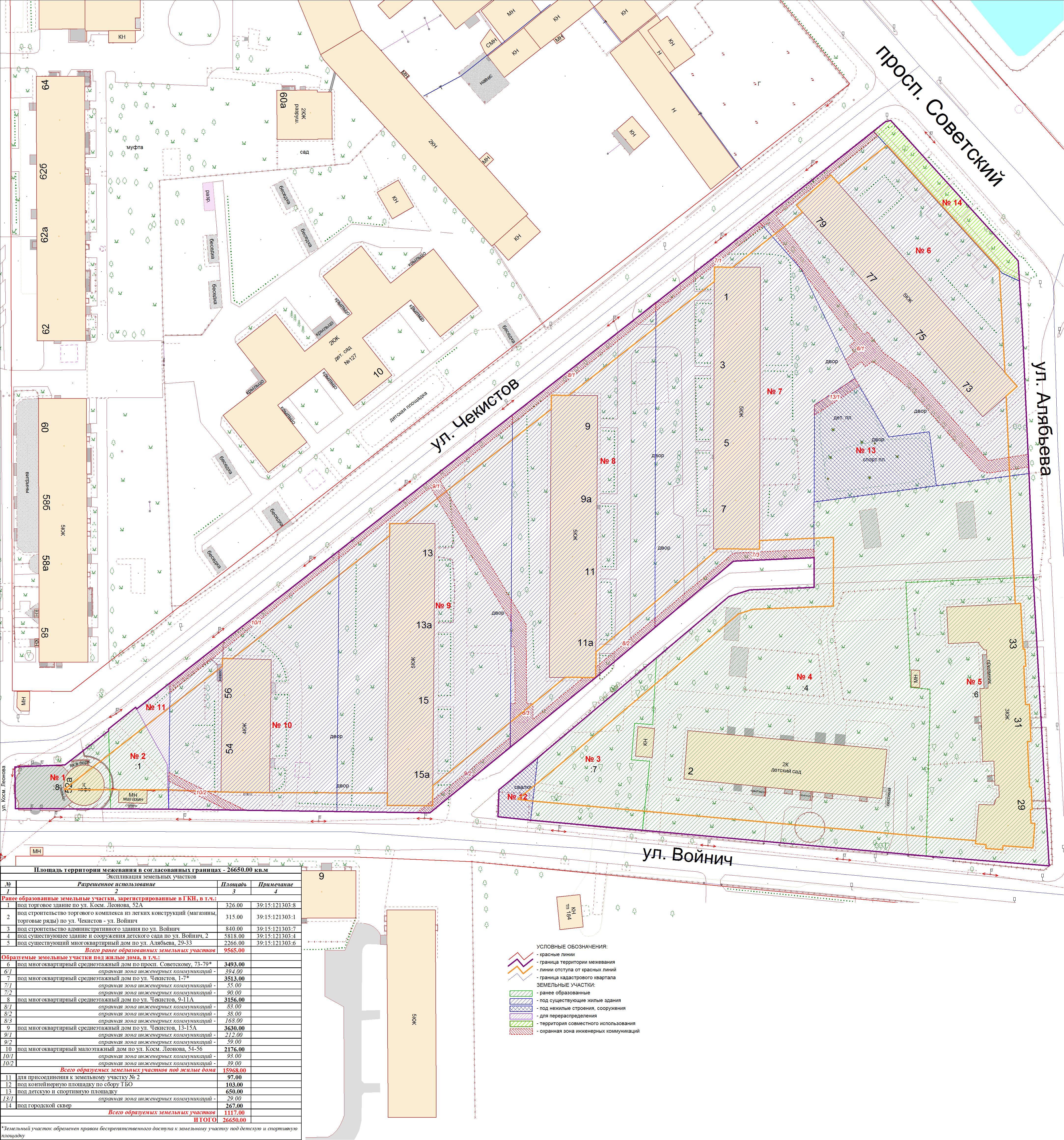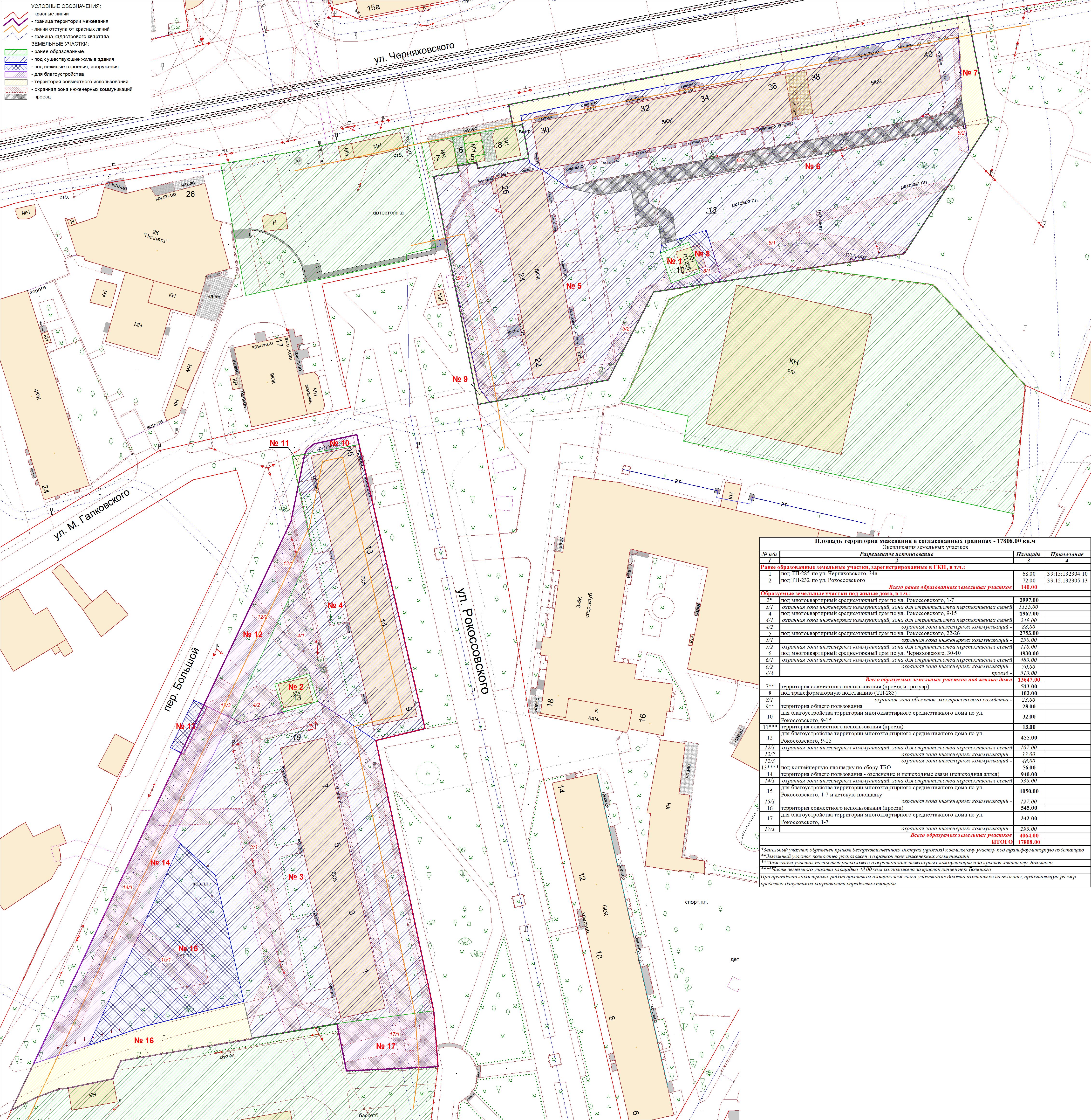 | Проект межевания территории в границах ул. Куйбышева – внутриквартального проезда – южной границы земельного участка с кадастровым номером 39:15:131931:77 по ул. Еловая аллея – пер. Куйбышева Ленинградского района города Калининграда | Оповещение Проект границ | Заключение | ||