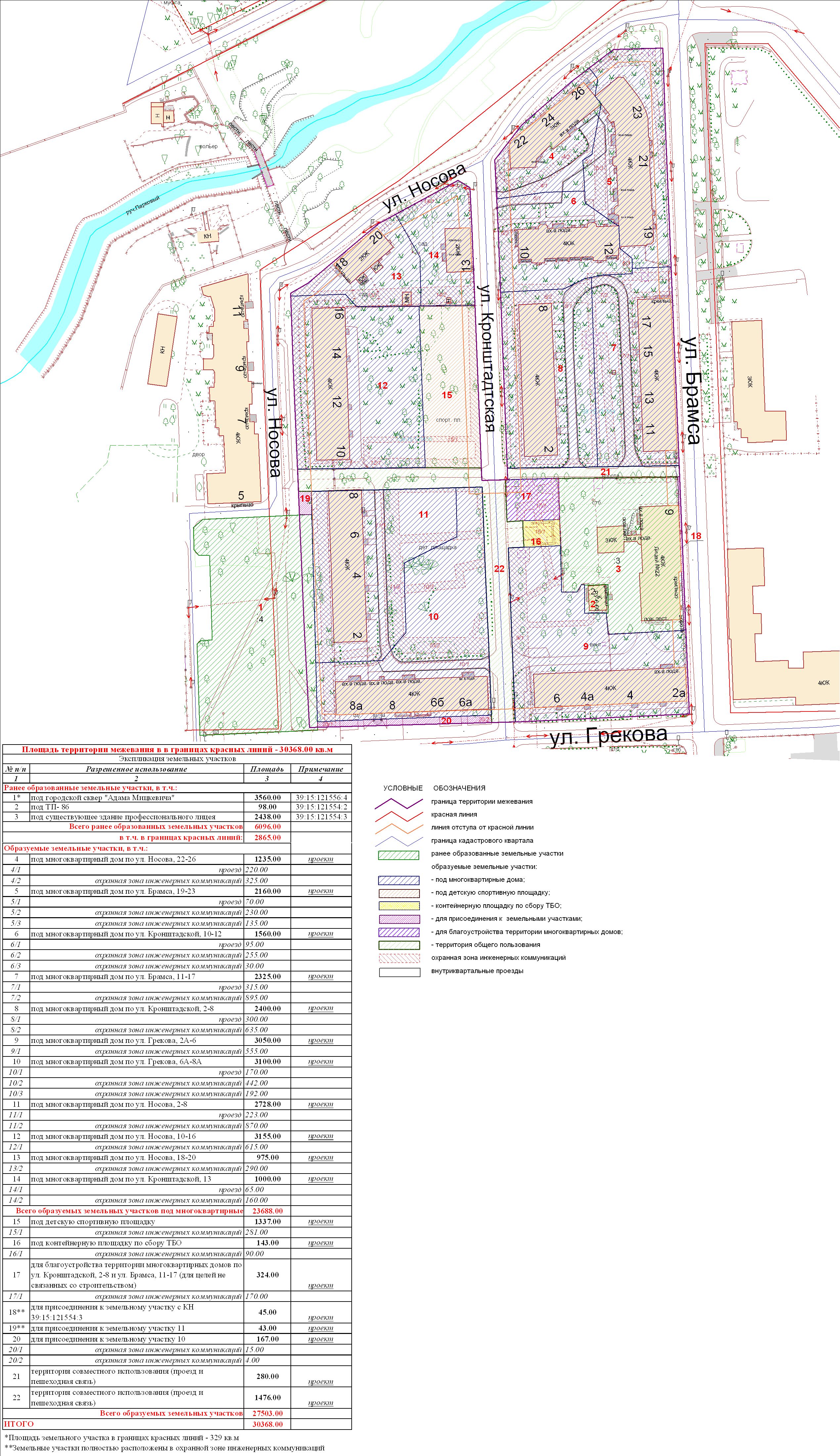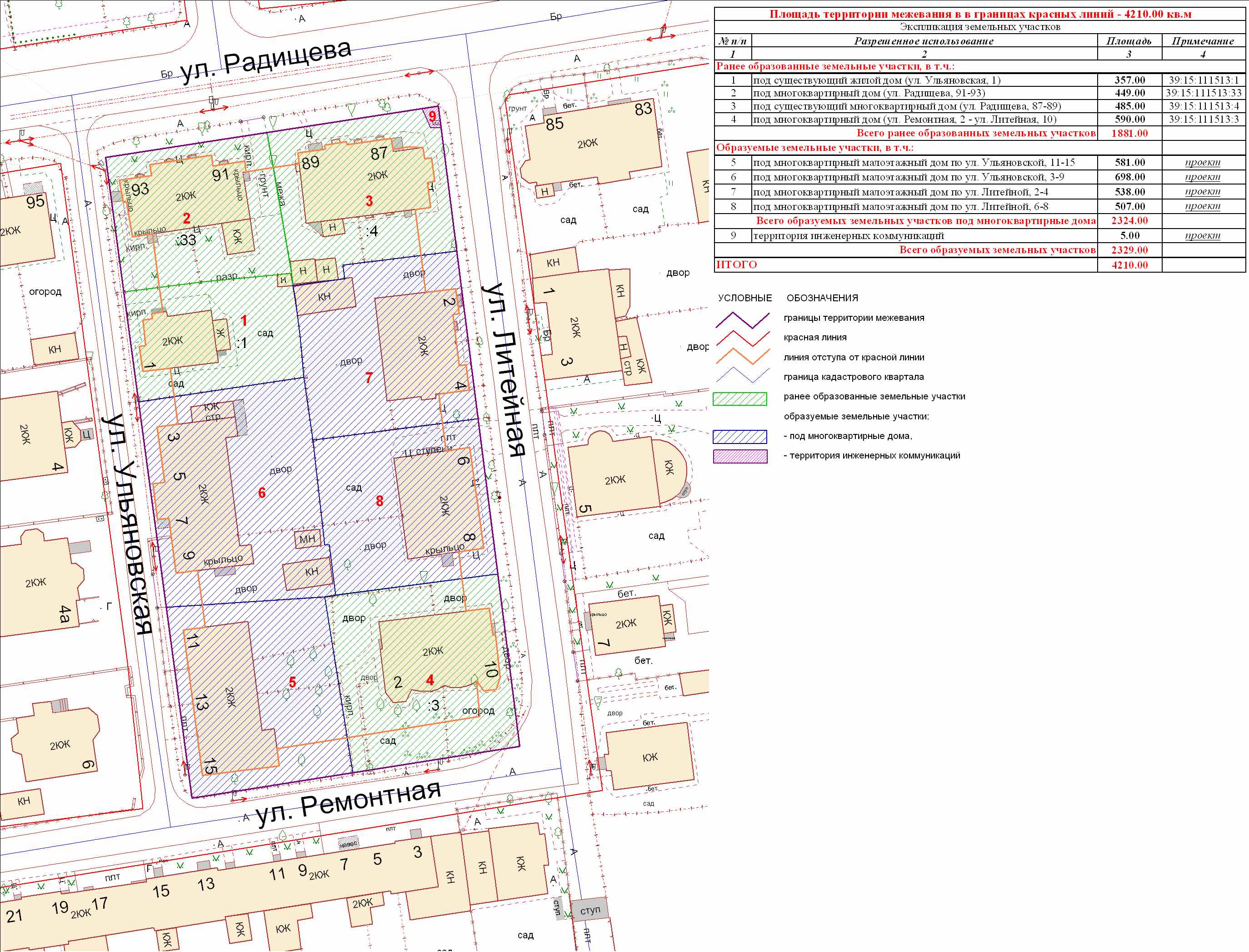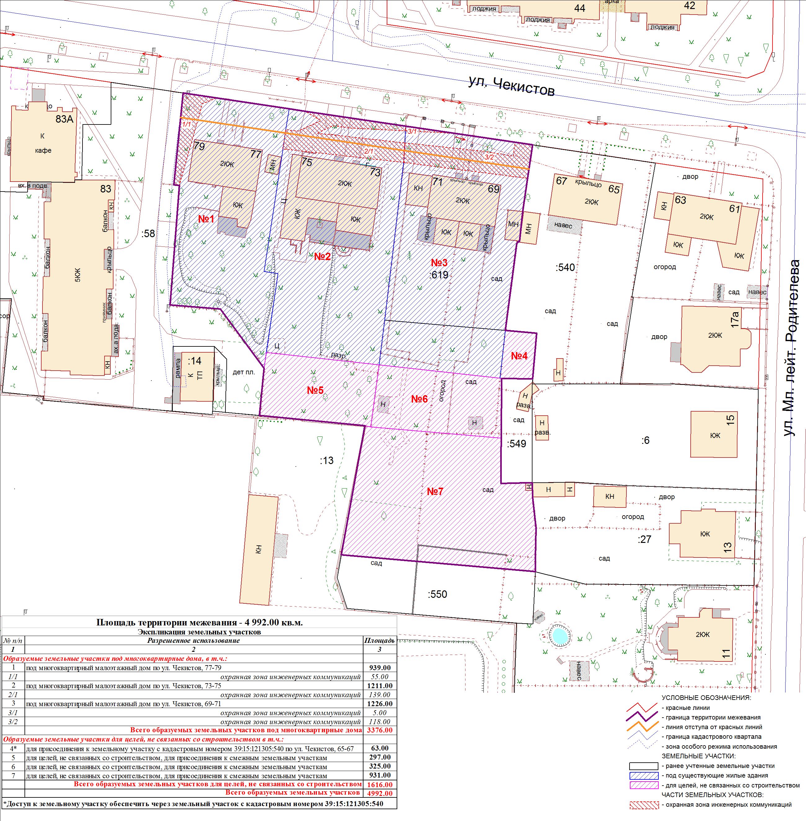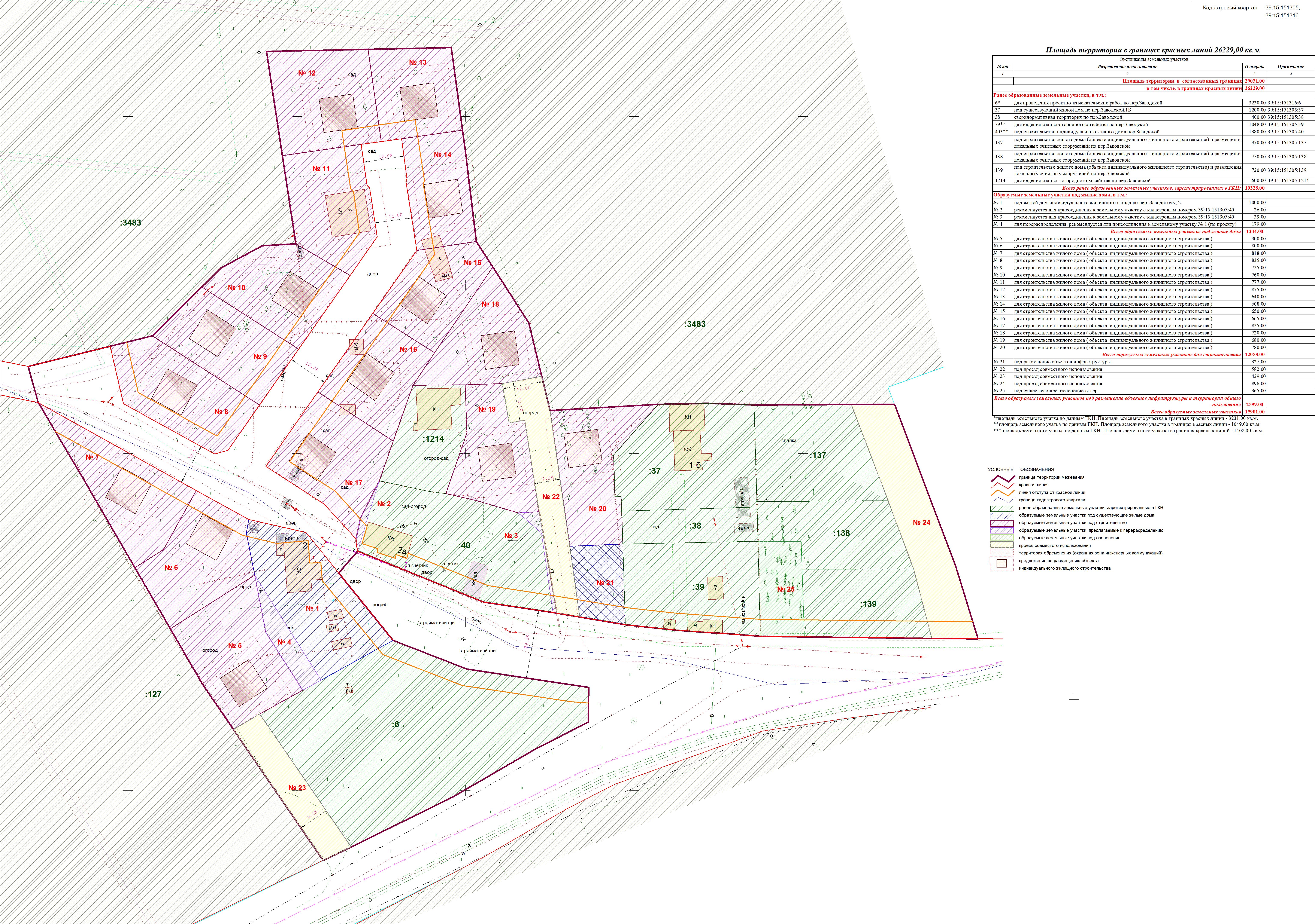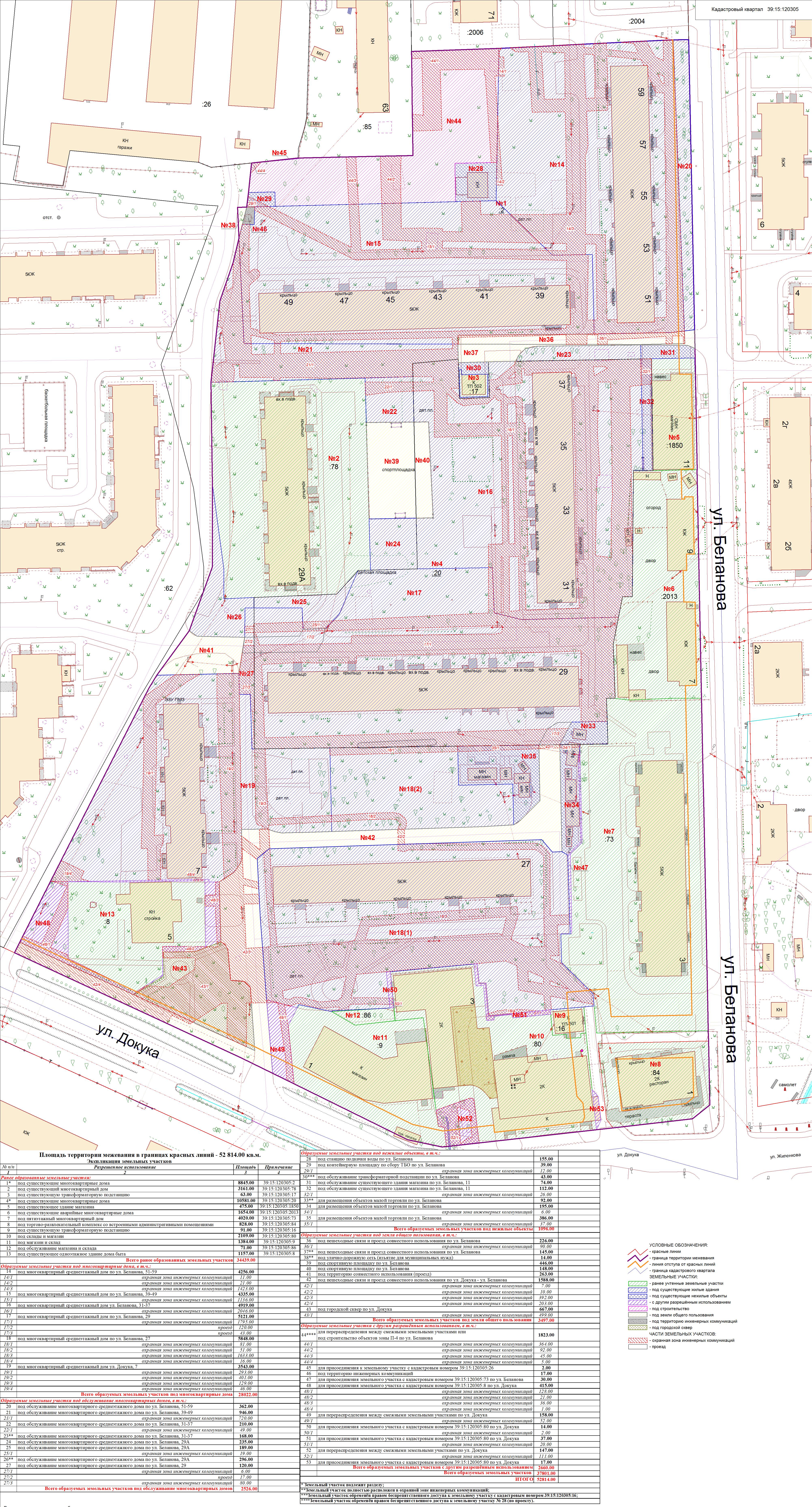 | Проект межевания территории в границах ул. Куйбышева – внутриквартального проезда – южной границы земельного участка с кадастровым номером 39:15:131931:77 по ул. Еловая аллея – пер. Куйбышева Ленинградского района города Калининграда | Оповещение Проект границ | Заключение | ||