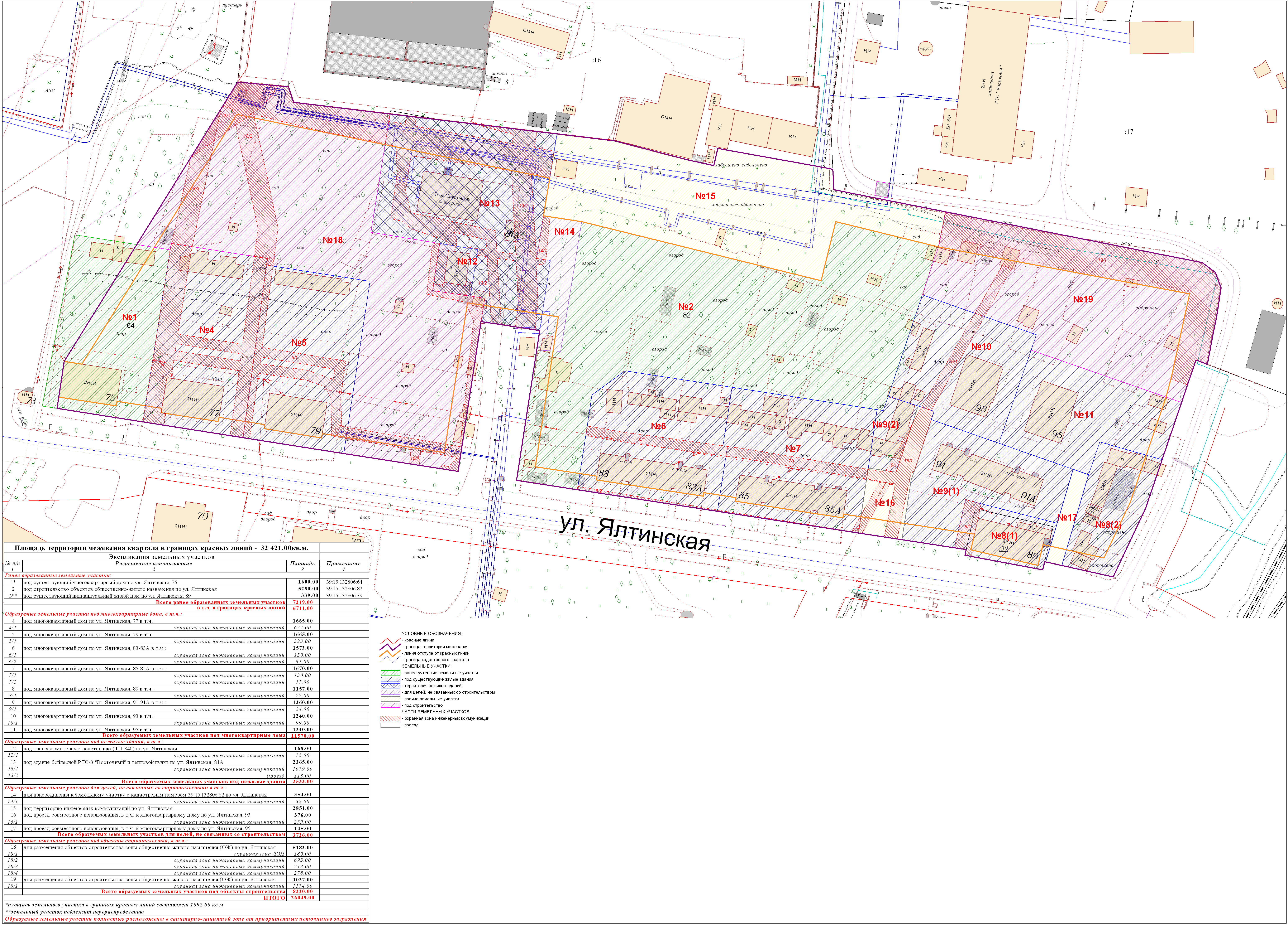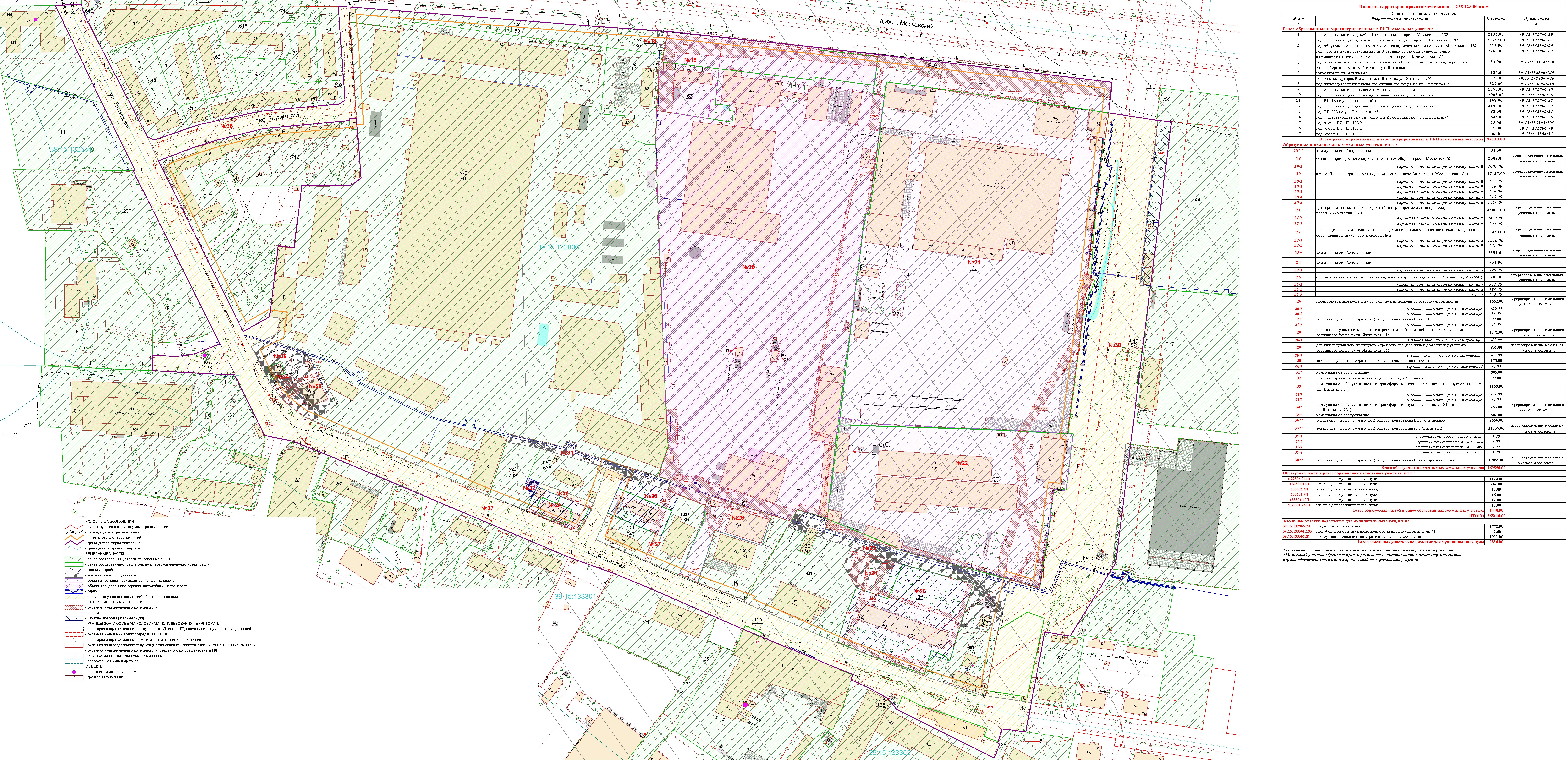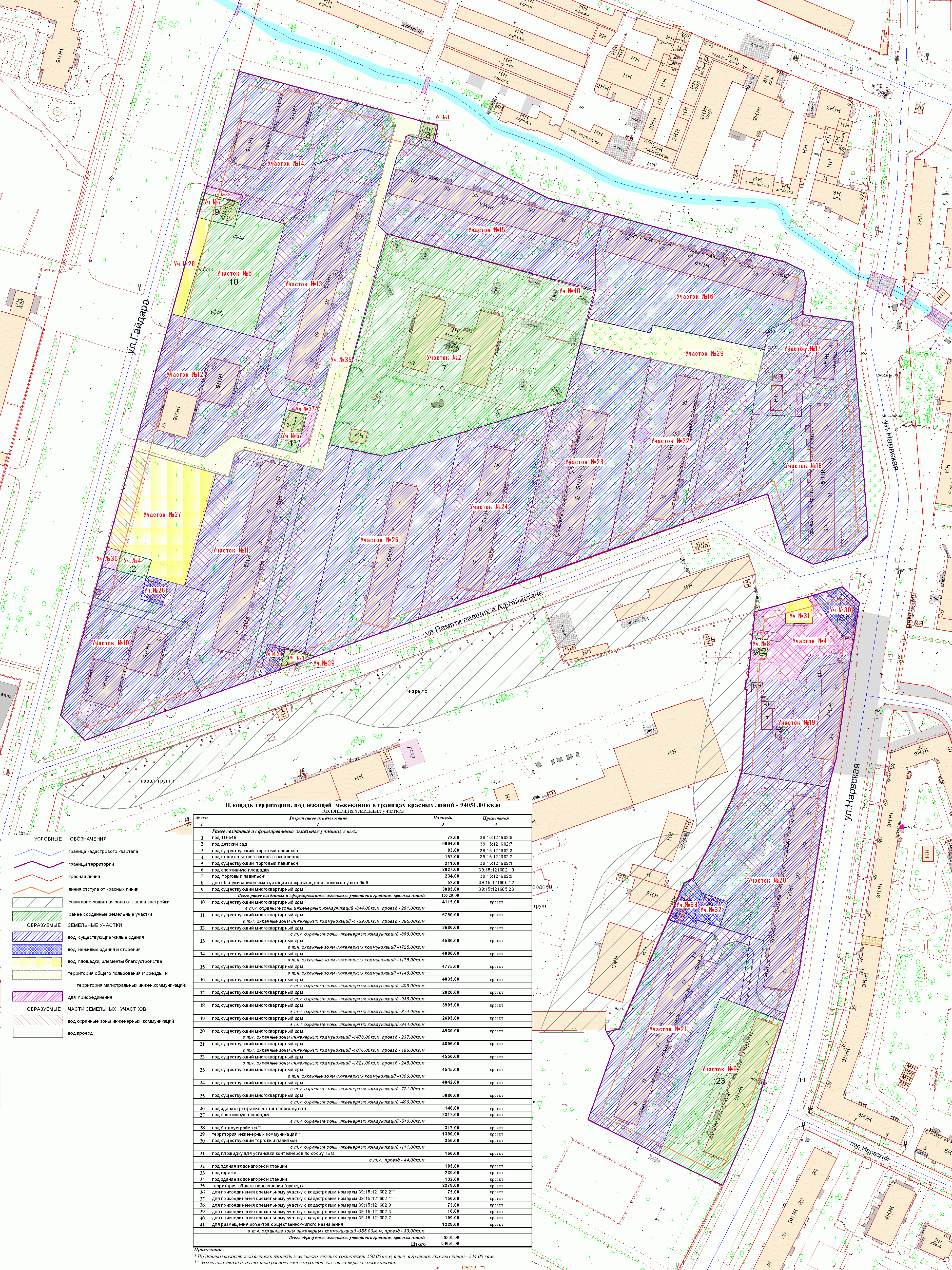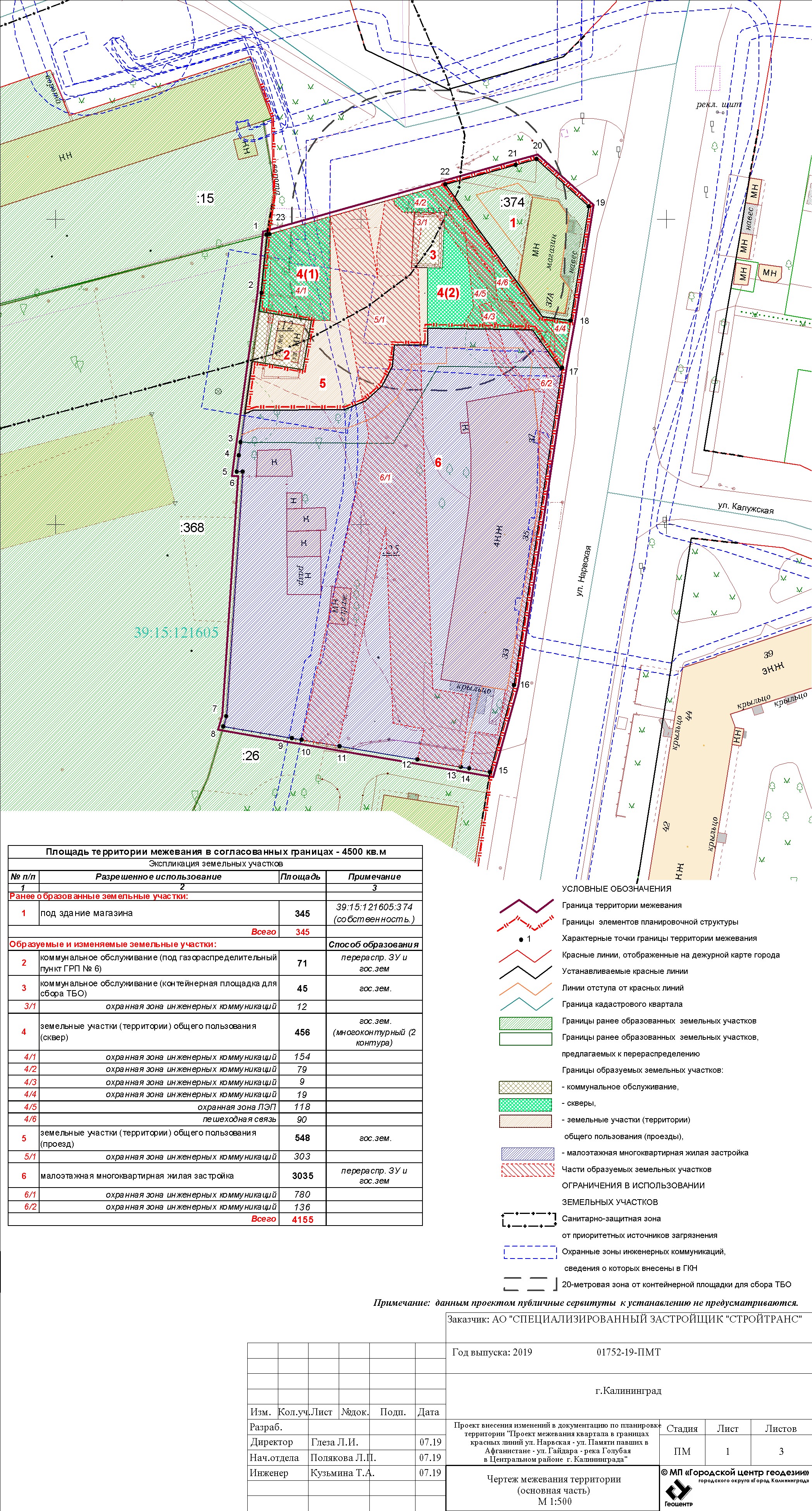 | Проект внесения изменений в документацию по планировке территории «Проект межевания квартала в границах красных линий ул. Нарвская – ул. Памяти павших в Афганистане – ул. Гайдара – река Голубая в Центральном районе г. Калининграда» | Публичные слушания назначены на 29 августа 2019 в 17:00 по адресу: г. Калининград, ул. Чайковского, 50-52, 2-й этаж, каб. 206 | Оповещение Постановление Основной чертеж Опорный план Пояснительная записка | Заключение | |