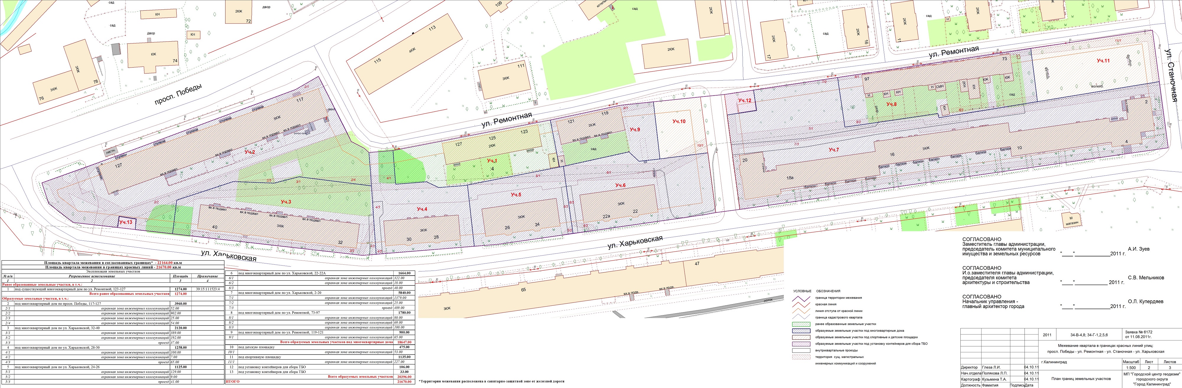 | 011 | Проект межевания квартала в границах красных линий улиц Черняховского – Сергеева – Пролетарская | 20.10.2010г. в 17.00 по адресу ул.Пролетарская 66а, актовый зал, МОУ СОШ №31 | Проект границ | Заключение |