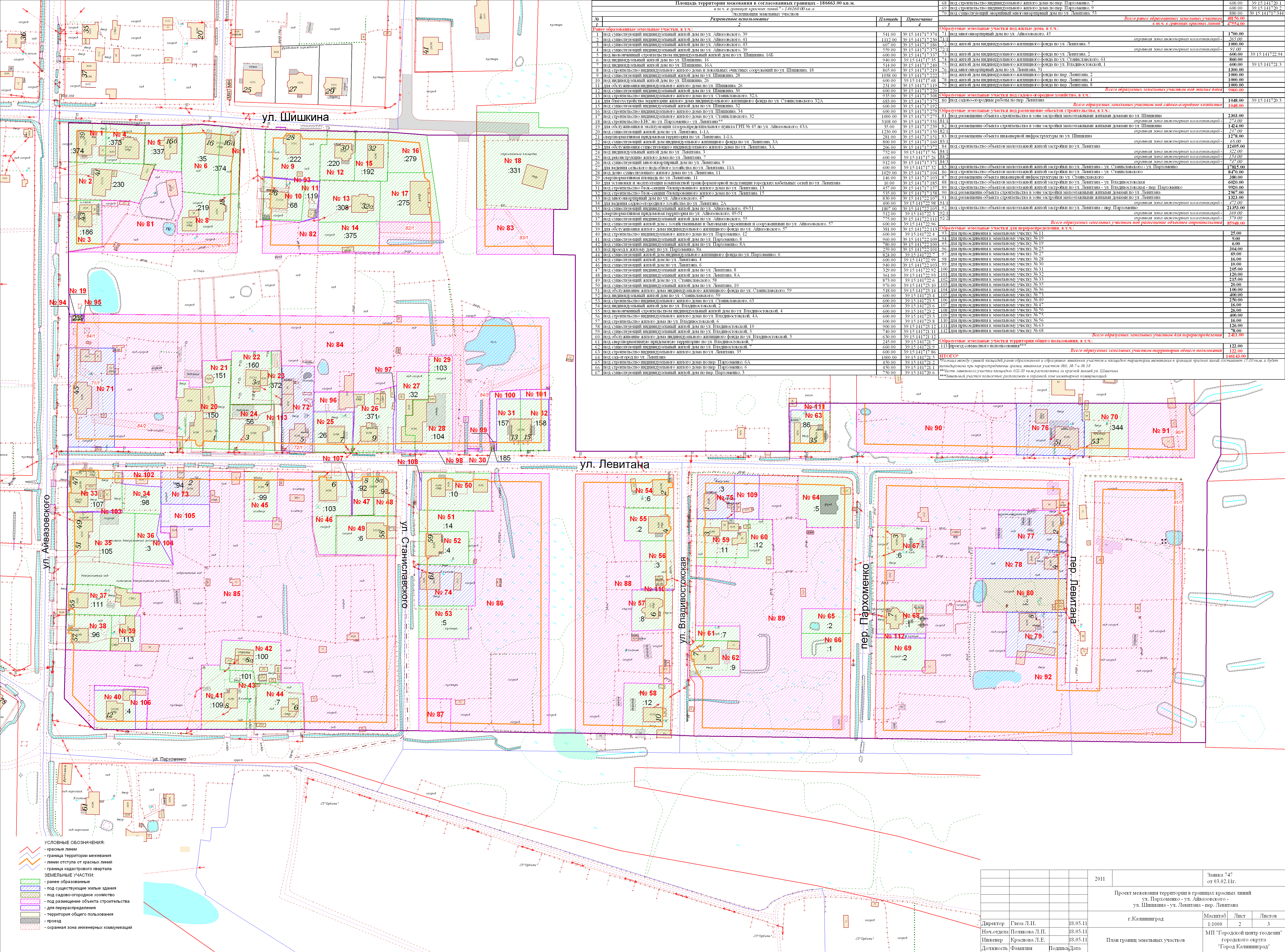| 183 | Проект межевания квартала в границах красных линий улиц Магнитогорская - Карташева - переулок Карташева - Лужская - Курильская | 01 июля 2011г., в 17.00 по адресу: г. Калининград, ул. Магнитогорская, 1, здание столовой, второй этаж | Проект границ | Заключение |