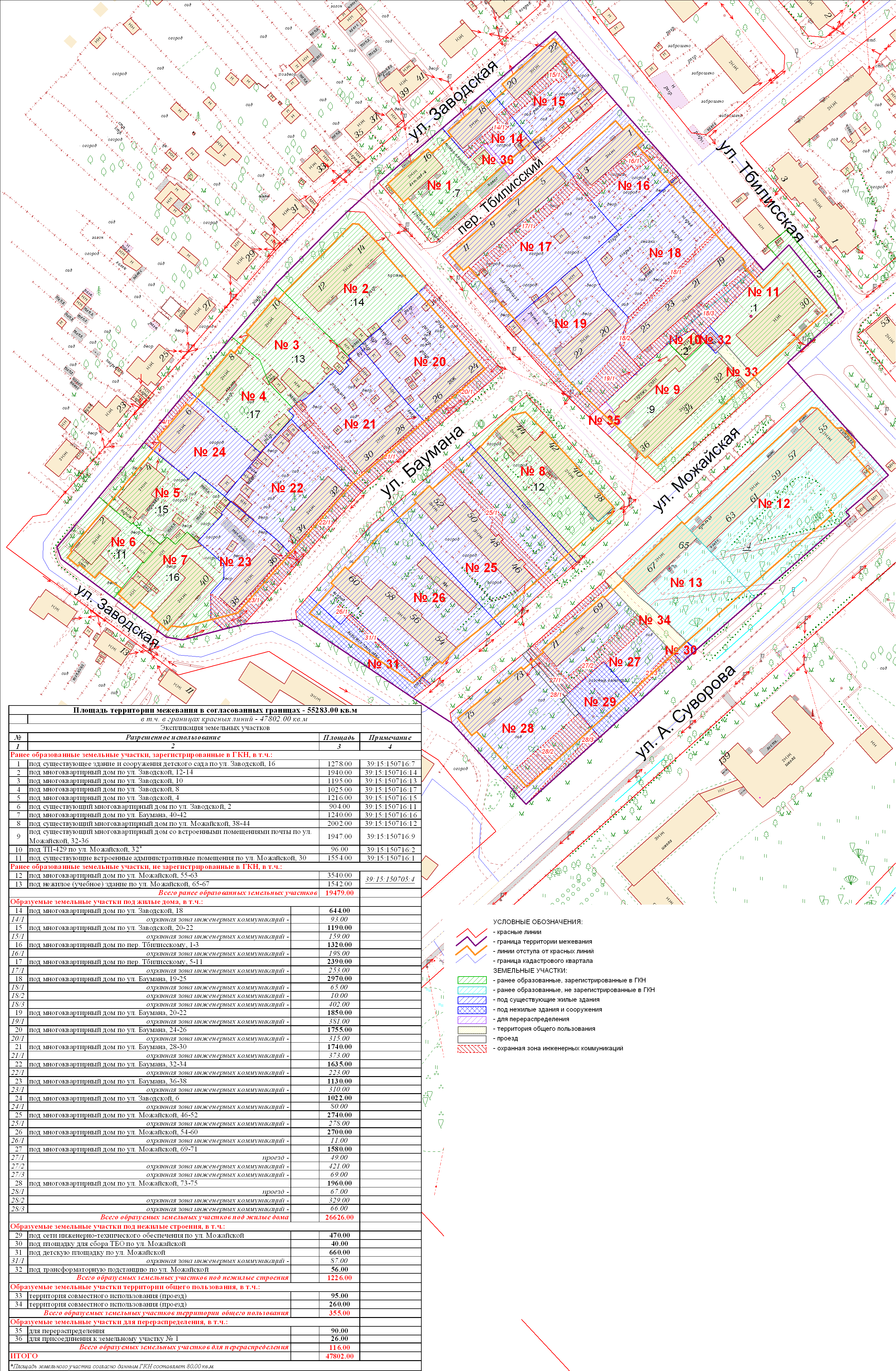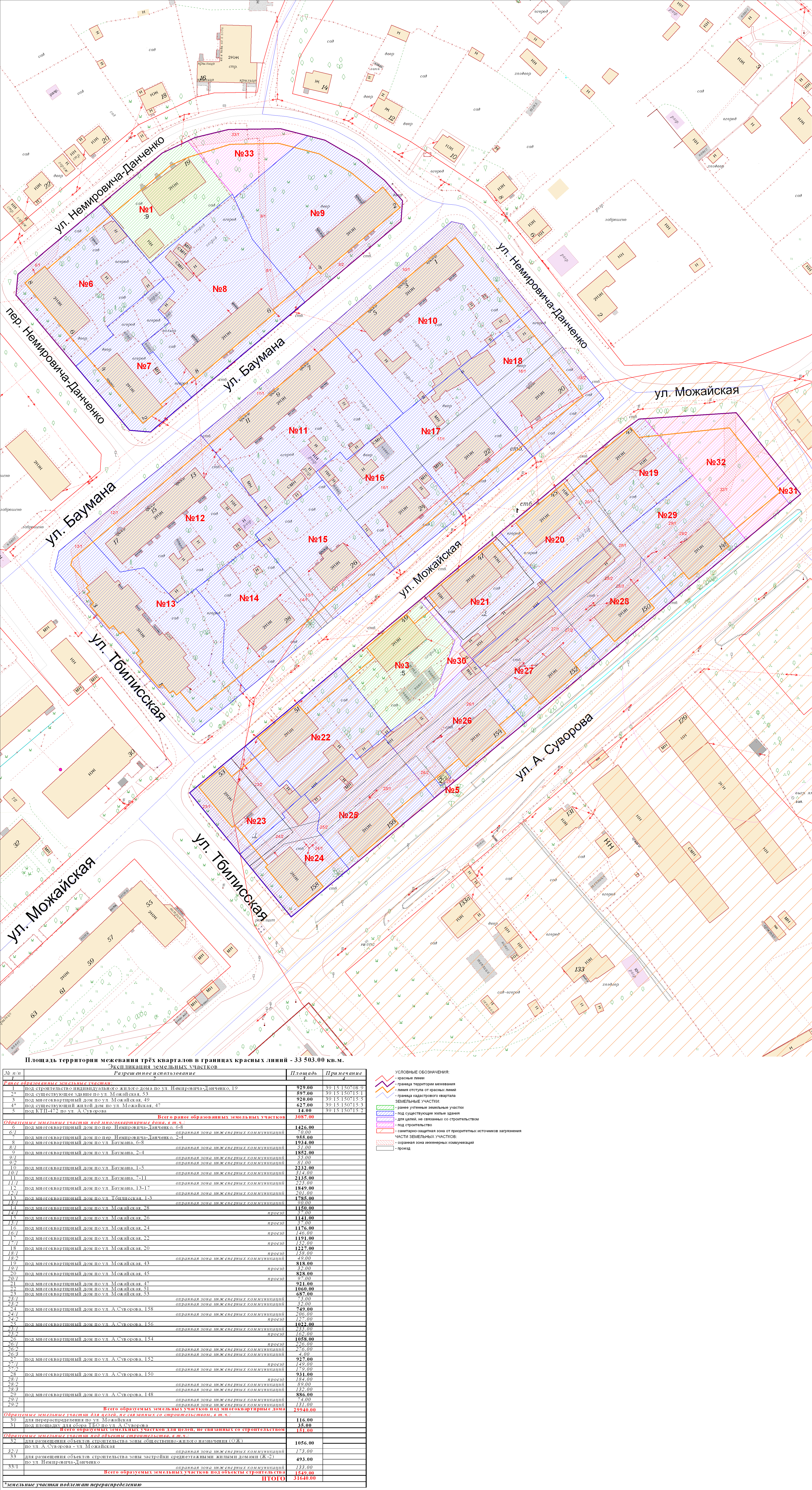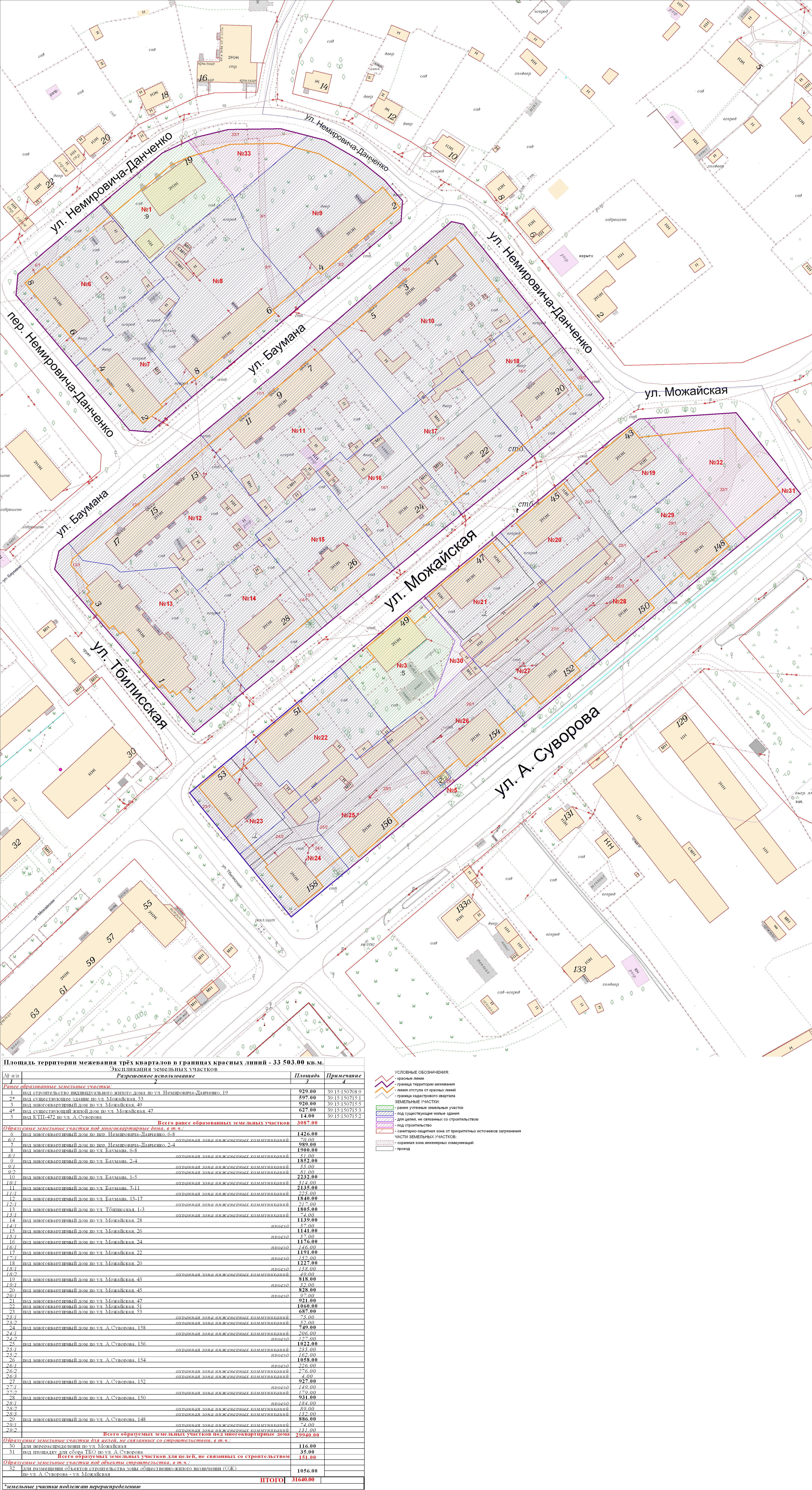 | 006, 166, 167 | Проект межевания трёх кварталов в границах красных линий ул. Немировича-Данченко – ул. Баумана – пер. Немировича-Данченко – ул. Тбилисская – ул. Можайская – ул. А.Суворова | Публичные слушания по проекту межевания квартала в границах красных линий улиц: Немировича-Данченко – Баумана – Можайская – Тбилисская – А. Суворова состоятся 02 ноября 2011 года в 17.00 в помещении МОУ СОШ №28 (ул. А. Суворова, 139а) | Проект границ Постановление о проведении публичных слушаний Протокол Проект границ откорректированный по итогам публичных слушаний | Заключение |