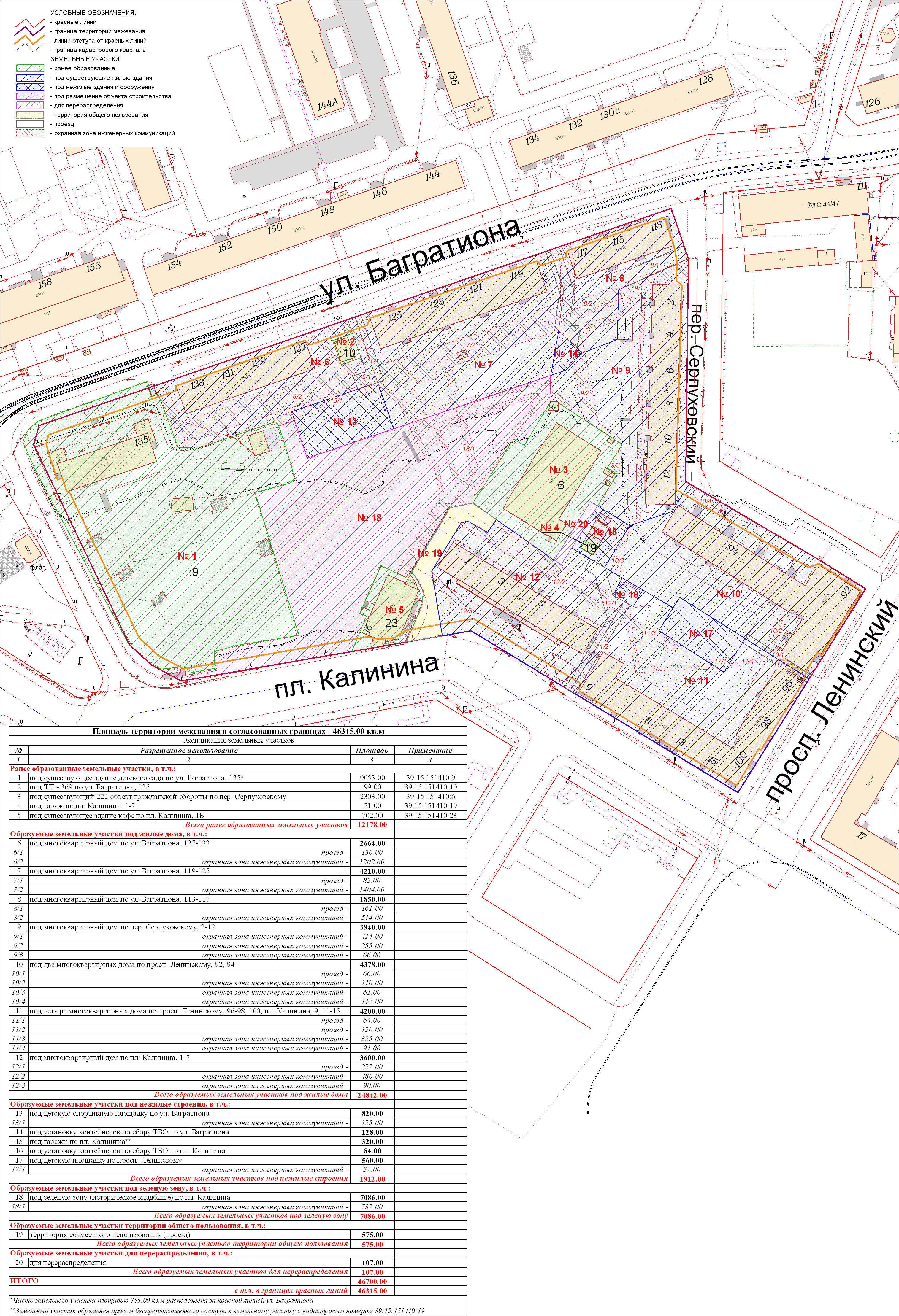 | 003 | Проект межевания квартала в границах красных линий улиц Багратиона-пер.Южный-Эльблонгская-Серпуховская Корректировка | 03 июня 2011 в 17.00 в помещении МАОУ лицей №17 по адресу: ул. Серпуховская, 28 | Проект границ Постановление о проведении публичных слушаний Протокол | Заключение |
