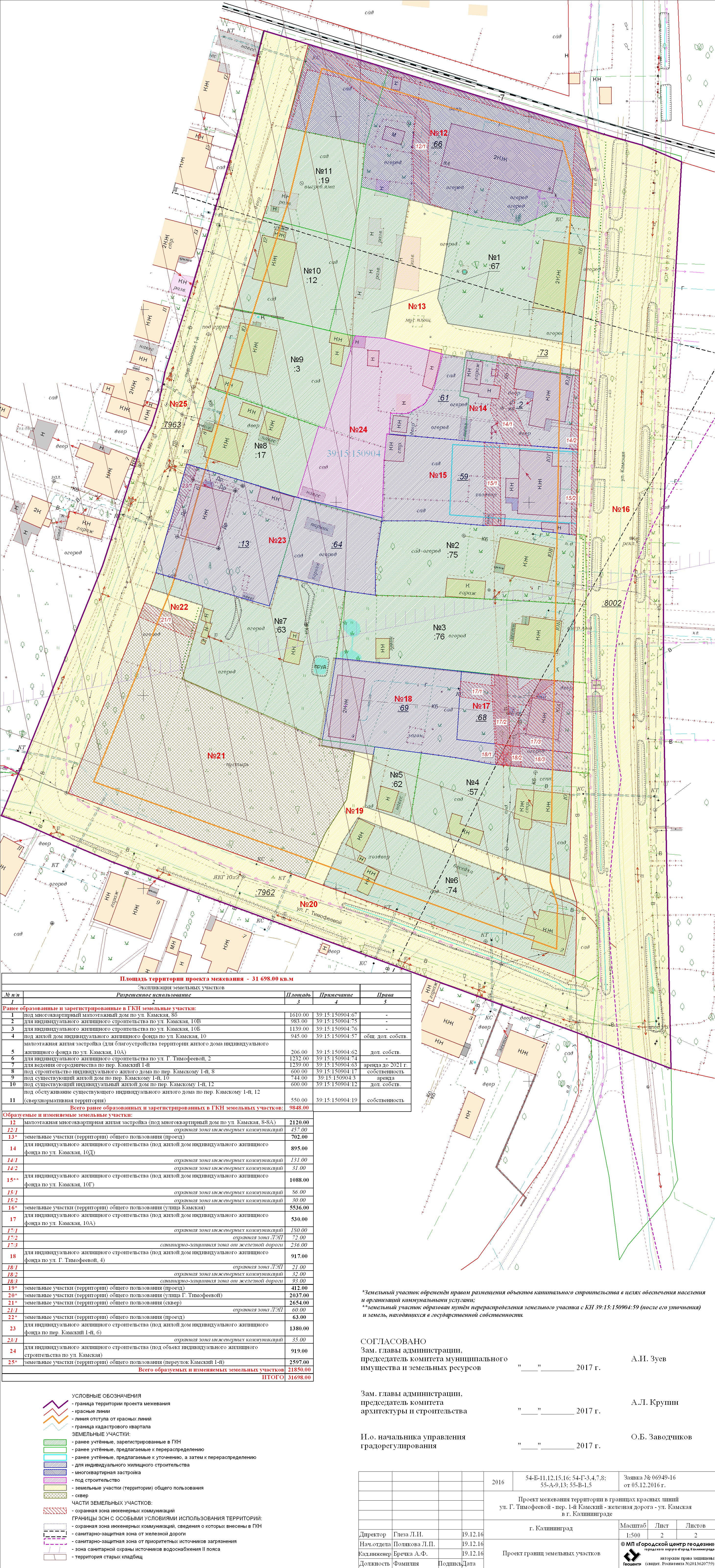 | Проект межевания территорий в границах красных линий ул. Г. Тимофеевой – пер. 1-й Камский – железная дорога – ул. Камская в г. Калининграде | Публичные слушания по проектам межевания территорий в границах красных линий ул. Г. Тимофеевой – пер. 1-й Камский – железная дорога – ул. Камская, состоятся 12.04.2017 в 17 час. 30 мин. по адресу г. Калининград, ул. Октябрьская, 79, каб. 211 (административное здание). | Проект границ | Заключение | |
