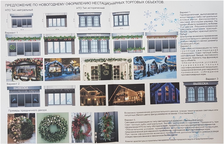 Уважаемые руководители предприятий торговли, общественного питания и бытового обслуживания!В целях создания жителям города и гостям праздничного новогоднего настроения предлагаем оформить ваши предприятия в соответствии с концепцией, разработанной главным архитектором города Калининграда.