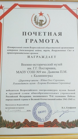 Военно-исторический музей им. Г. Г. Постарнака школы № 9 им. Дьякова П.М. стал победителем Всероссийского смотра-конкурса музеев боевой и трудовой славы общеобразовательных учреждений Российской Федерации.