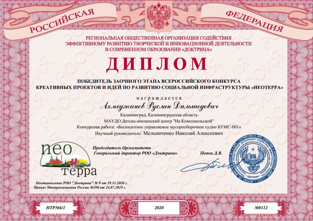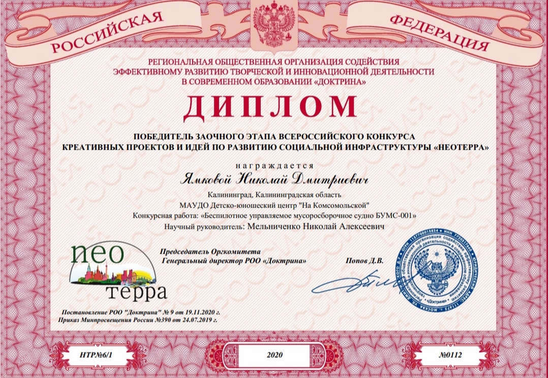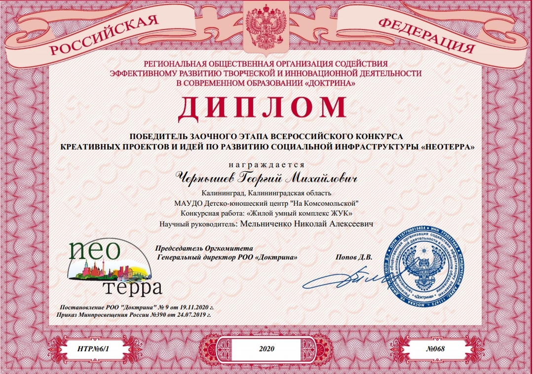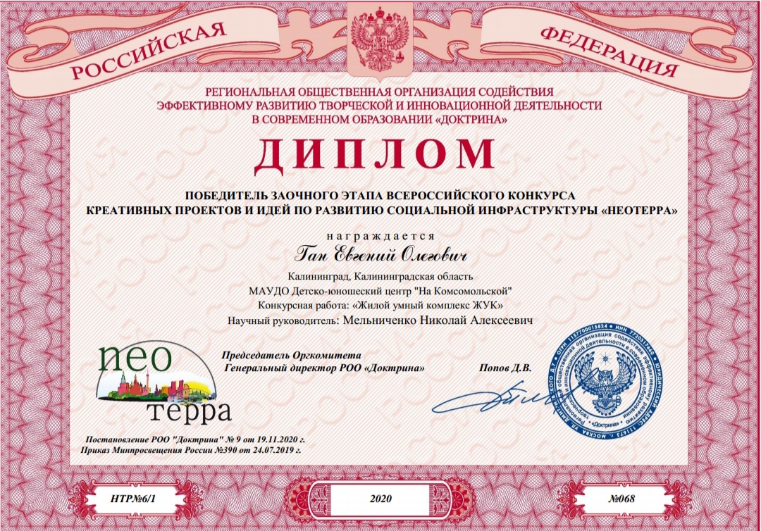 Победителями заочного этапа Всероссийского конкурса креативных проектов и идей по развитию социальной инфраструктуры «НЕОТЕРРА» стали обучающиеся МАОУ ДЮЦ «На Комсомольской»: Ган Евгений, Ямковой Николай, Чернышев Георгий, Ахмеджанов Руслан (руководитель Мельниченко Н. А., студия технического моделирования «ТехУспех»). Данная победа дает возможность ребятам принять участие во Всероссийской конференции (21.12.2020 - 23.12.2020, в дистанционном формате) для представления доклада с презентацией и защиты результатов своих исследований перед экспертными советами на секциях Конференции.