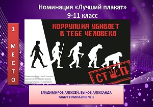 Конкурс проводится по двум номинациям («Лучший плакат» и «Лучший видеоролик») на тему «Вместе против коррупции!» и по трем возрастным категориям (5–6 классы, 7–8 классы и 9–11 классы).