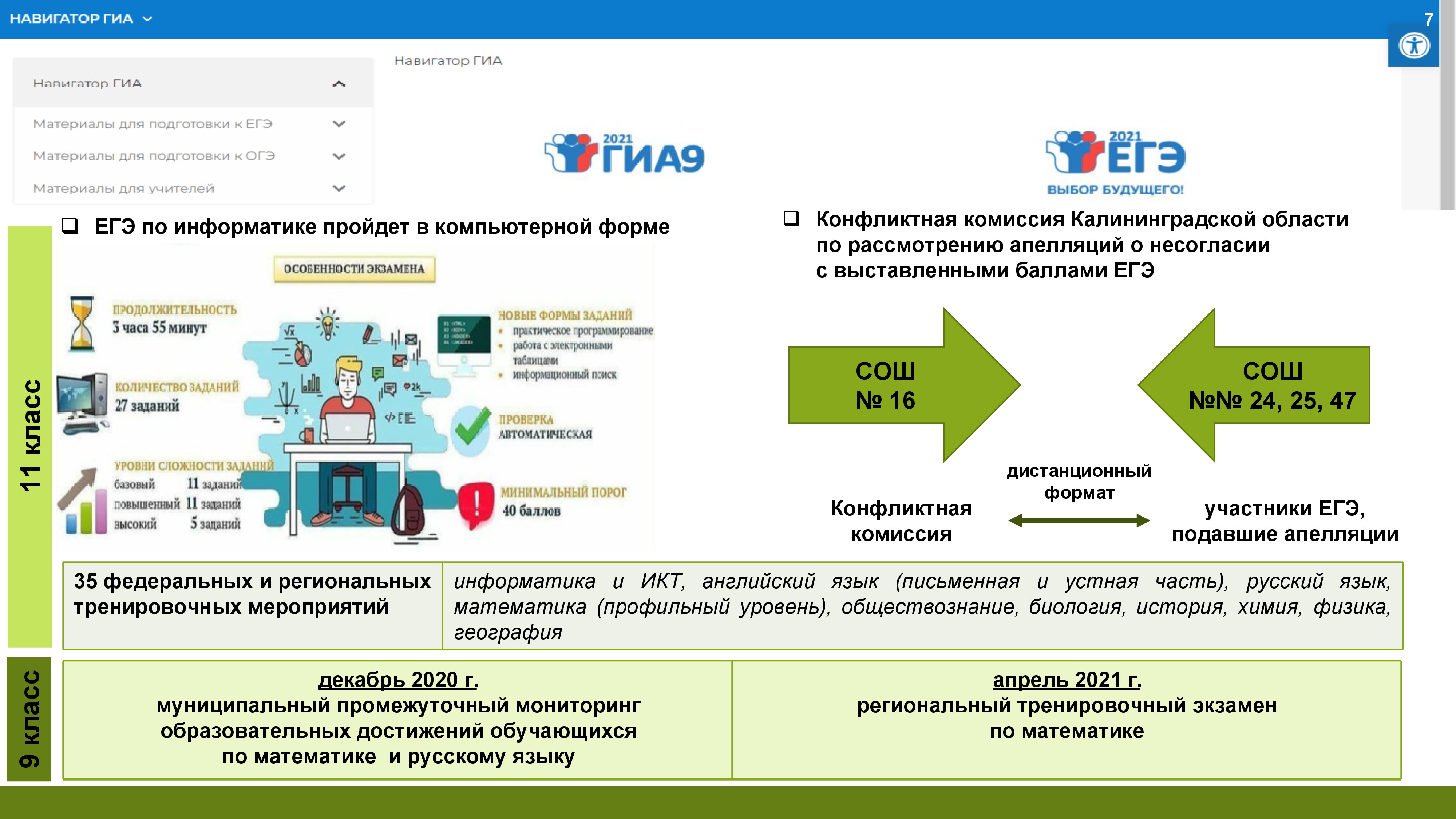 Итоговая аттестация в 9 классах (ГИА-9) проводится в формах основного государственного экзамена (ОГЭ) или государственного выпускного экзамена (ГВЭ) только по двум обязательным предметам: русскому языку и математике. Аттестаты об основном общем образовании будут выданы на основании результатов ГИА-9 по этим предметам. Участники с ОВЗ, дети-инвалиды и инвалиды могут по желанию пройти итоговую аттестацию только по одному из обязательных предметов. Для проведения ГИА-9 будет организована работа 28 пунктов проведения экзаменов и 6 пунктов на дому для детей с ОВЗ. В этом году учебные предметы по выбору девятиклассники сдавать не будут, вместо этих экзаменов в период с 18 по 21 мая 2021 года девятиклассники напишут в своей школе итоговую контрольную работу по одному учебному предмету. Заявление о выборе предмета учащиеся подали до 30 апреля. Результаты итоговой контрольной работы не влияют на получение аттестата, но могут быть использованы при приеме в профильные 10-е классы.